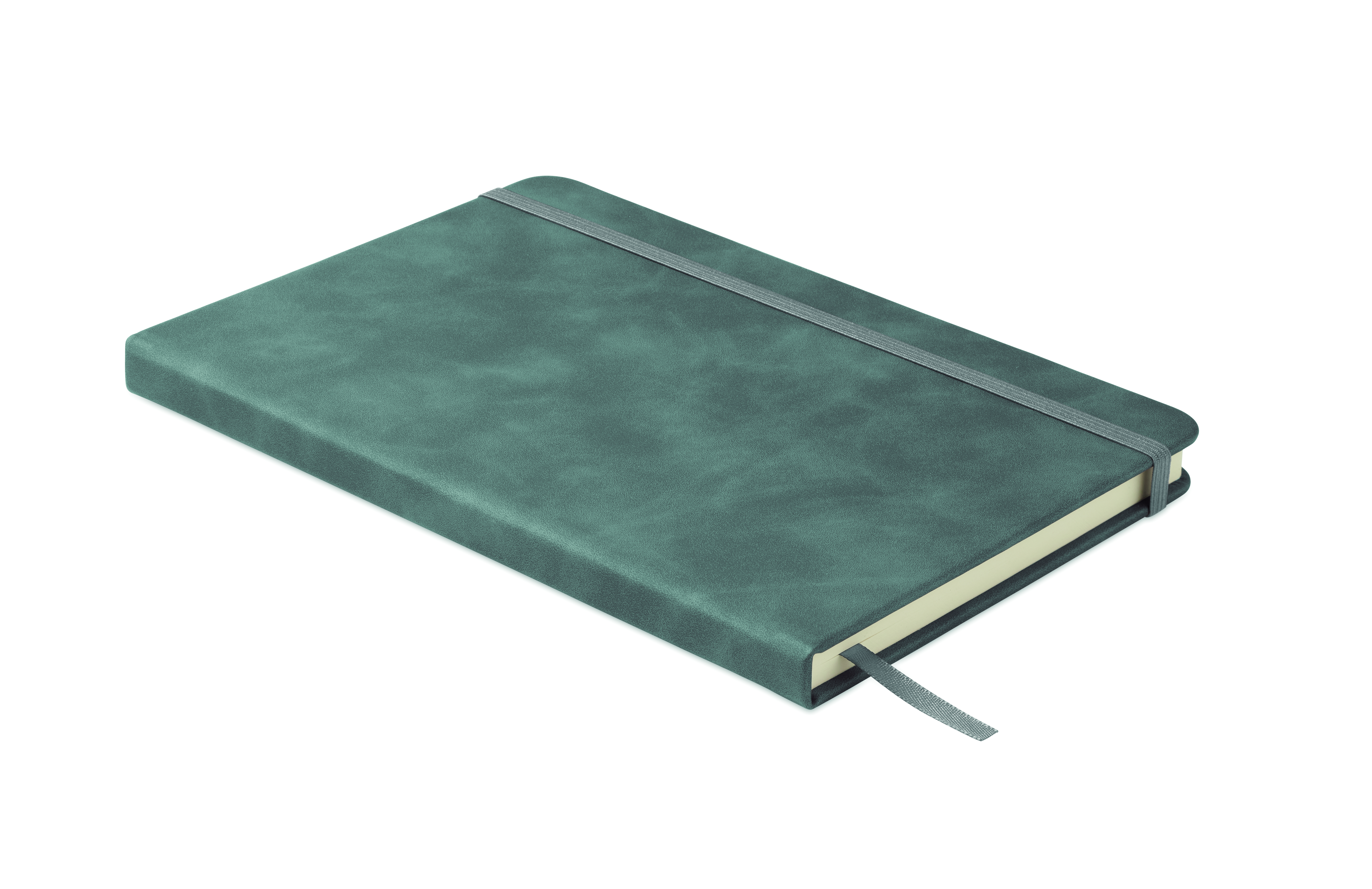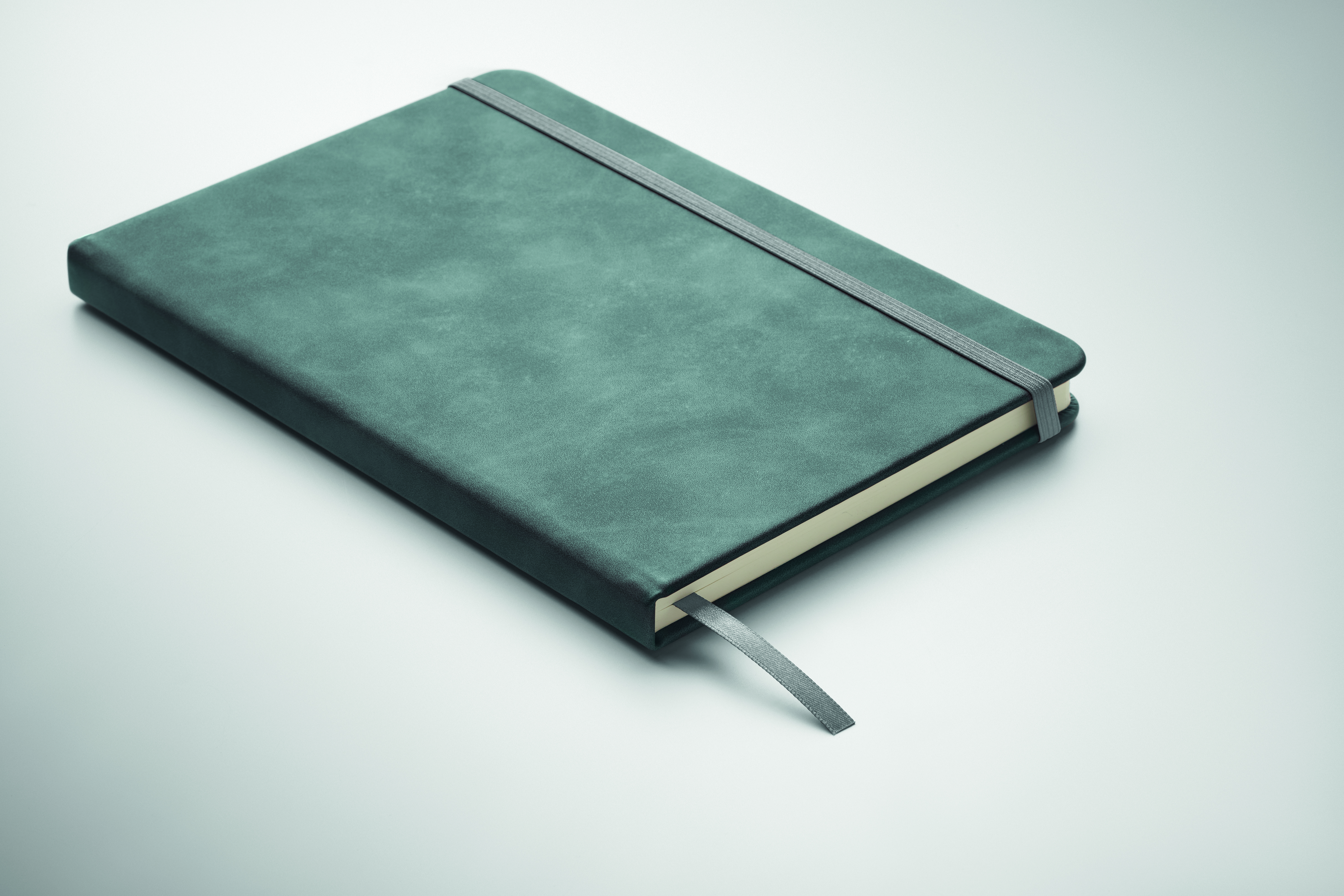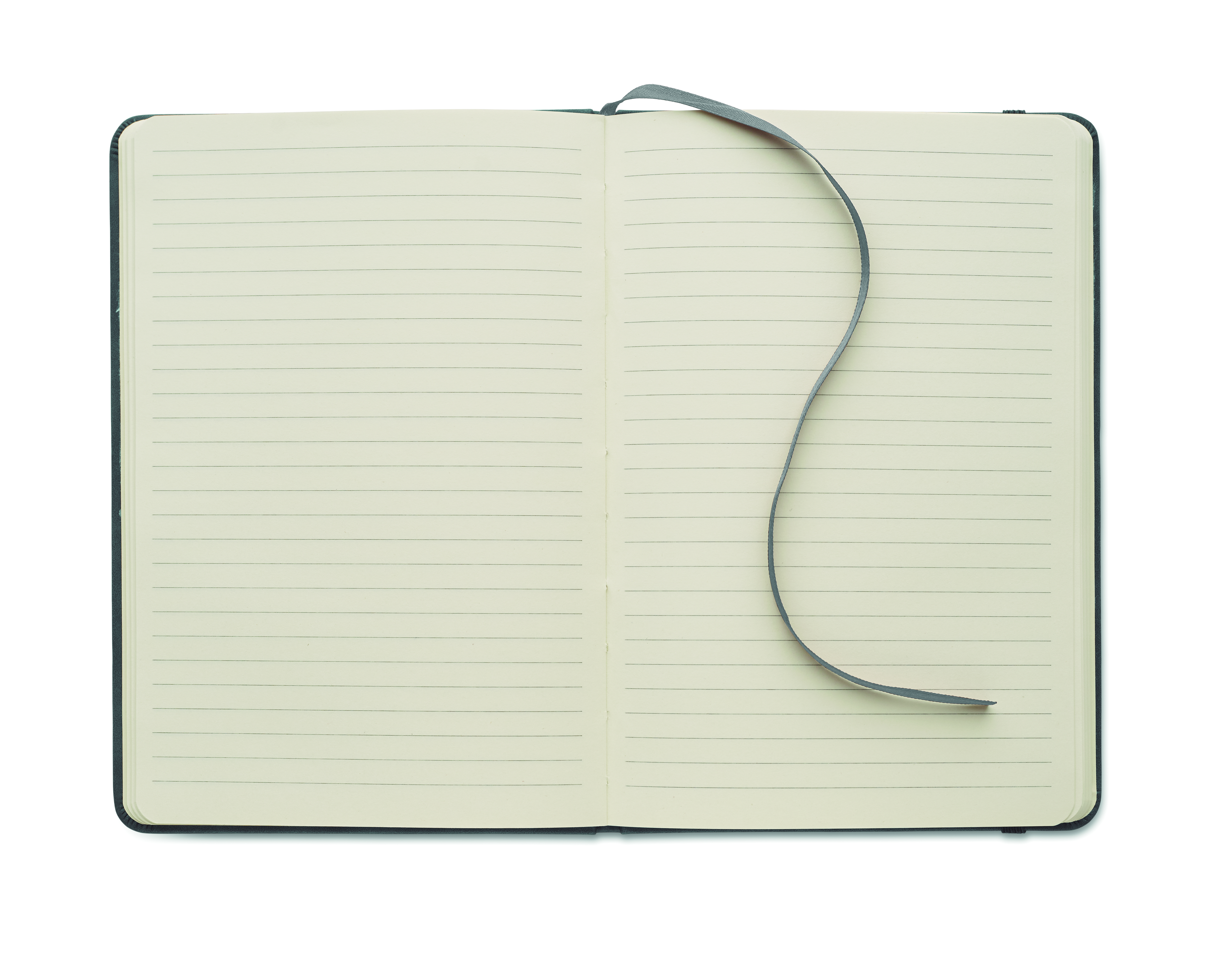 Notes A5 w twardej okładce PU pochodzącej w 40% z recyklingu i w 60% z PU. 160 stron w linie, papier makulaturowy 70 g/m² (80 arkuszy). Pasująca kolorystycznie tasiemka poliestrowa do oznaczania stron.