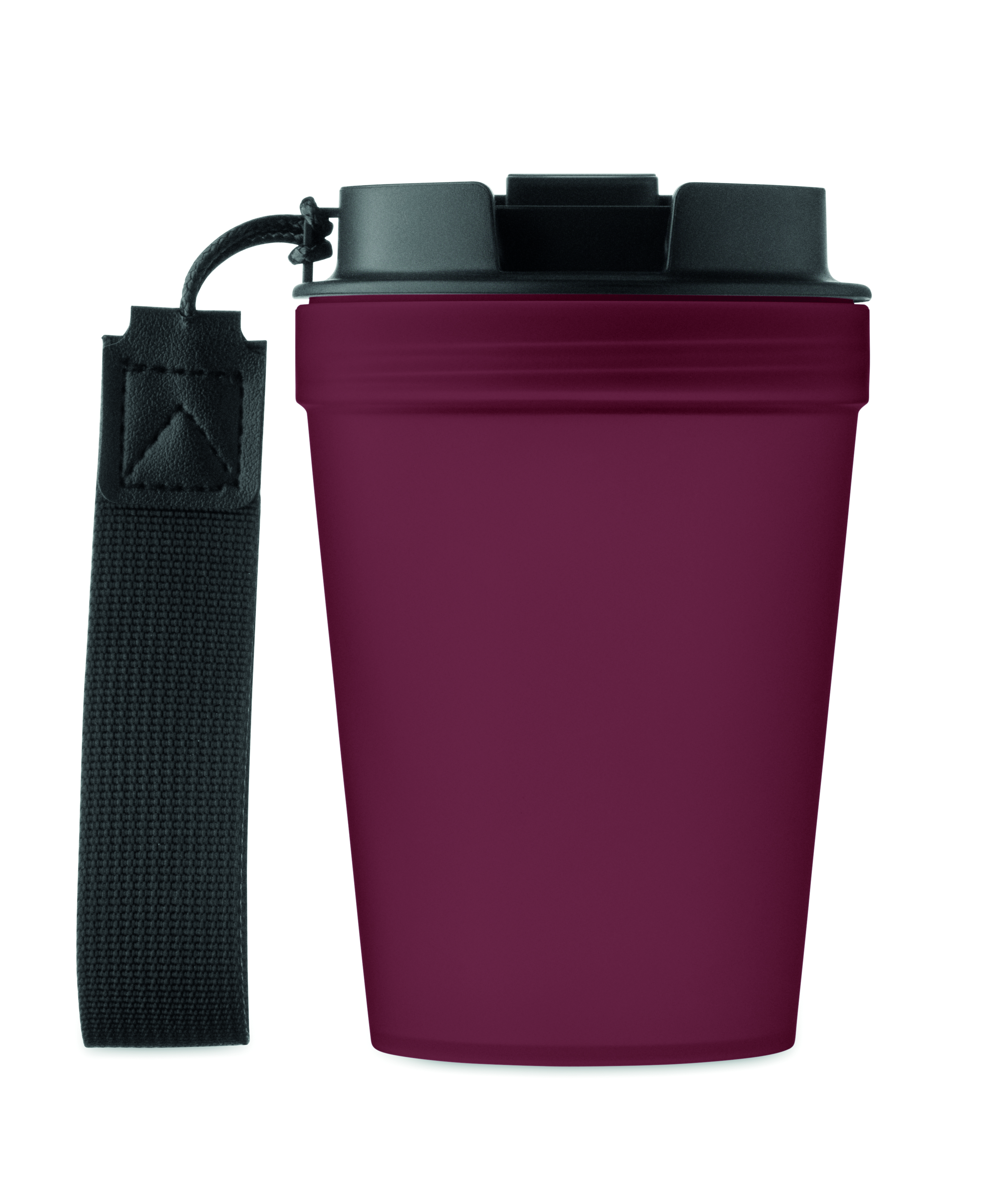 Jednościenny kubek z PP, z paskiem z poliestru RPET. Nie przecieka. Pojemność: 300 ml. Ponieważ jest to kubek jednościenny, produkt może się nagrzewać.