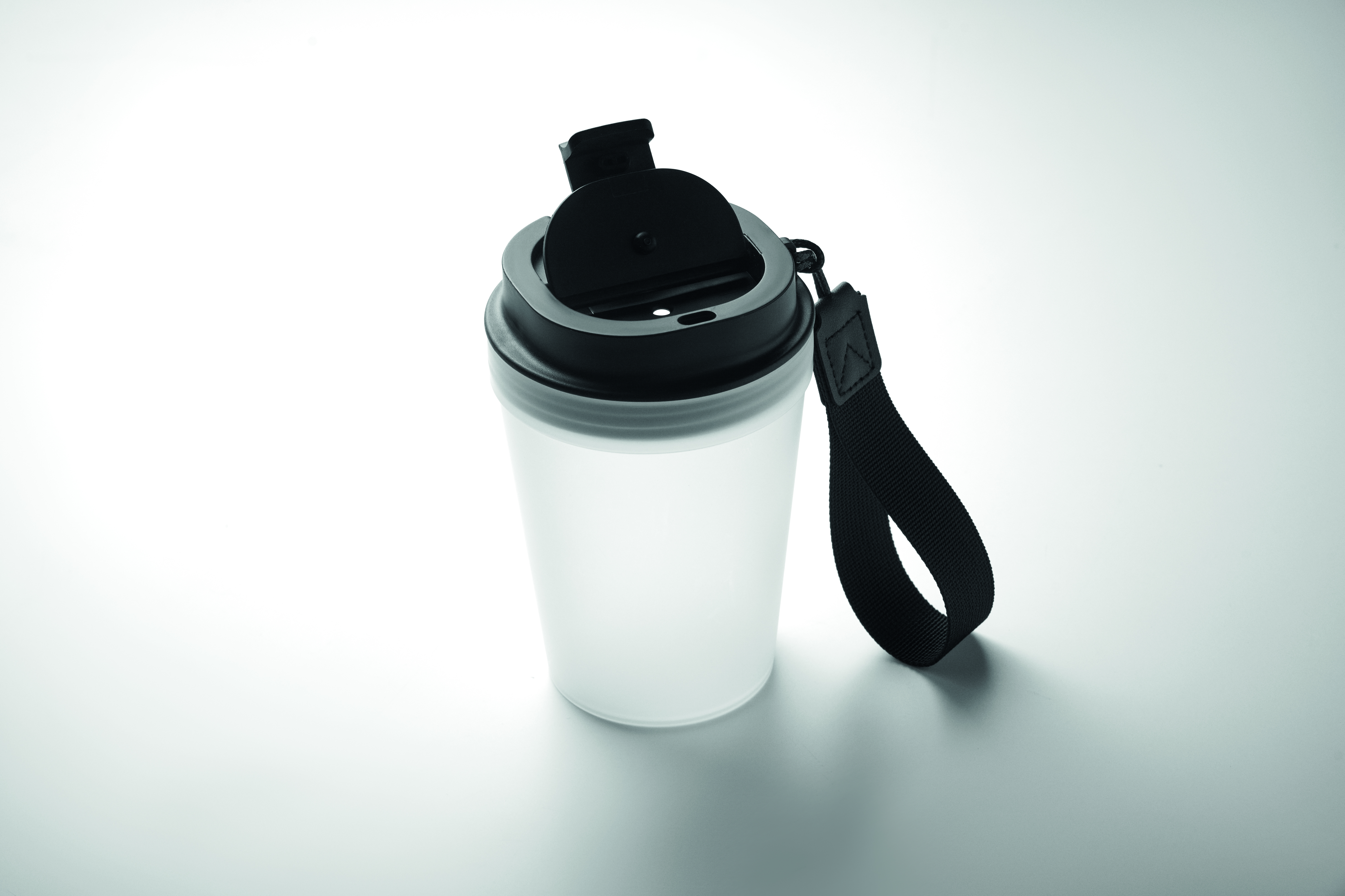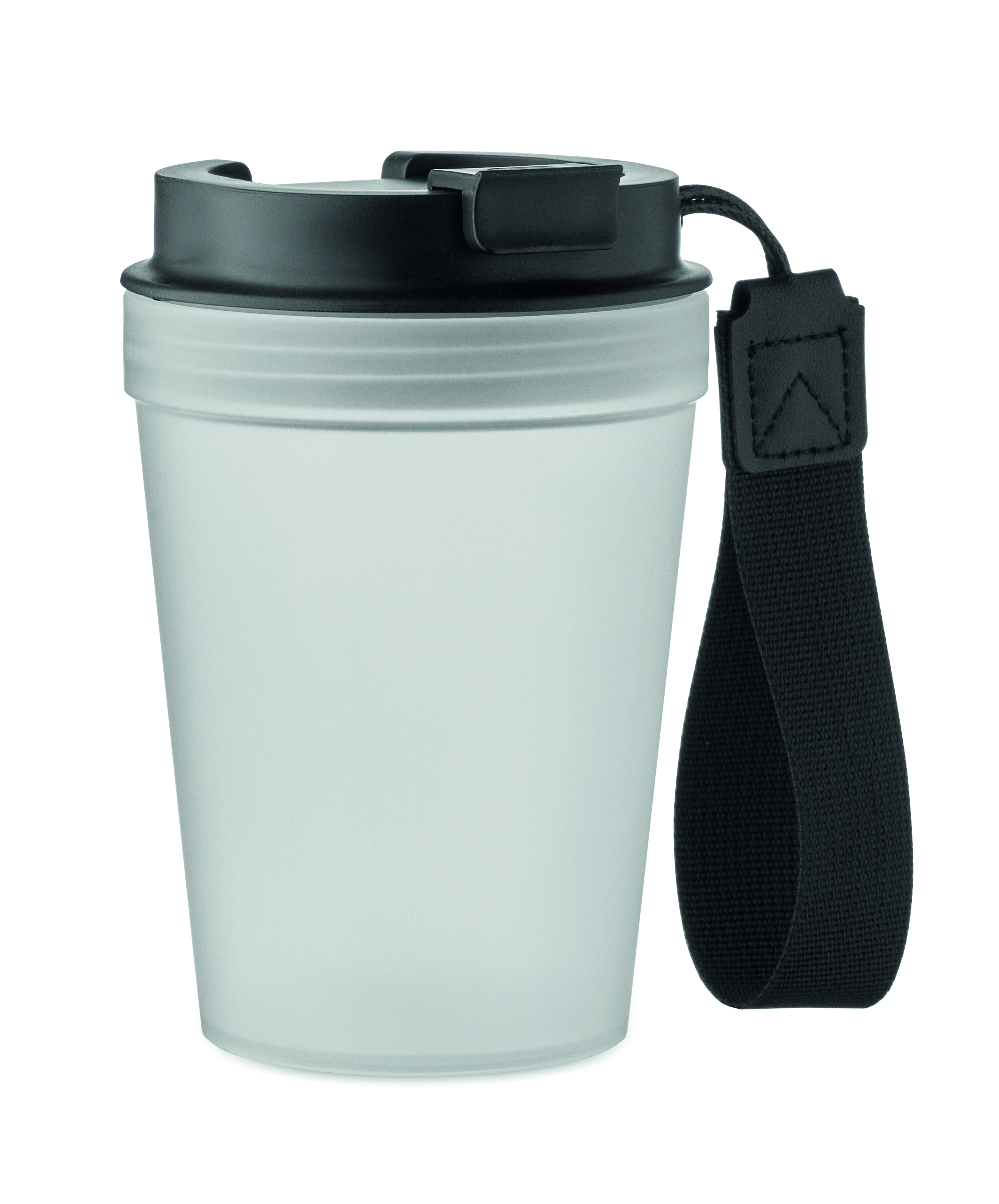 Jednościenny kubek z PP, z paskiem z poliestru RPET. Nie przecieka. Pojemność: 300 ml. Ponieważ jest to kubek jednościenny, produkt może się nagrzewać.