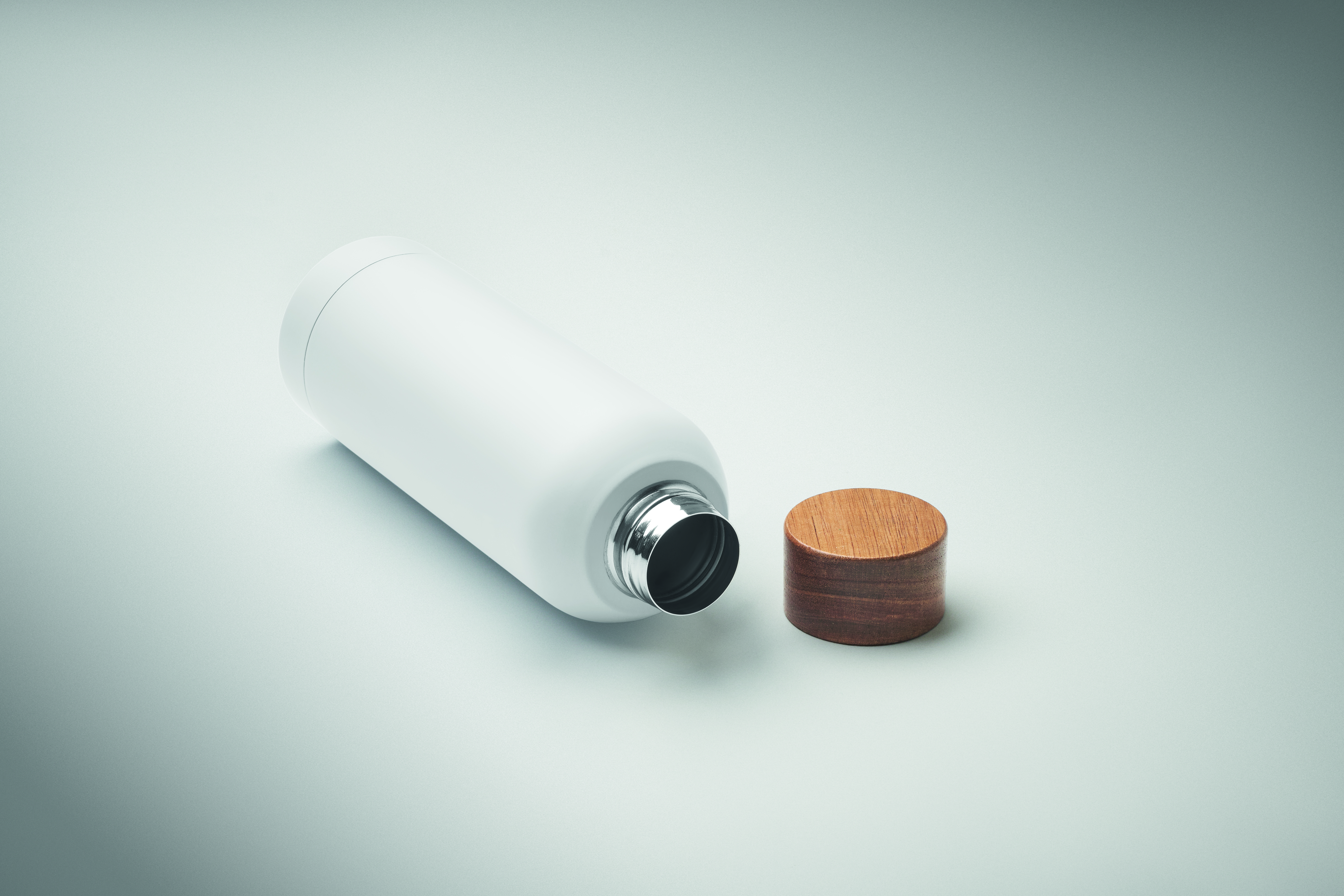 Jednościenna butelka wykonana w 90% ze stali nierdzewnej pochodzącej z recyklingu i w 10% ze stali nierdzewnej z gumowym wykończeniem i pokrywką z drewna akacjowego. Nie przecieka. Pojemność: 700 ml. Ponieważ jest to butelka jednościenna, produkt może się nagrzewać.