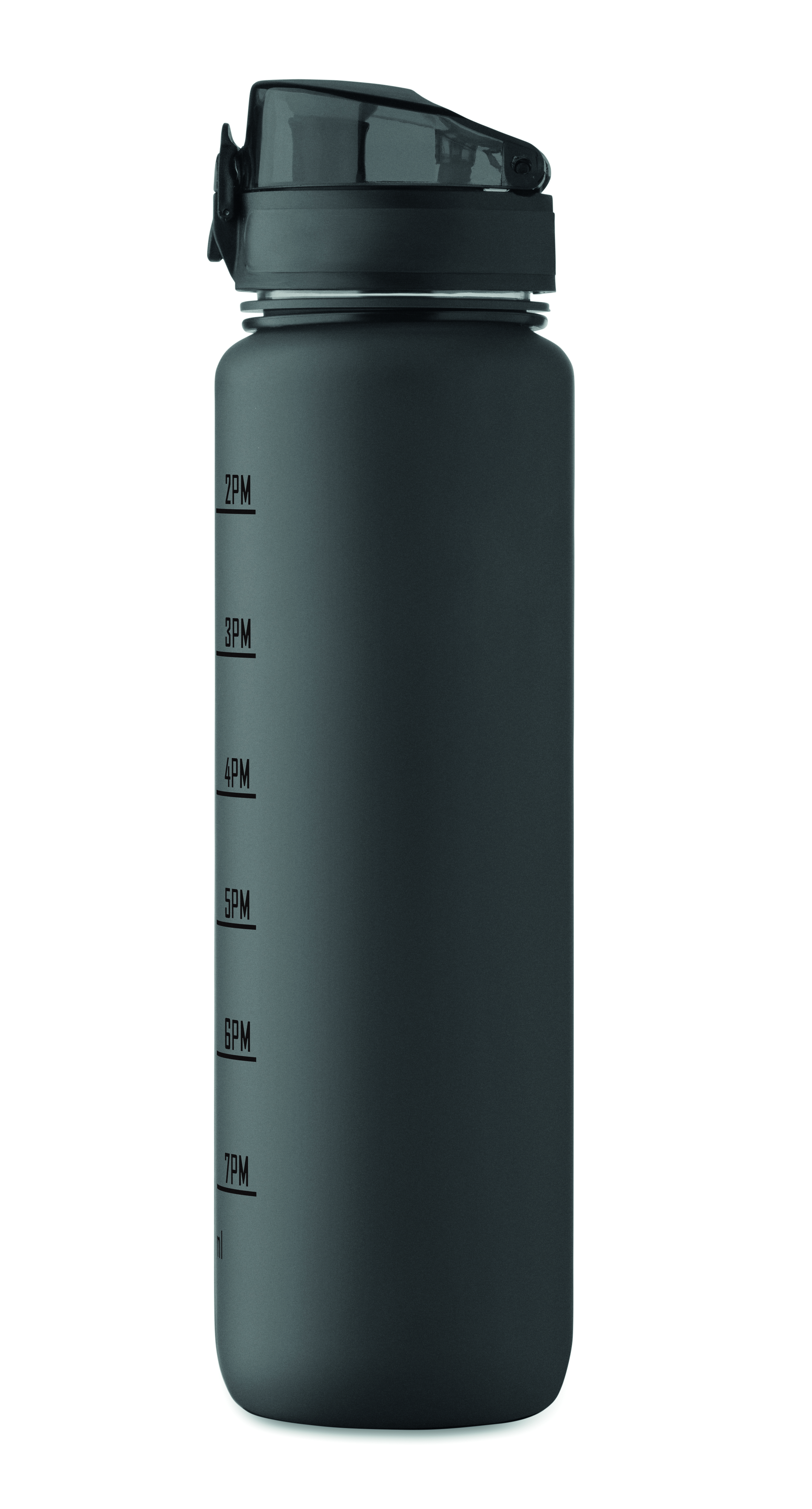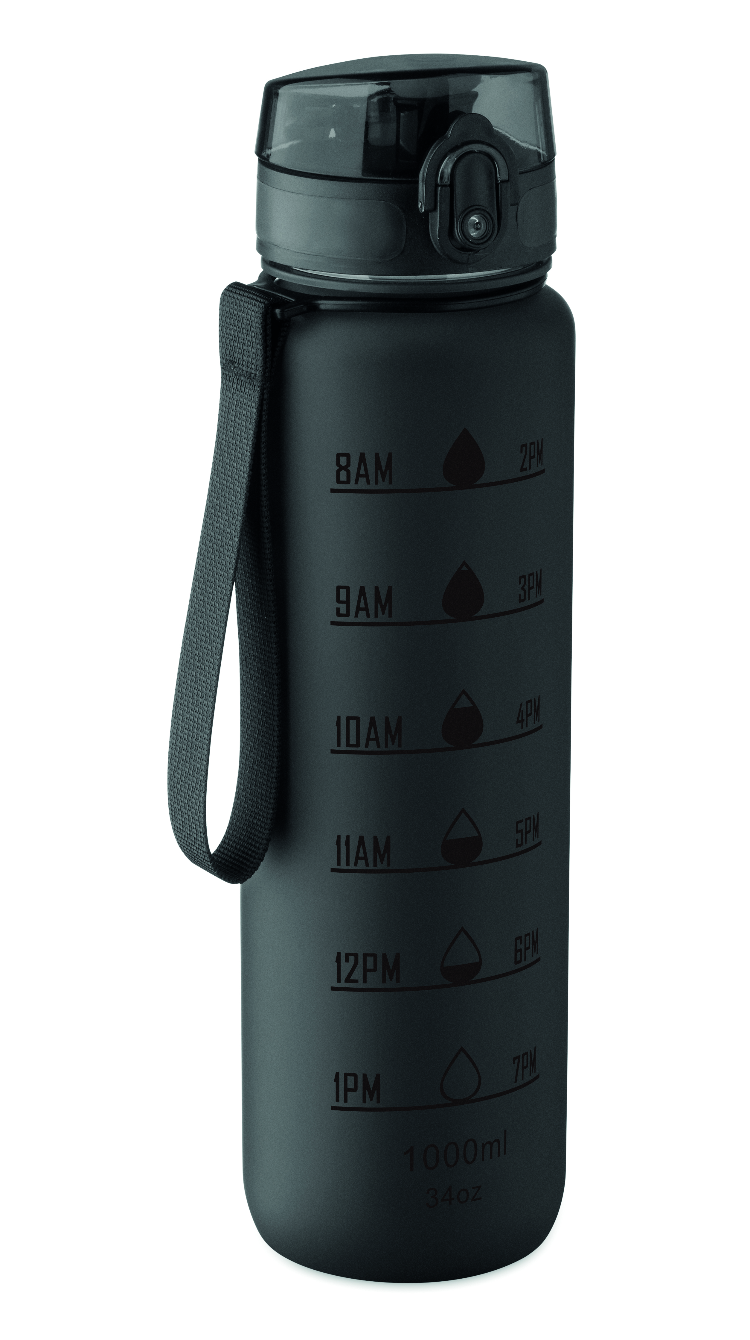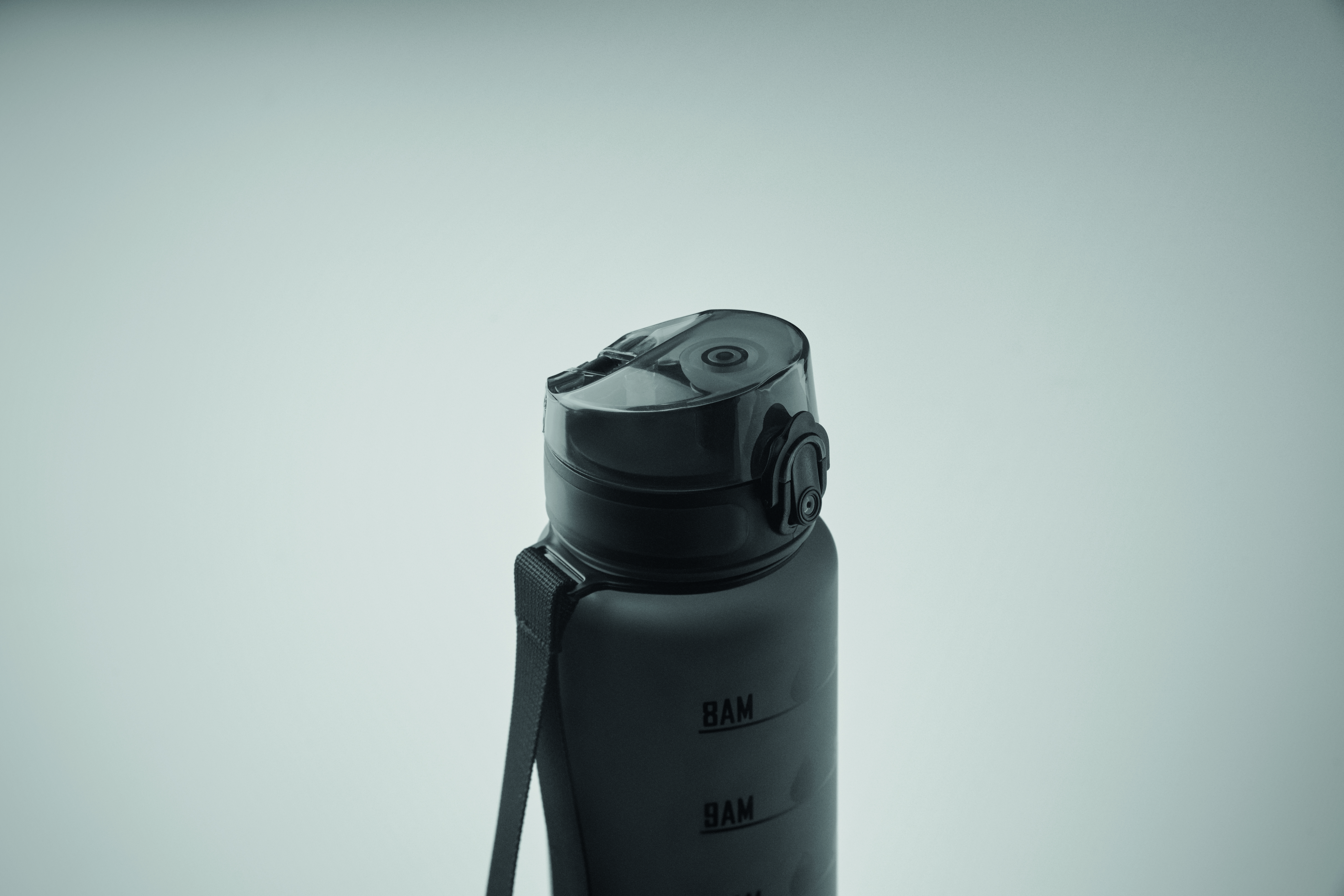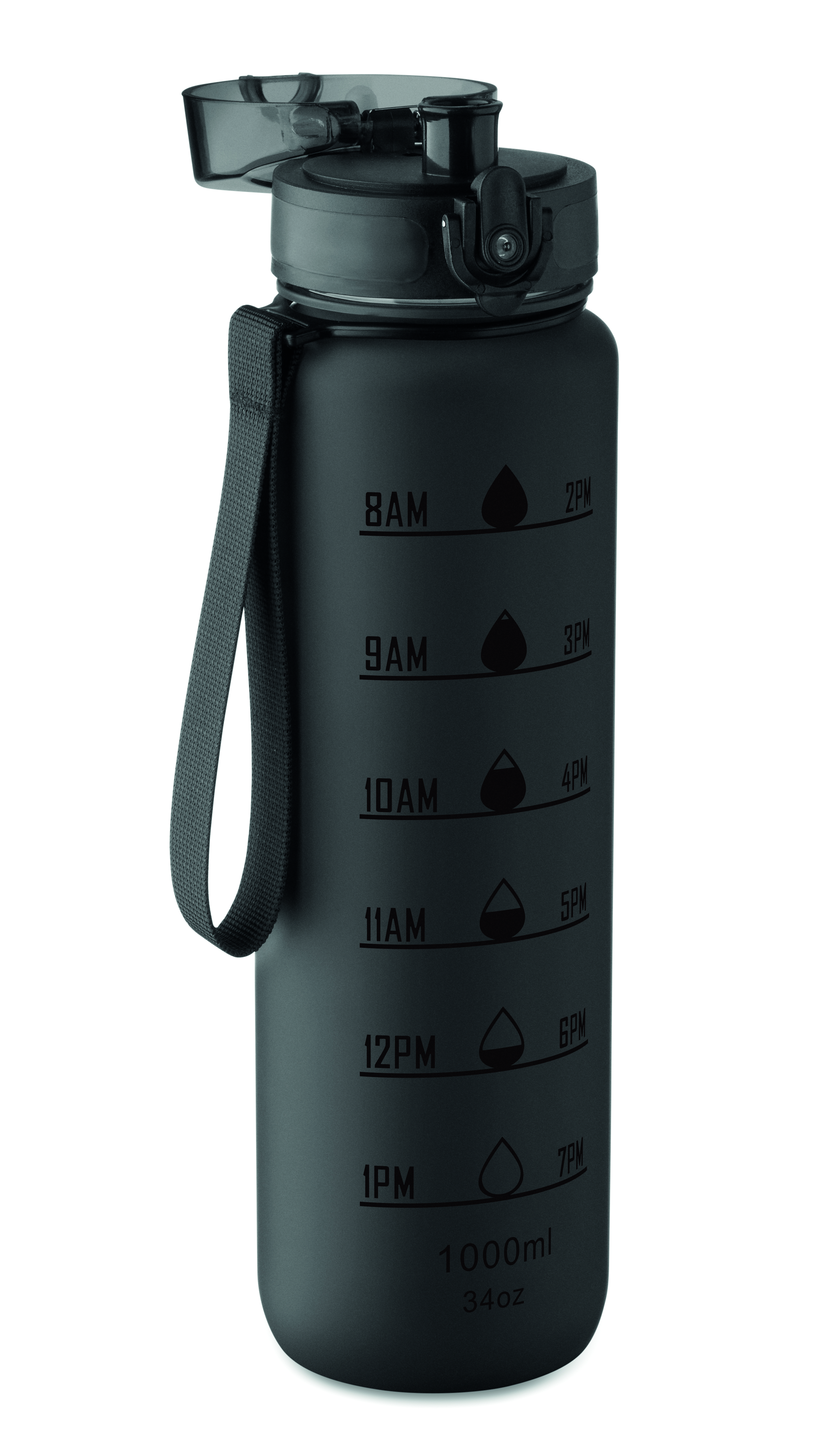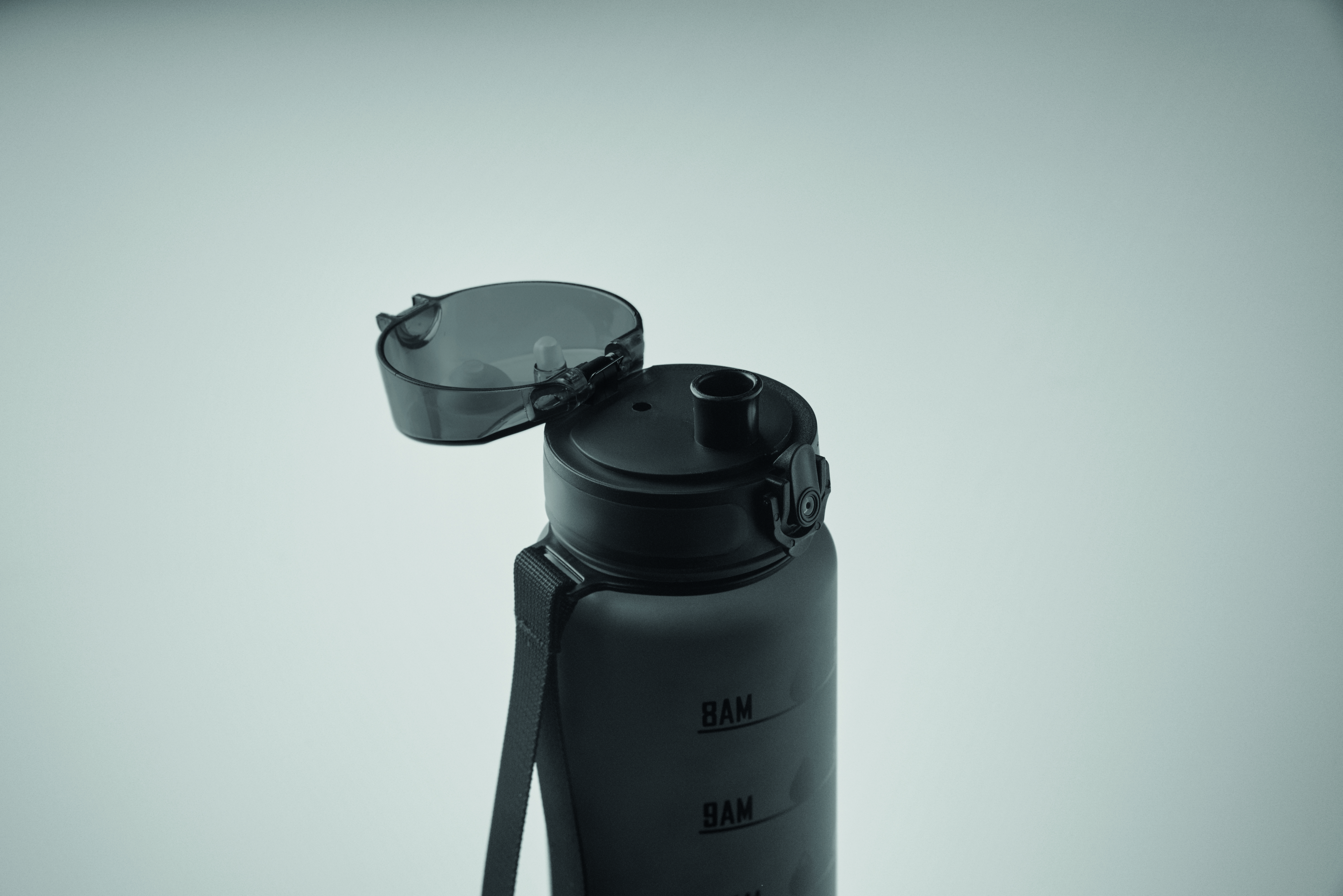 Sportowa butelka na wodę z RPET, motywujące oznaczenia czasu, otwierana jedną ręką klapka, blokada bezpieczeństwa i pasek do przenoszenia. Nie przecieka. Pojemność: 1 l.