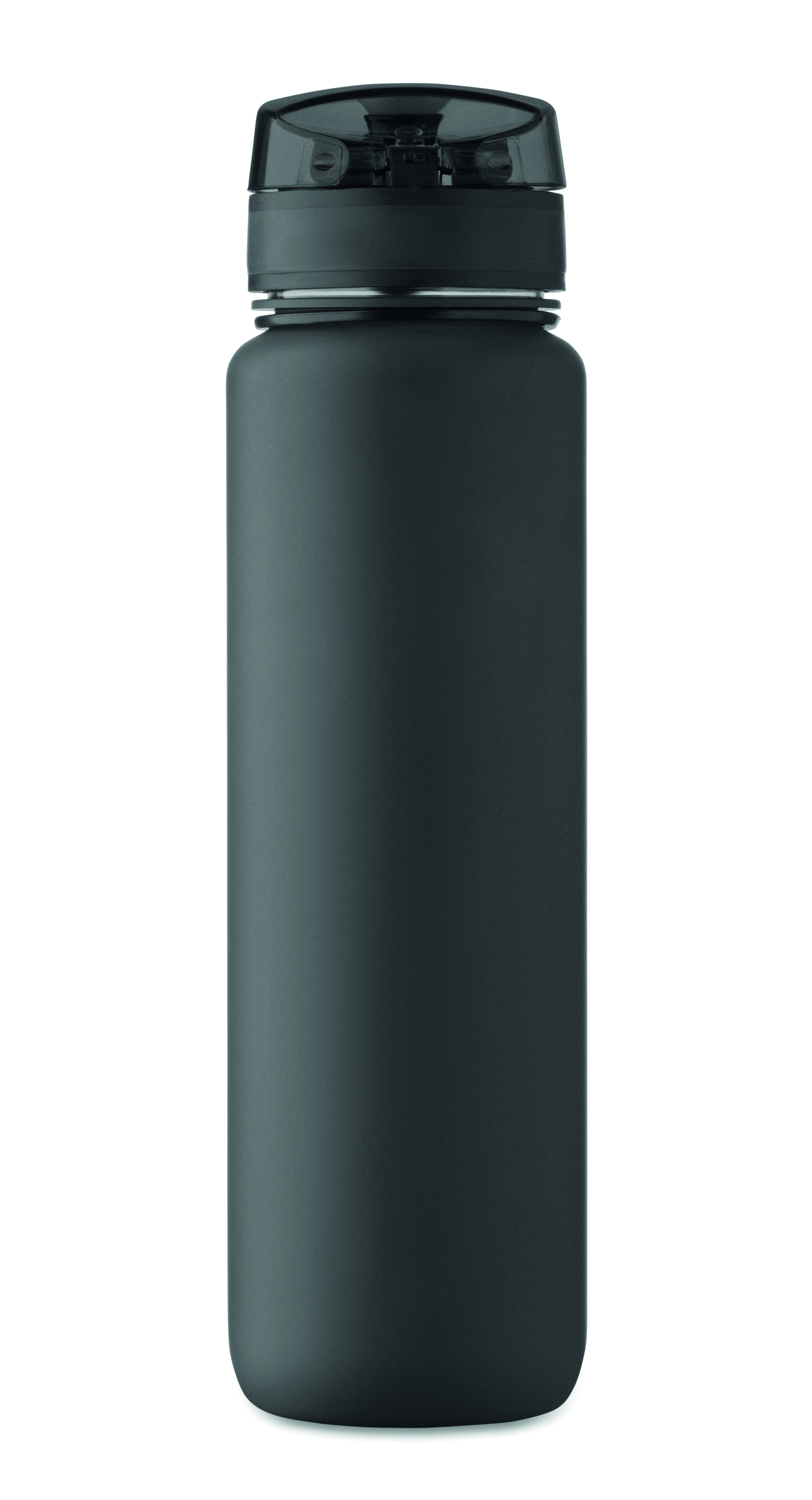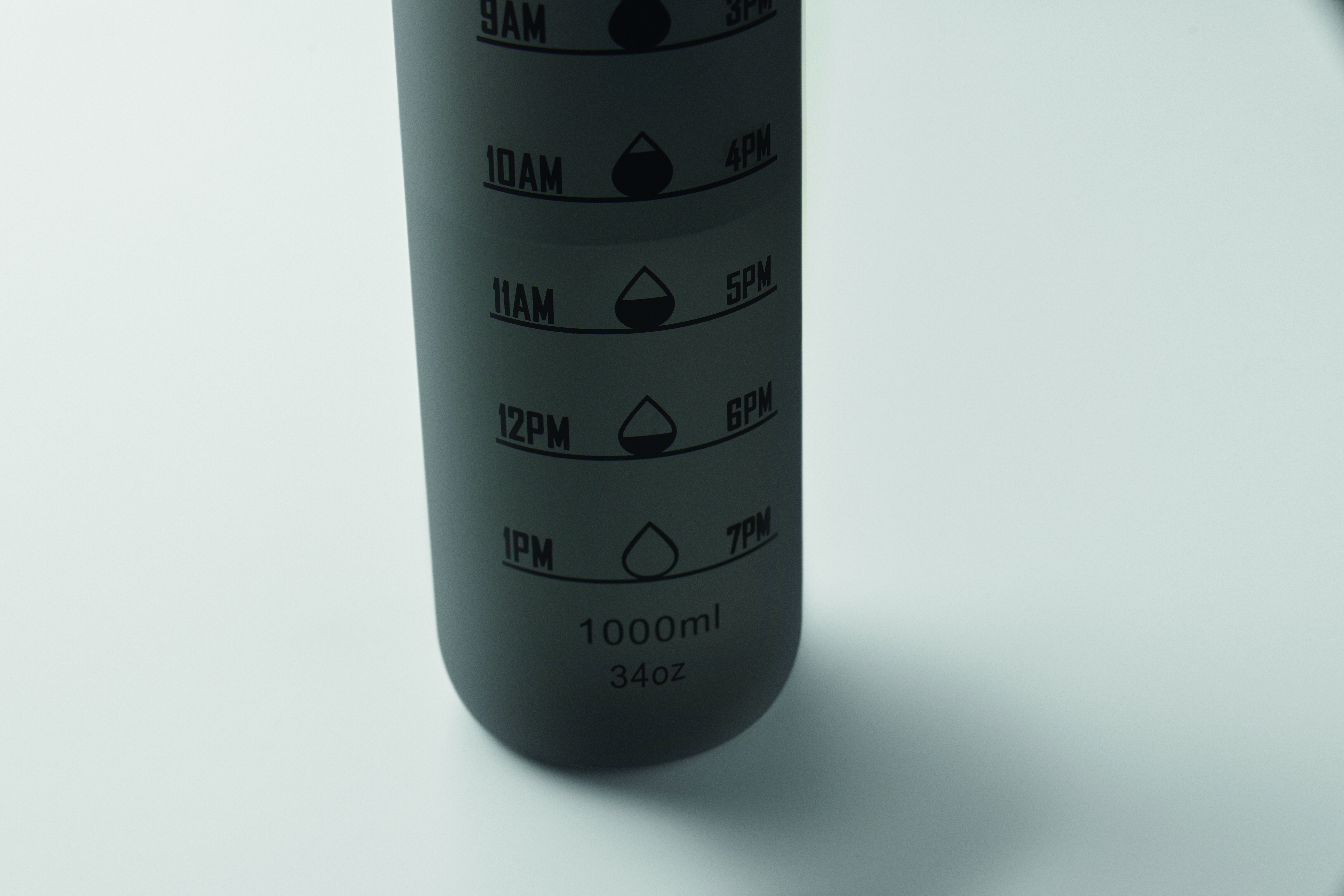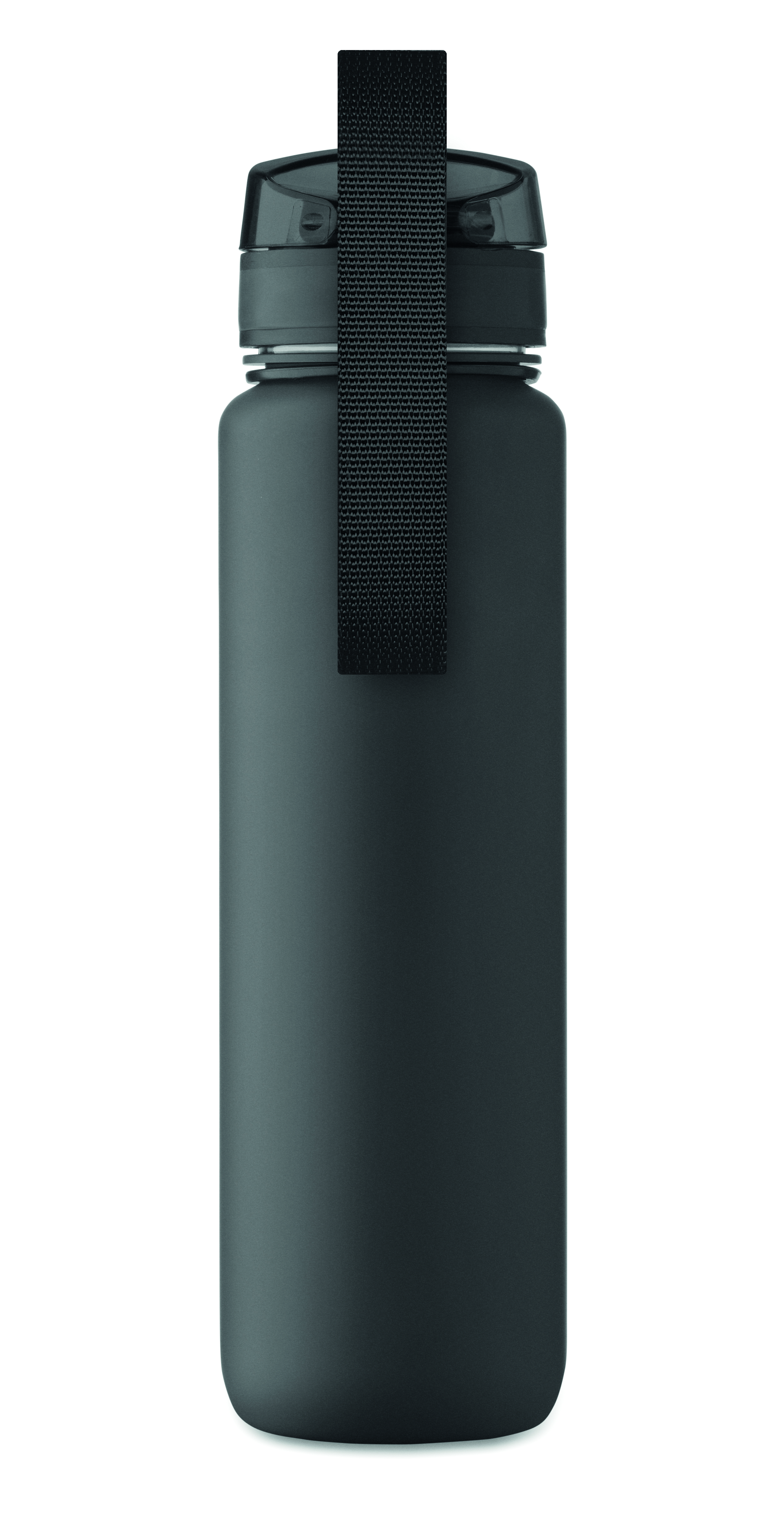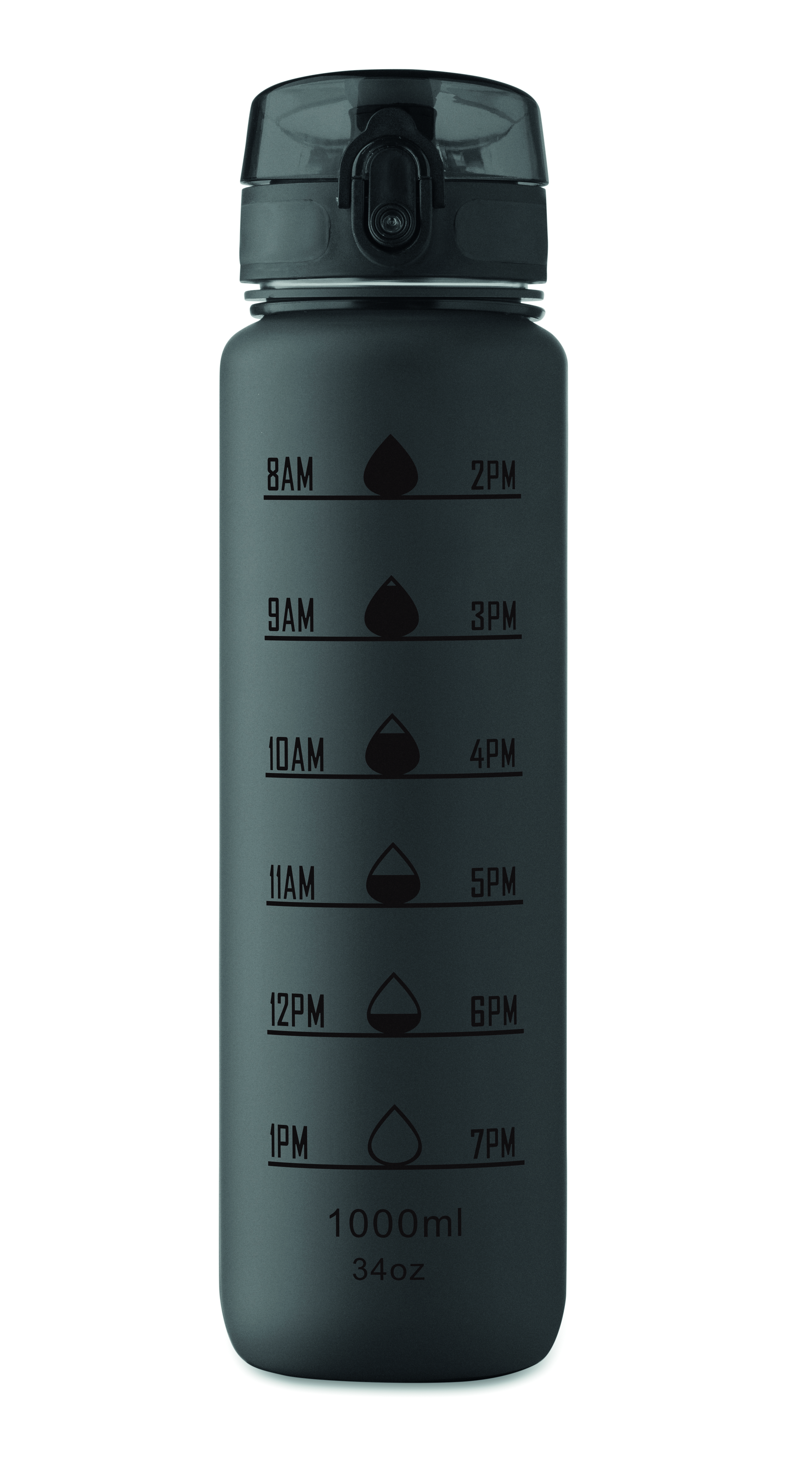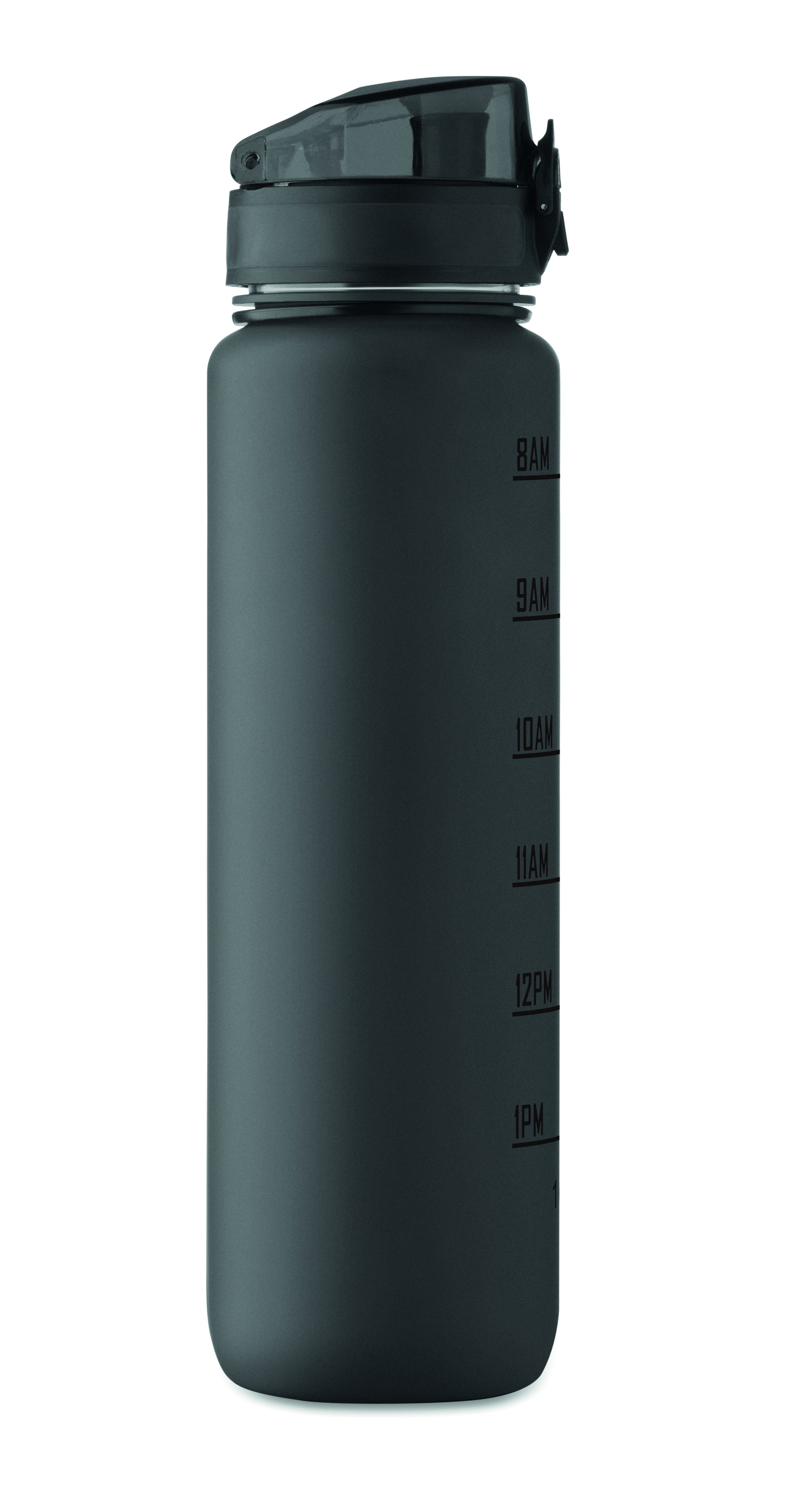 Sportowa butelka na wodę z RPET, motywujące oznaczenia czasu, otwierana jedną ręką klapka, blokada bezpieczeństwa i pasek do przenoszenia. Nie przecieka. Pojemność: 1 l.