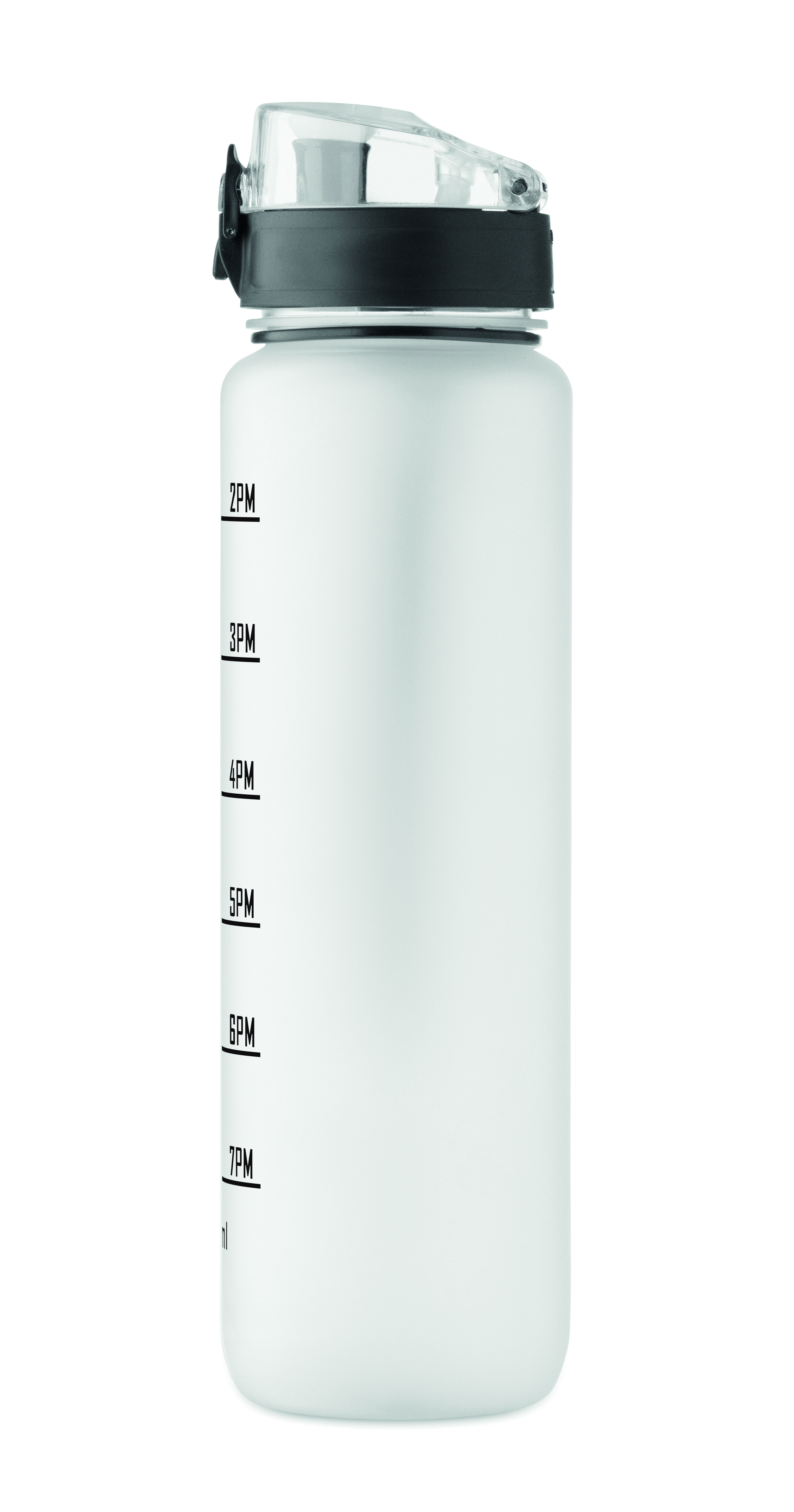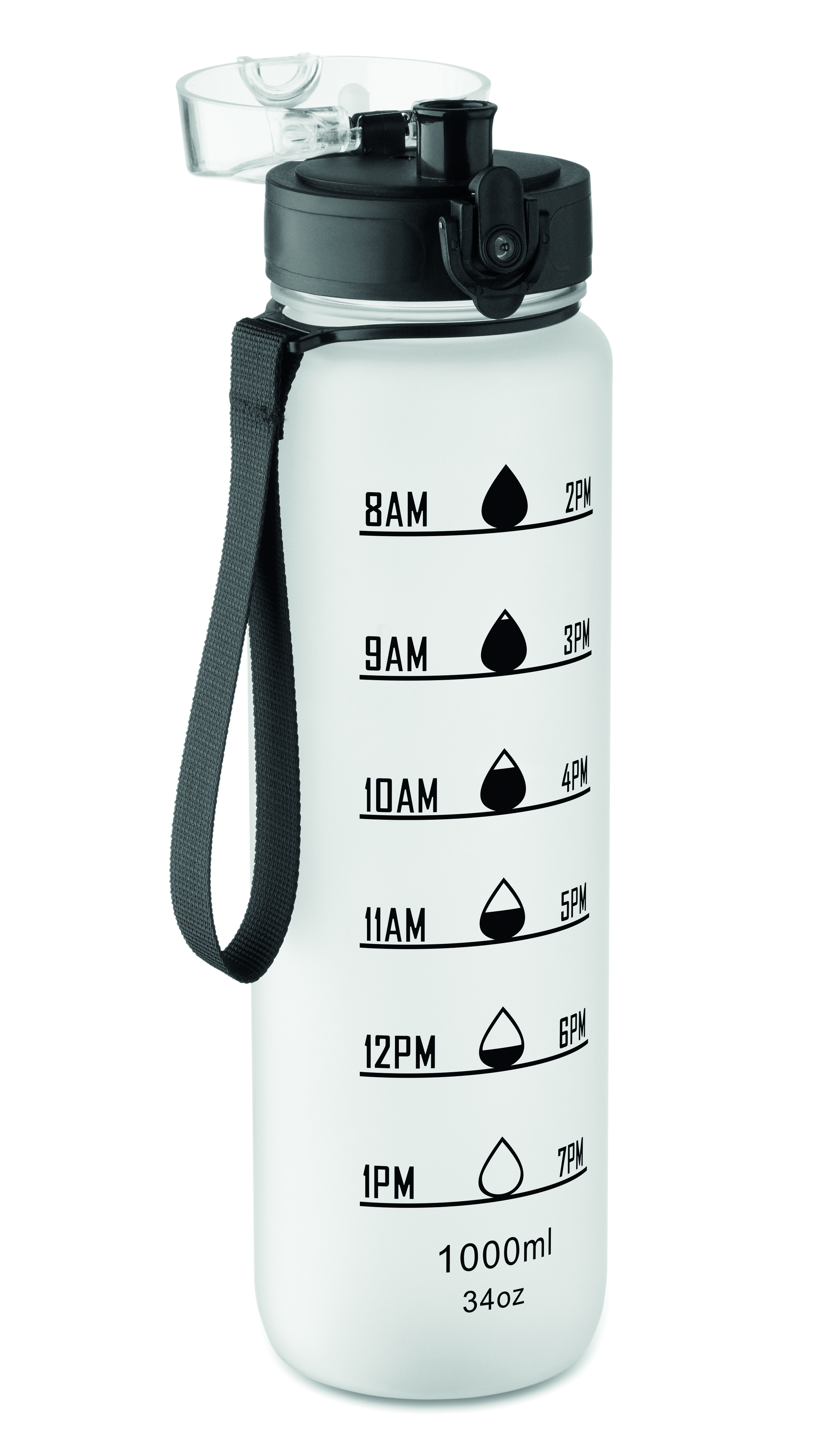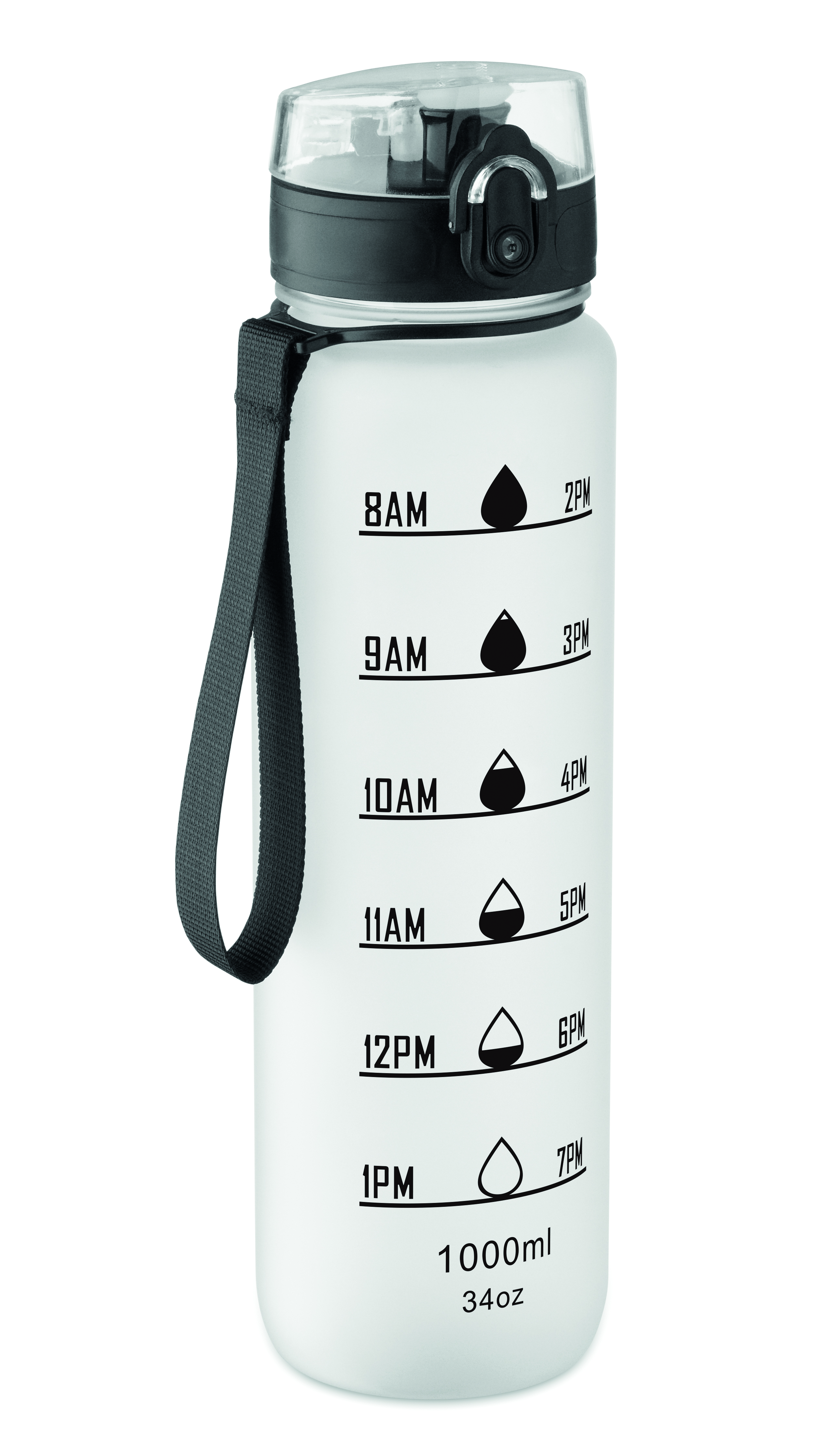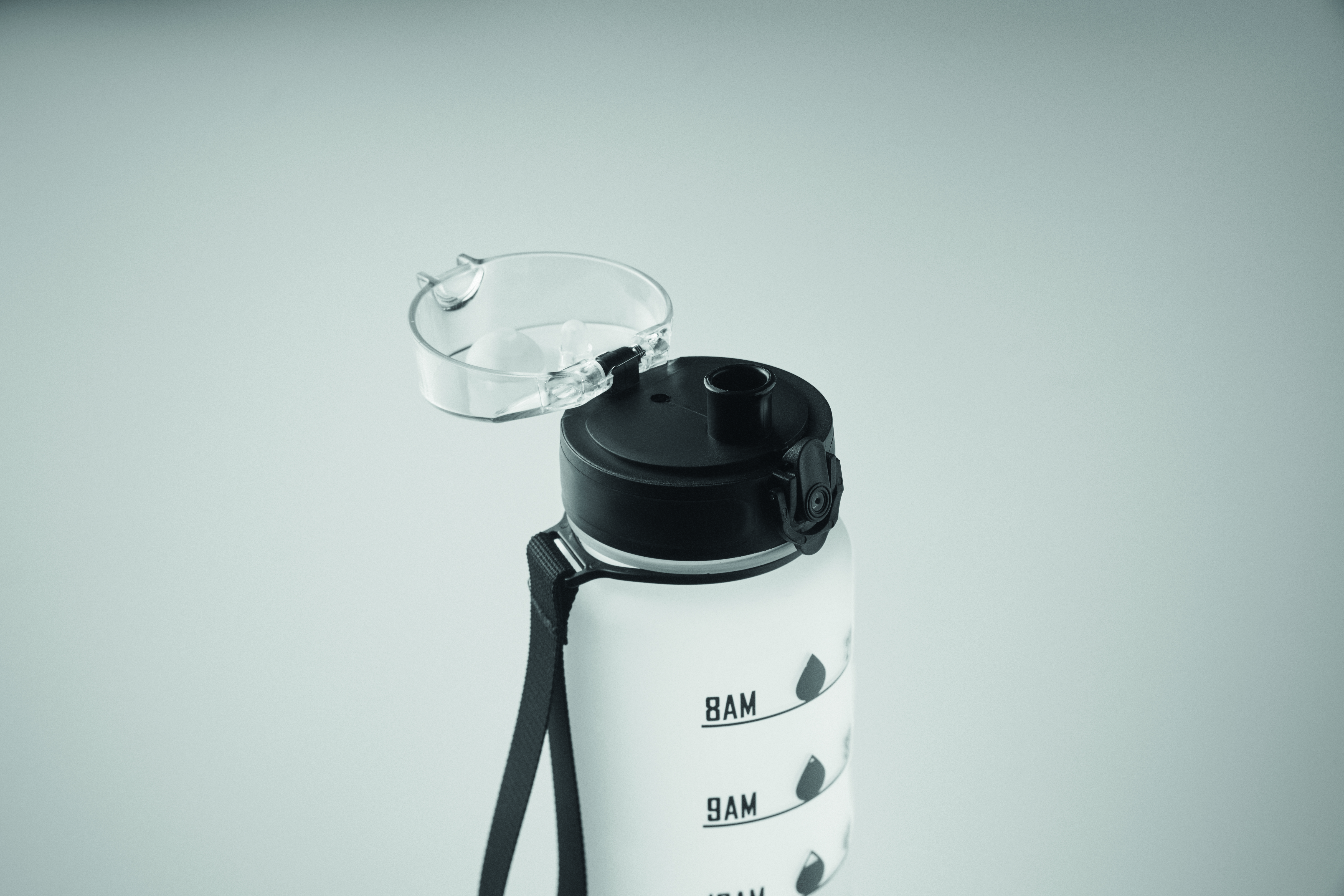 Sportowa butelka na wodę z RPET, motywujące oznaczenia czasu, otwierana jedną ręką klapka, blokada bezpieczeństwa i pasek do przenoszenia. Nie przecieka. Pojemność: 1 l.