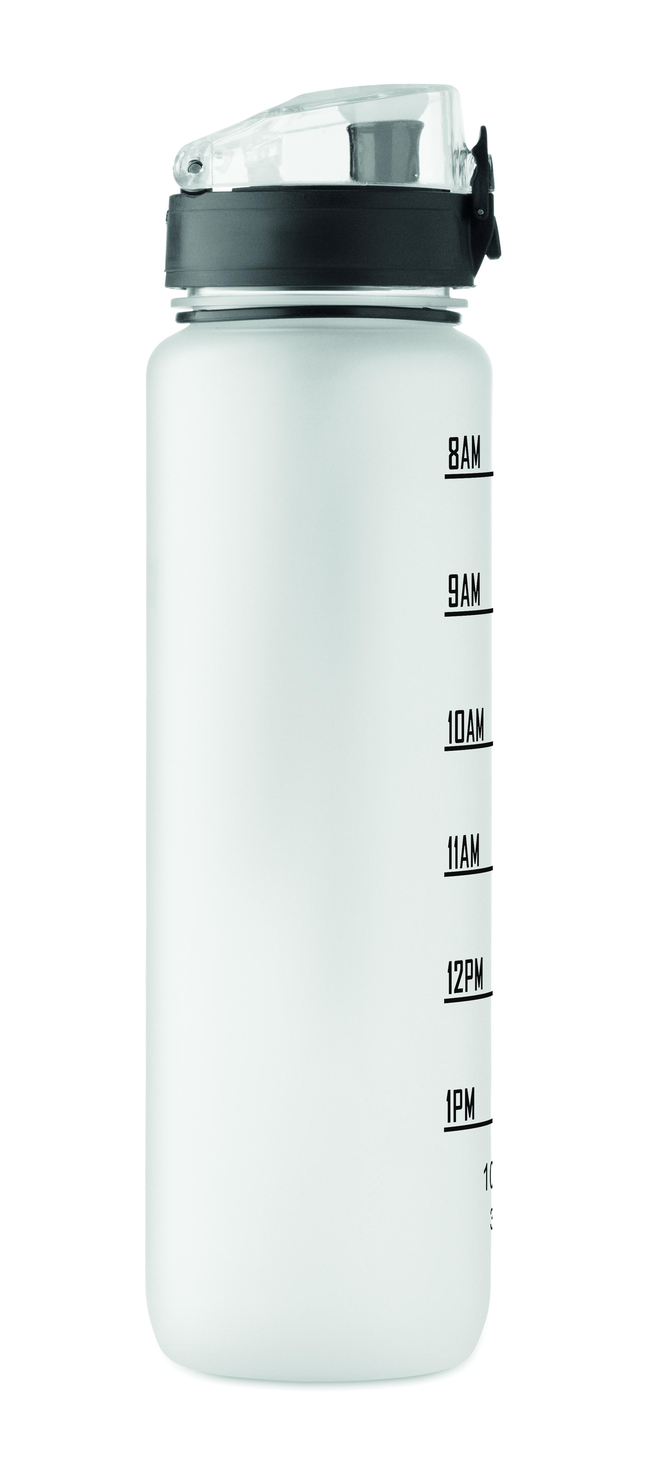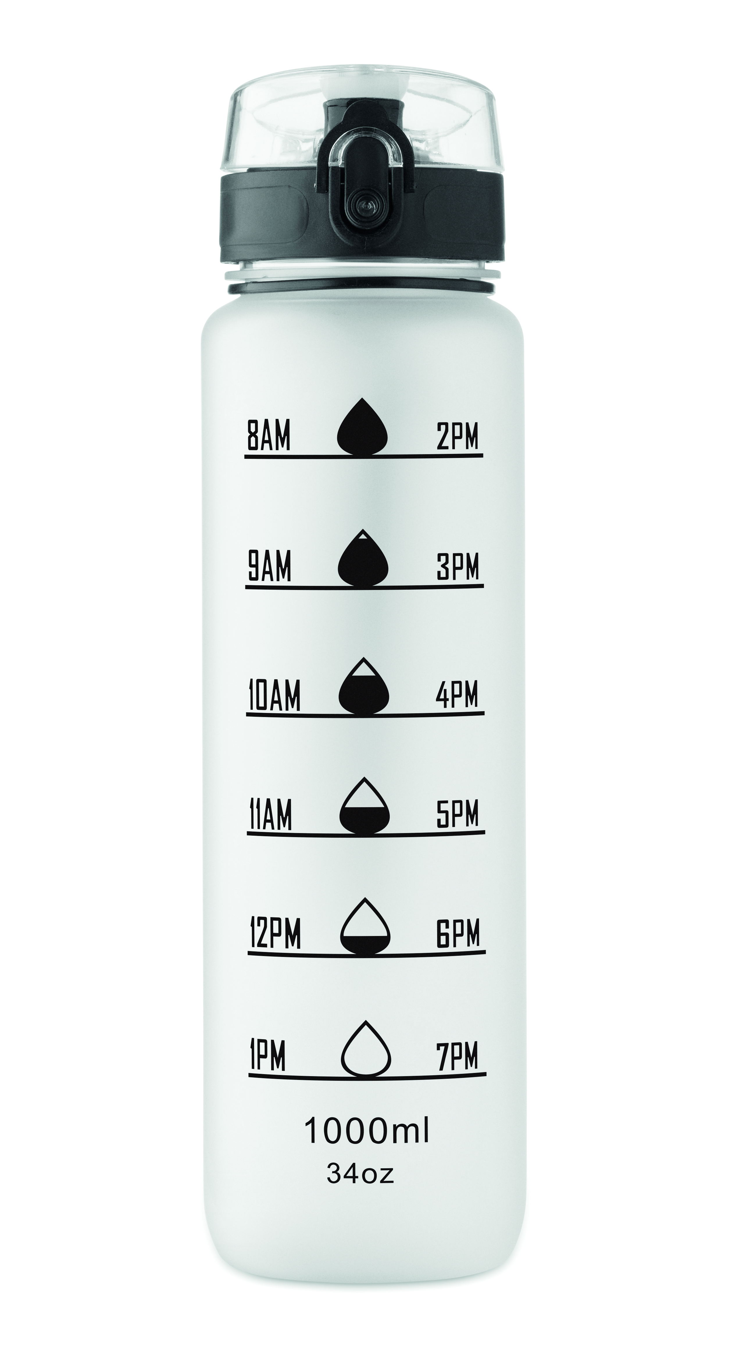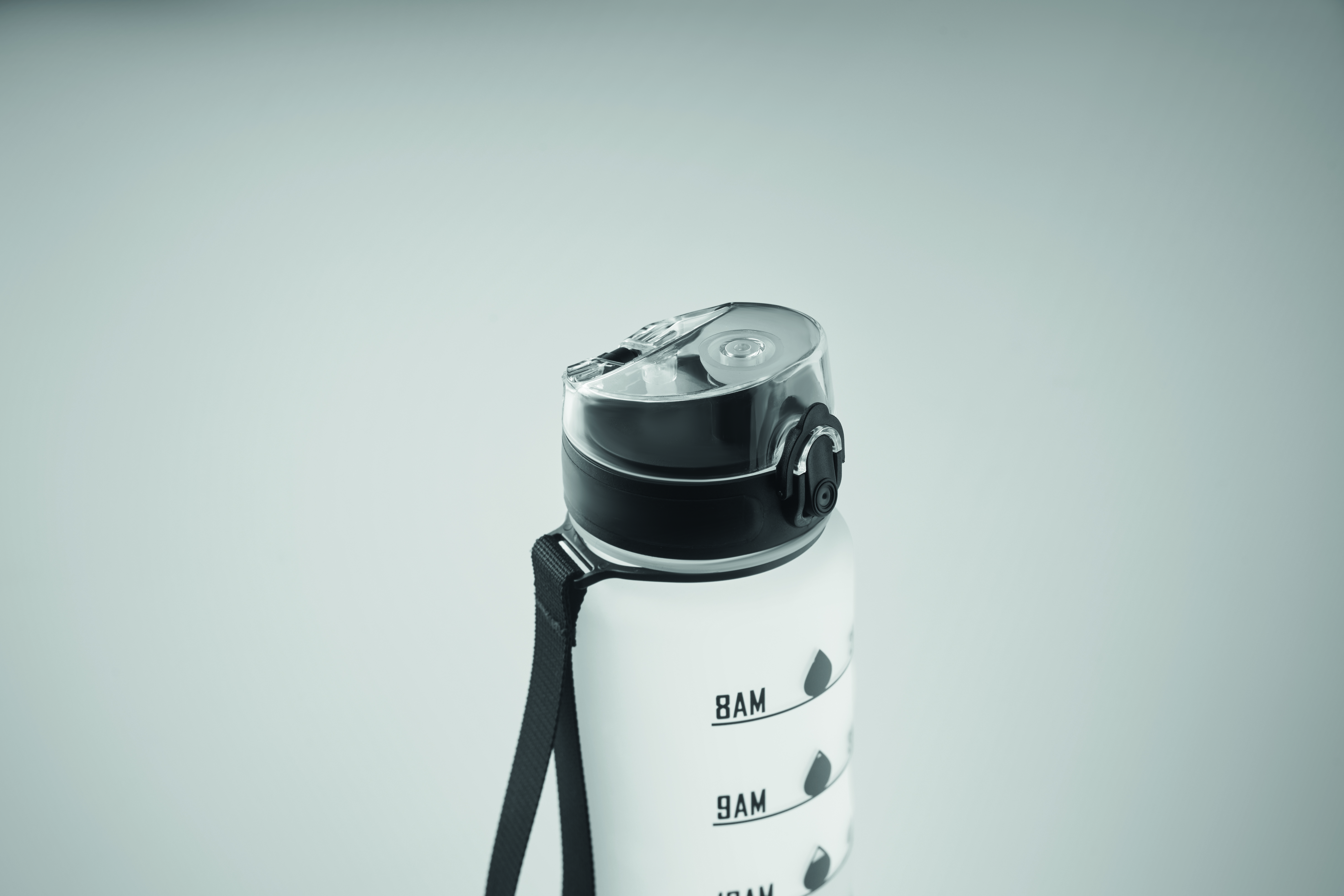 Sportowa butelka na wodę z RPET, motywujące oznaczenia czasu, otwierana jedną ręką klapka, blokada bezpieczeństwa i pasek do przenoszenia. Nie przecieka. Pojemność: 1 l.