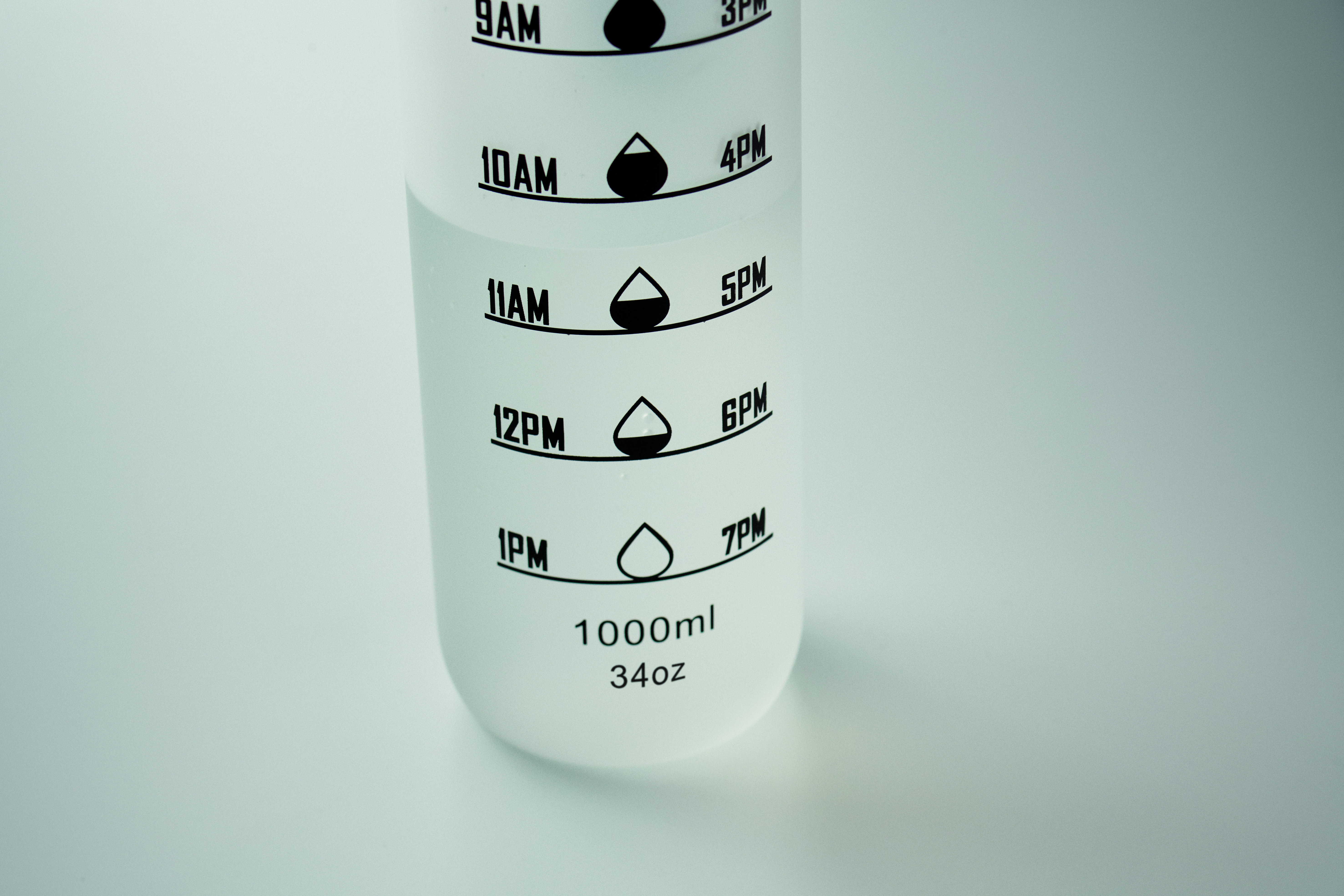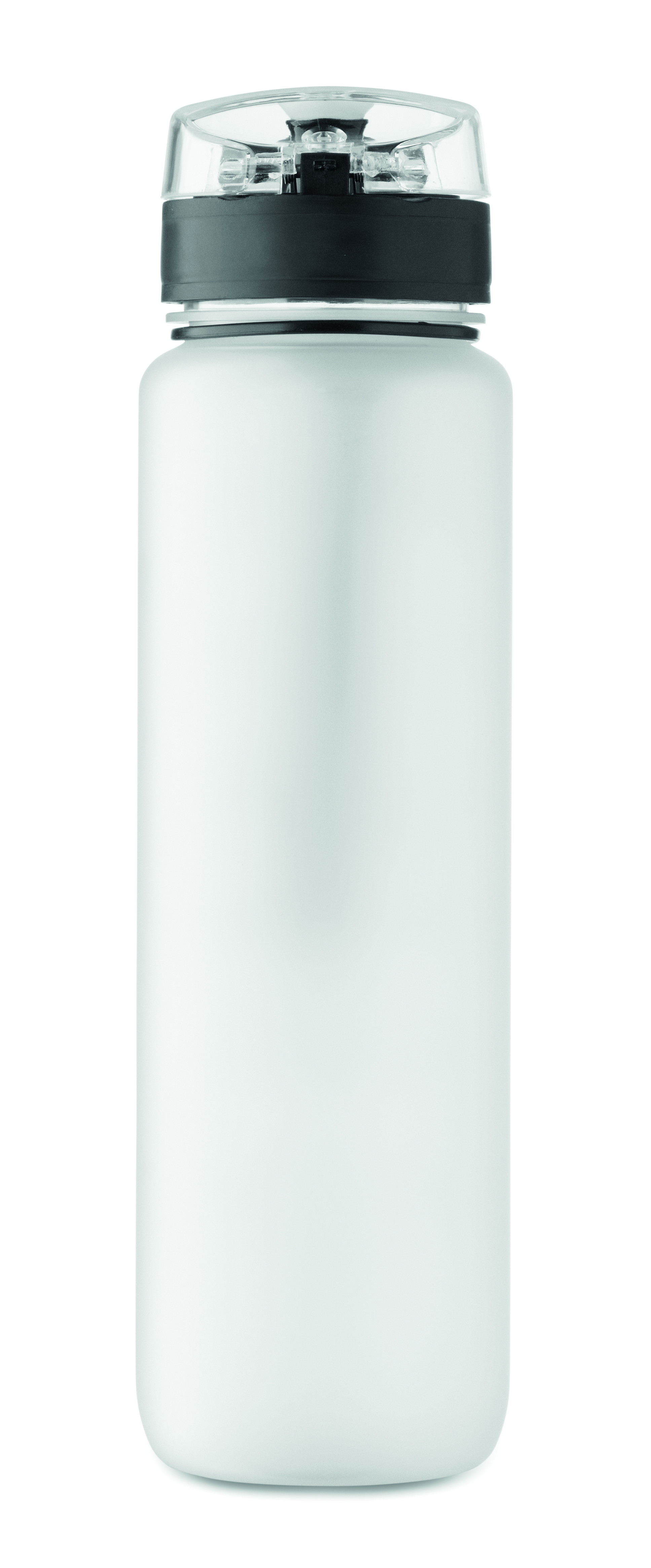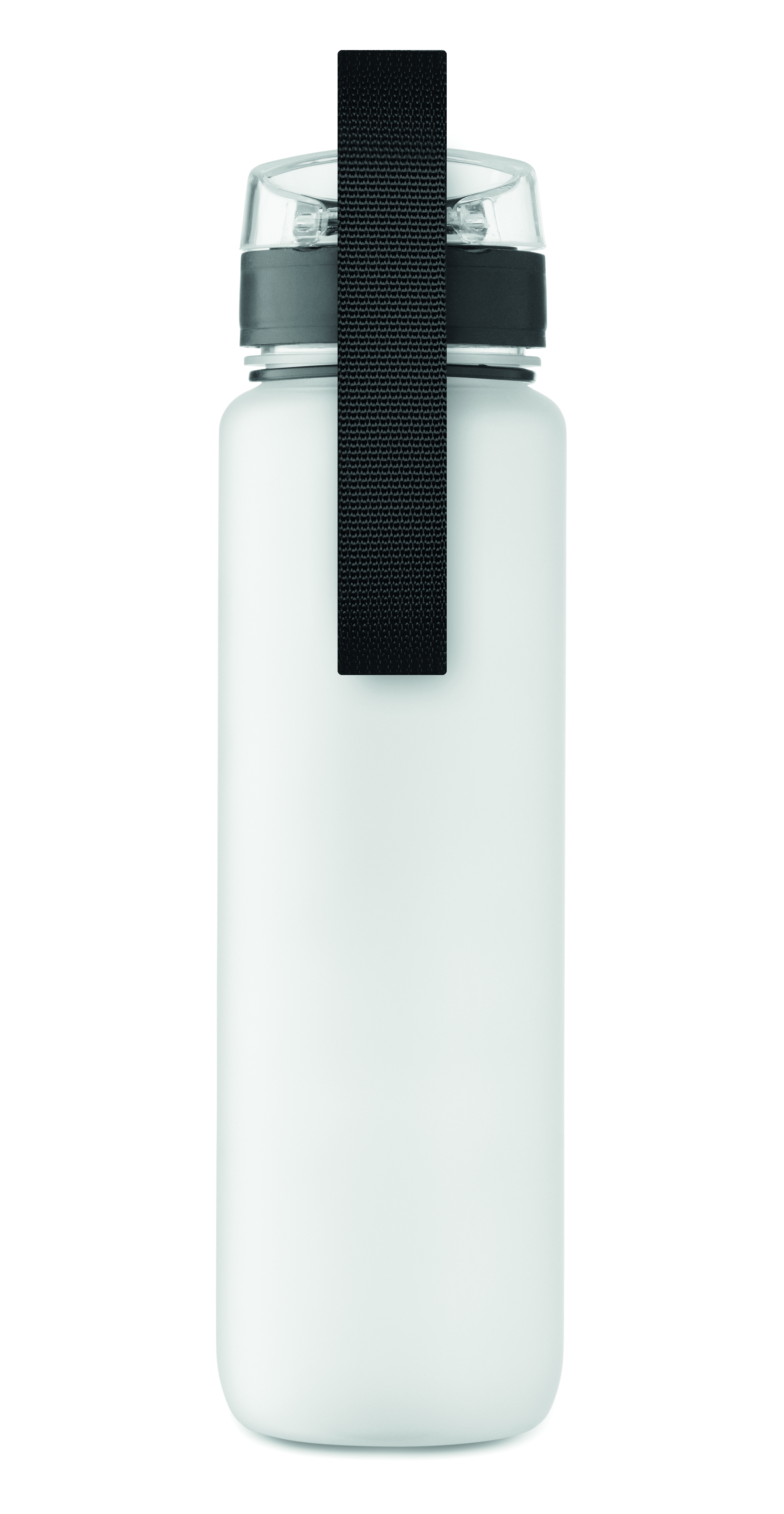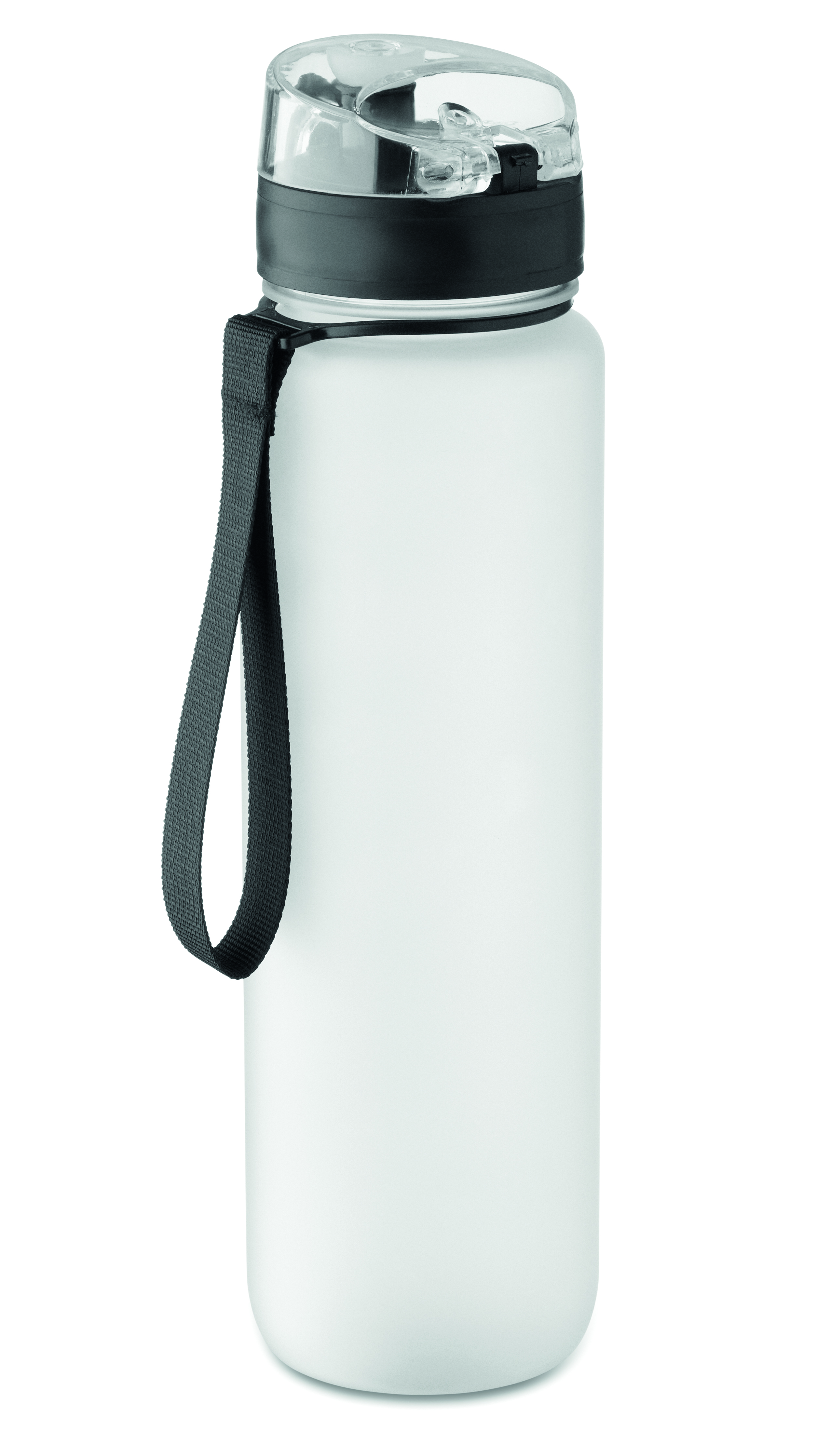 Sportowa butelka na wodę z RPET, motywujące oznaczenia czasu, otwierana jedną ręką klapka, blokada bezpieczeństwa i pasek do przenoszenia. Nie przecieka. Pojemność: 1 l.