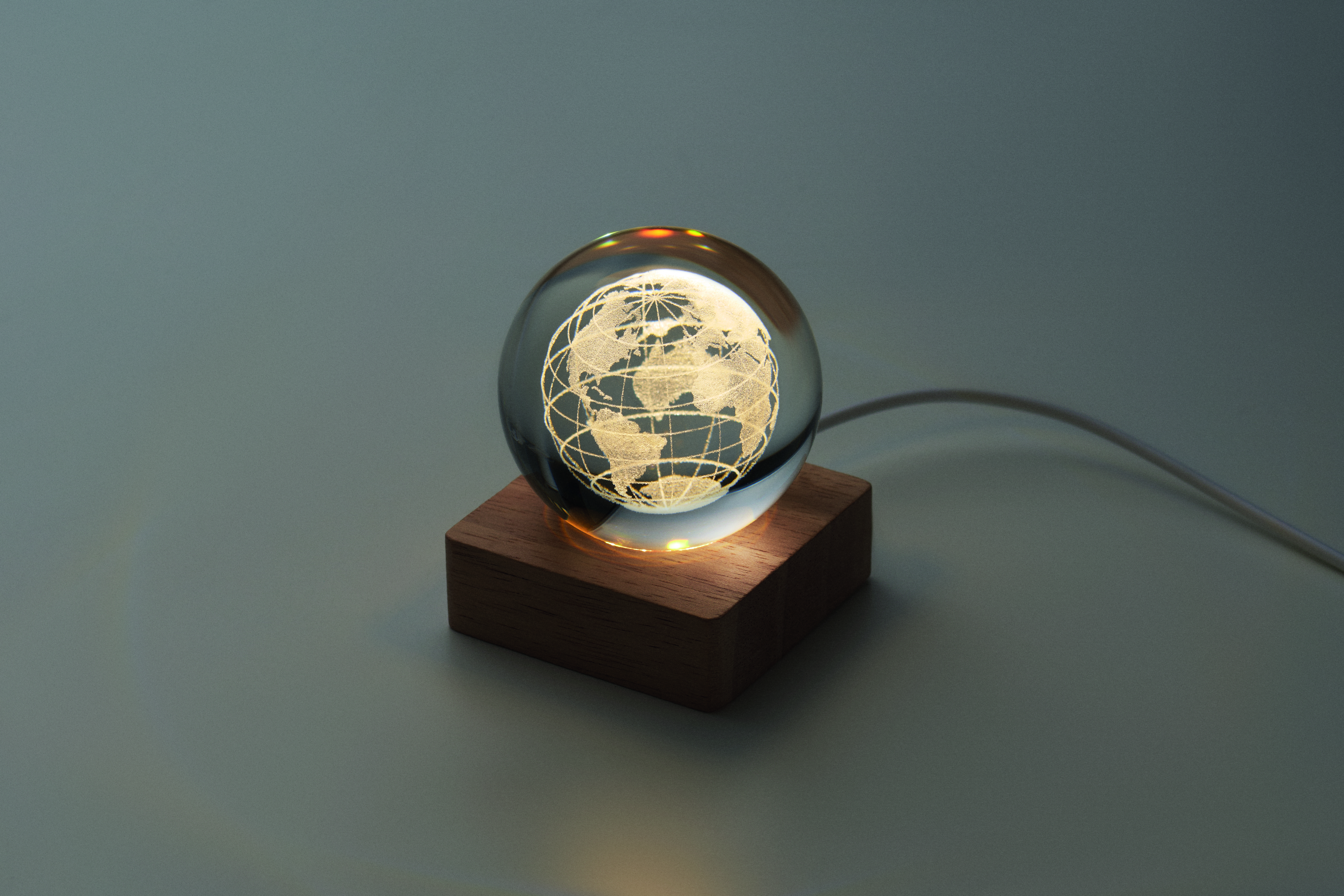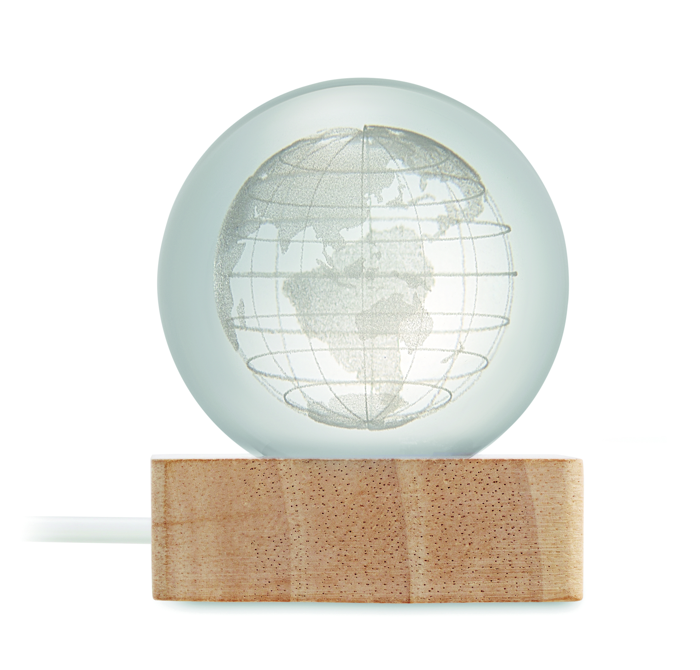 Szklana kula ze światłem LED (100 lumenów) na drewnianej podstawie. W zestawie kabel USB do ładowania (90 cm).