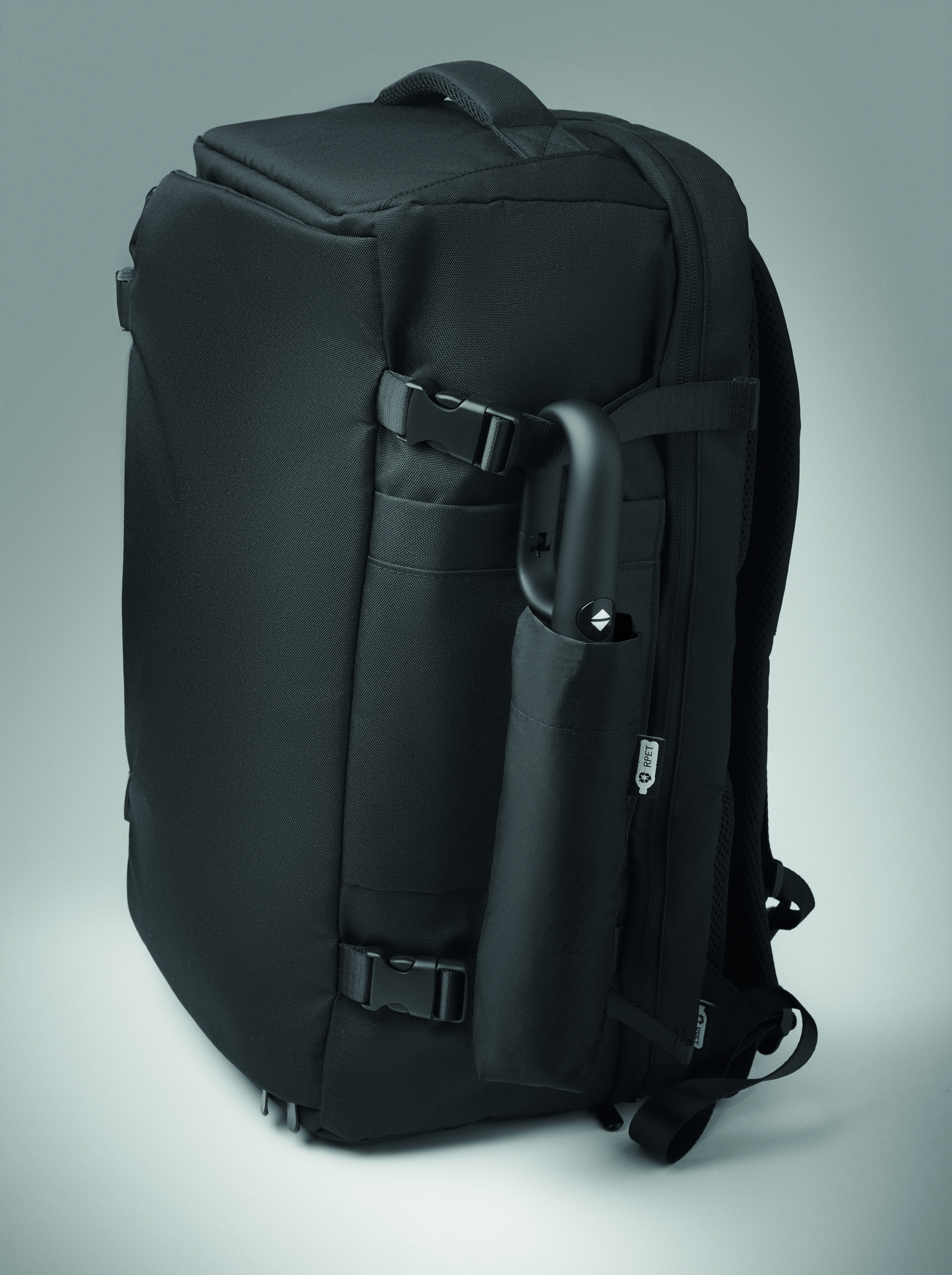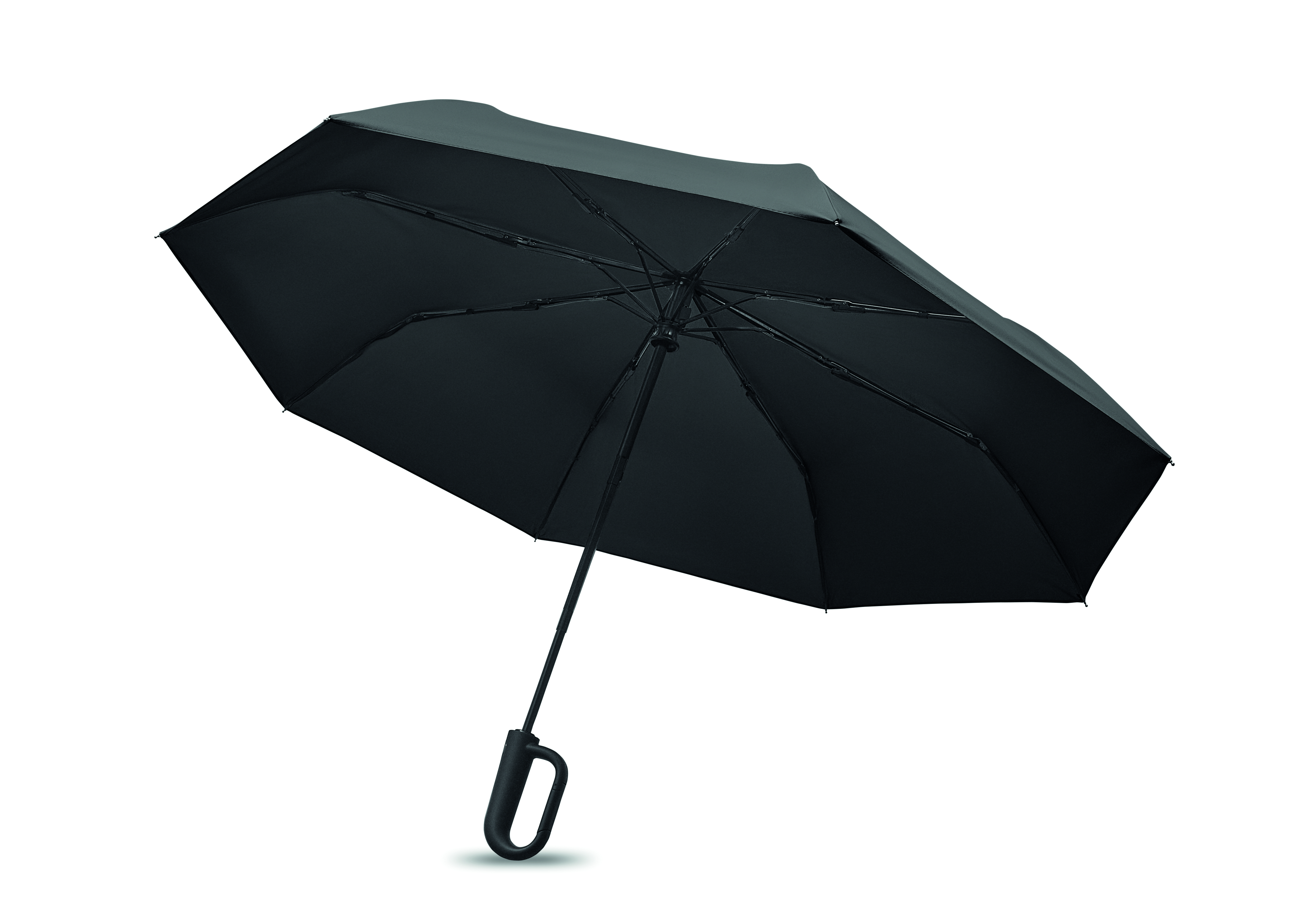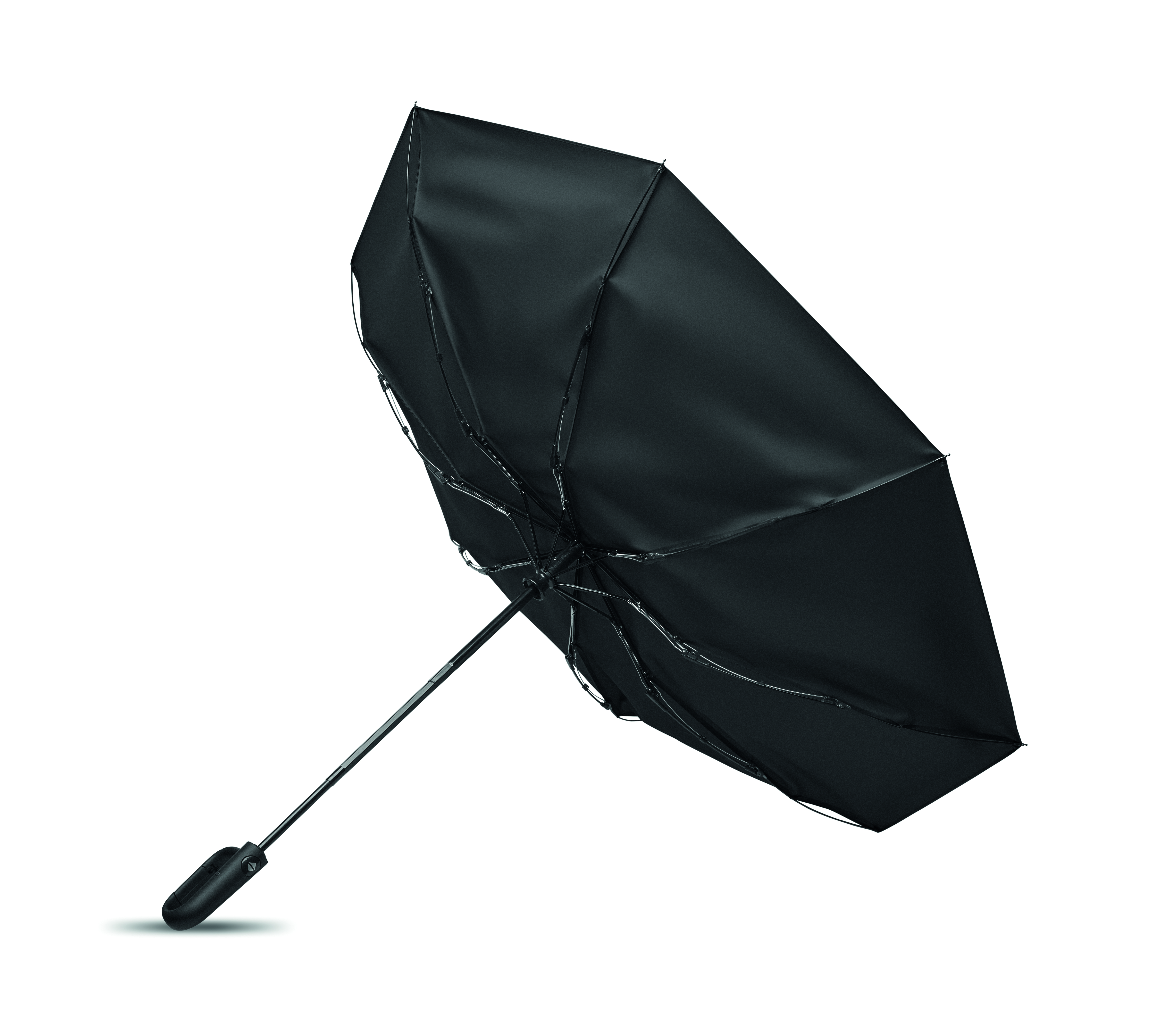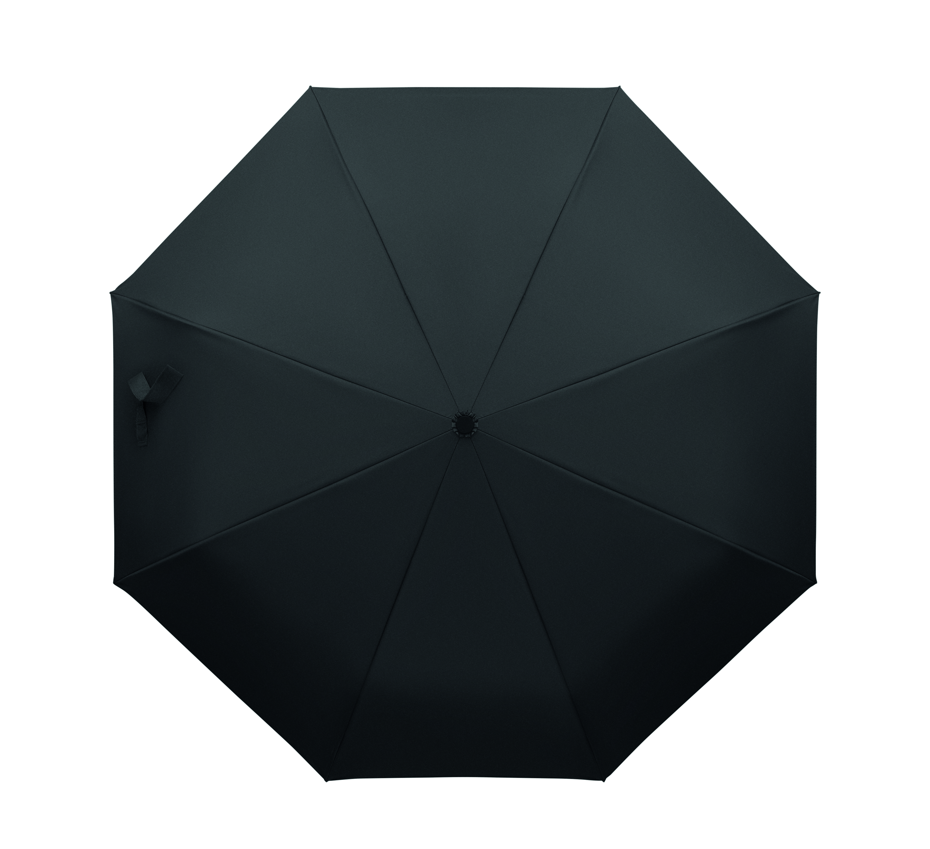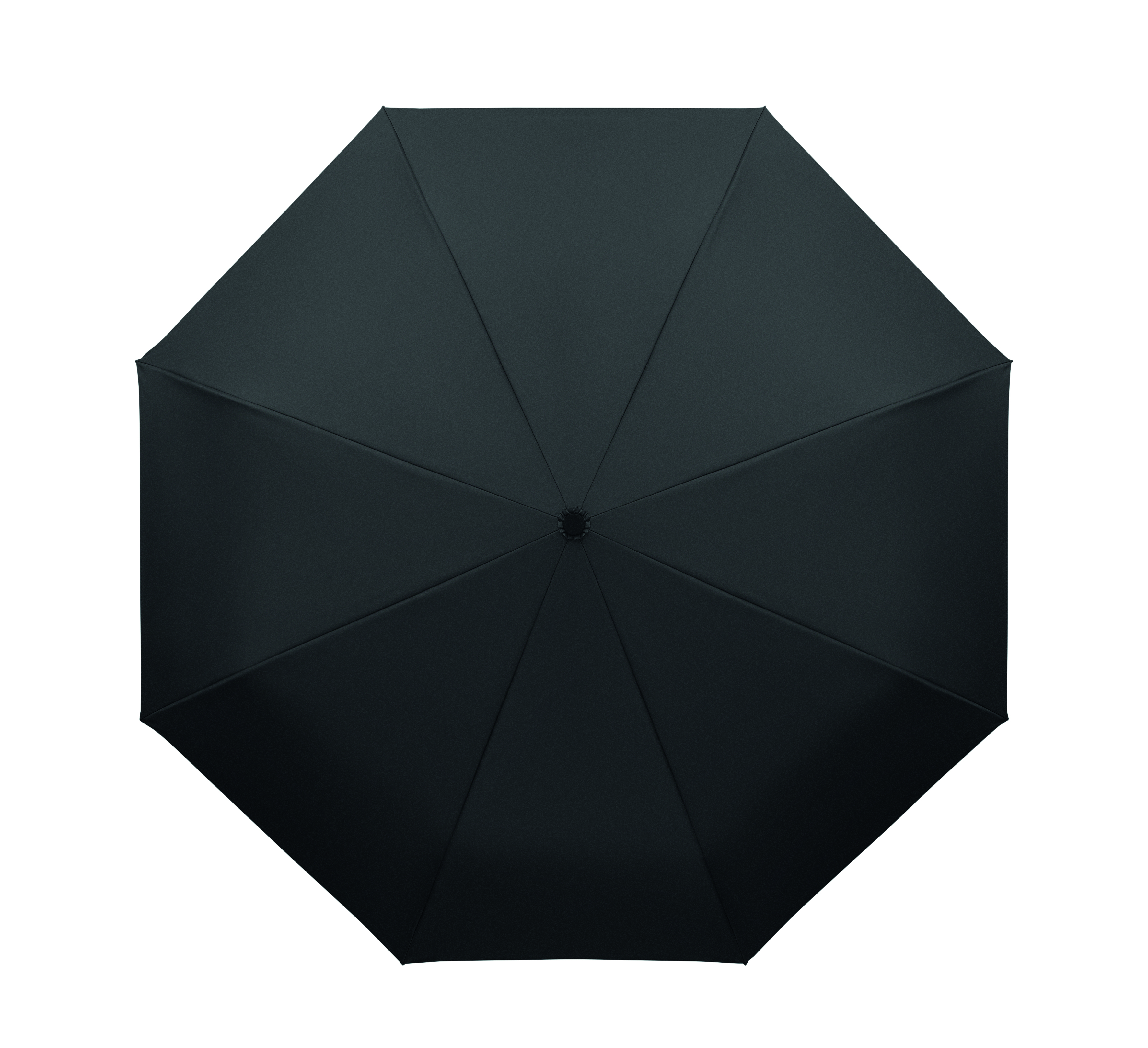 Składany 21-calowy wiatroodporny parasol z pełną czarną ramą z włókna szklanego z 2 sekcjami. Żebra z włókna szklanego. Panele pongee 190T RPET. Uchwyt w kształcie litery D z gumowym wykończeniem. Automatyczne otwieranie i zamykanie. W zestawie pokrowiec.