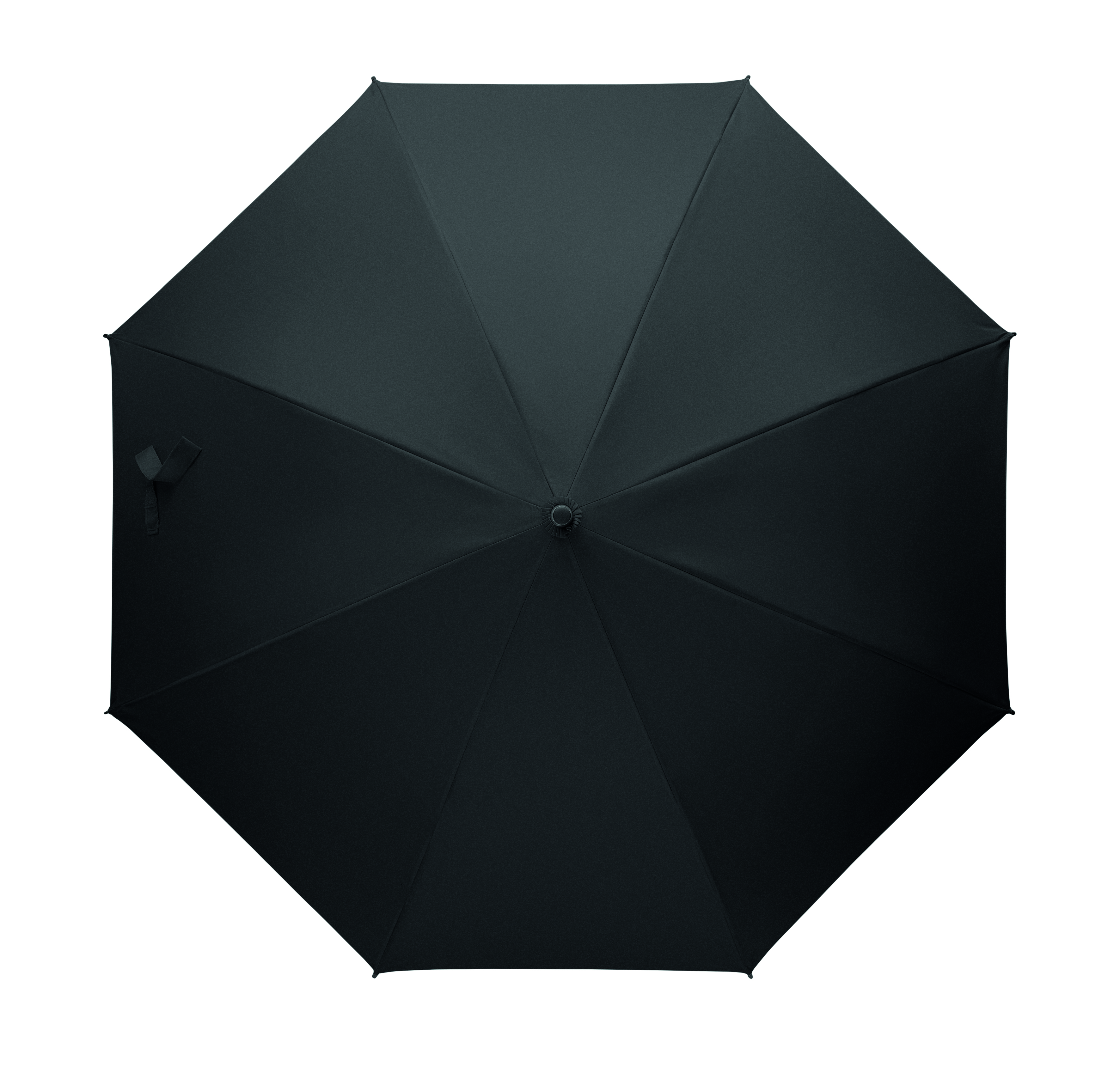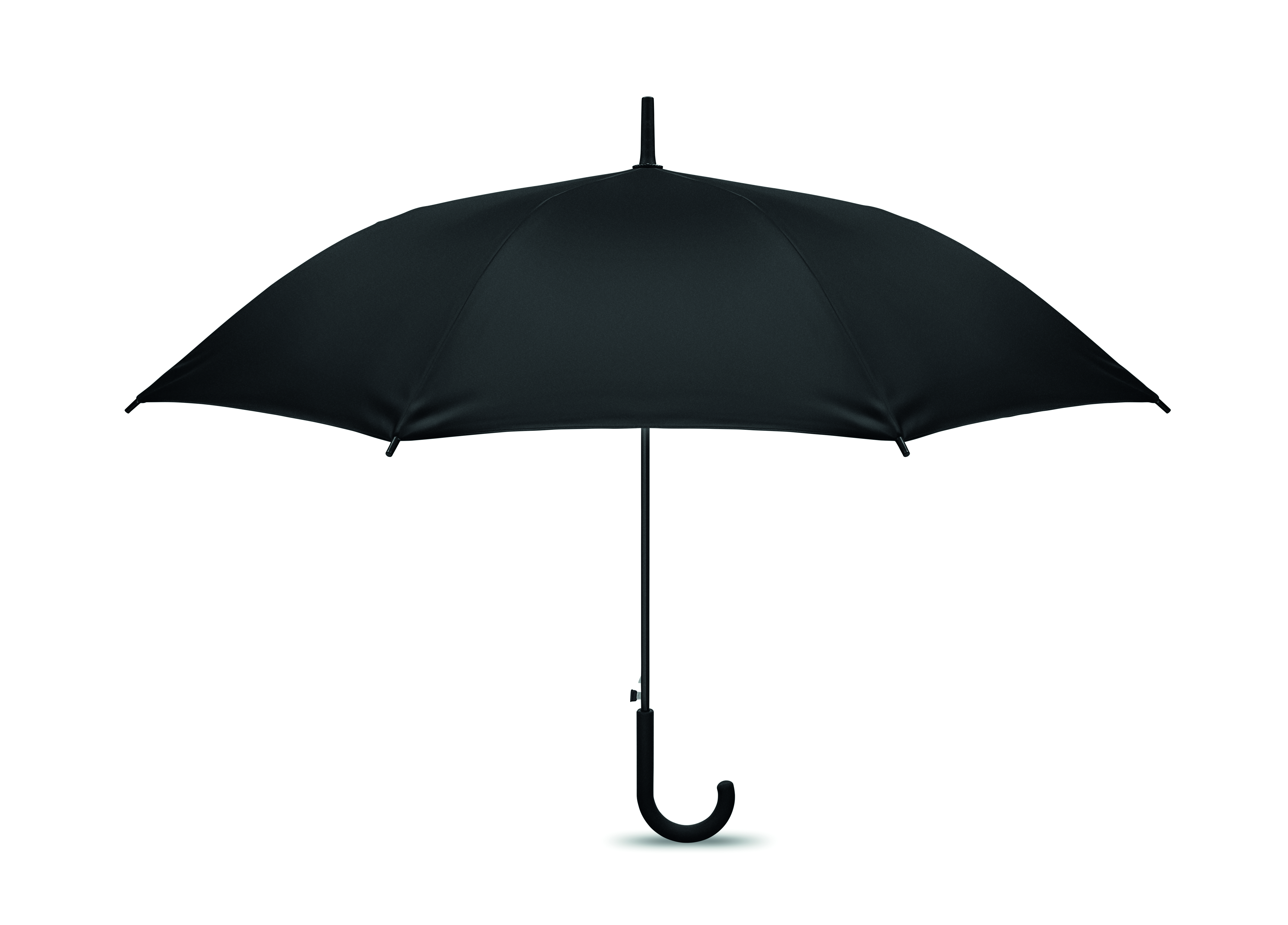 23-calowy prosty, automatycznie otwierany parasol z czarną metalową ramą, żebrami z włókna szklanego i panelami z tkaniny 190T pongee. Plastikowe końcówki i górna część. Gumowany, zakrzywiony uchwyt z tworzywa PP. Ręczne zamknięcie.