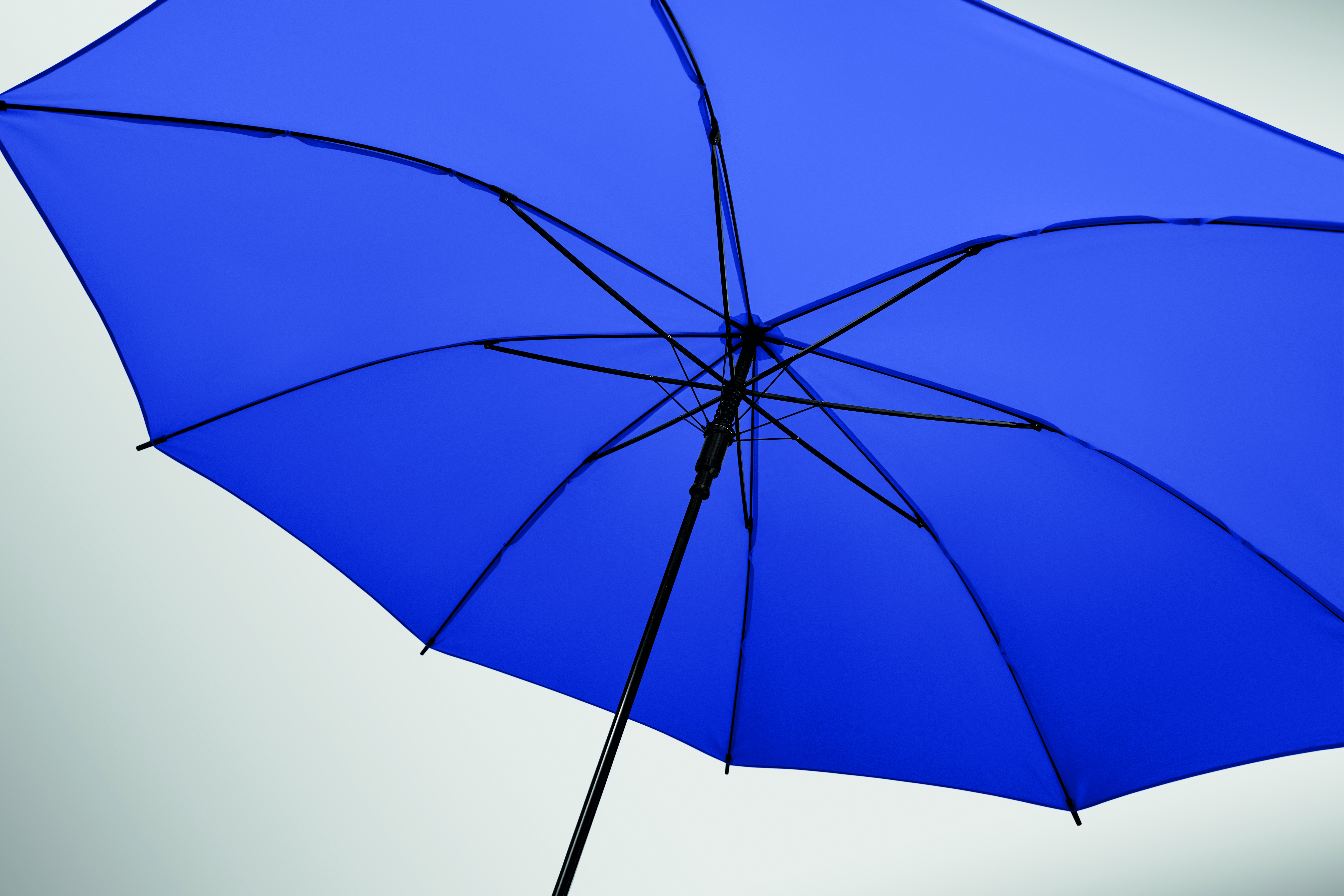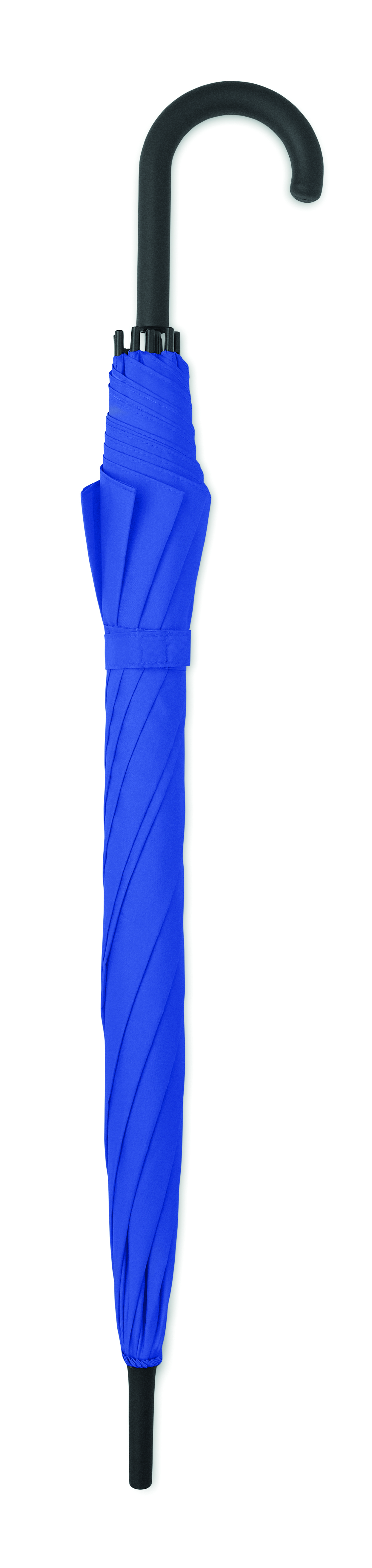 23-calowy prosty, automatycznie otwierany parasol z czarną metalową ramą, żebrami z włókna szklanego i panelami z tkaniny 190T pongee. Plastikowe końcówki i górna część. Gumowany, zakrzywiony uchwyt z tworzywa PP. Ręczne zamknięcie.