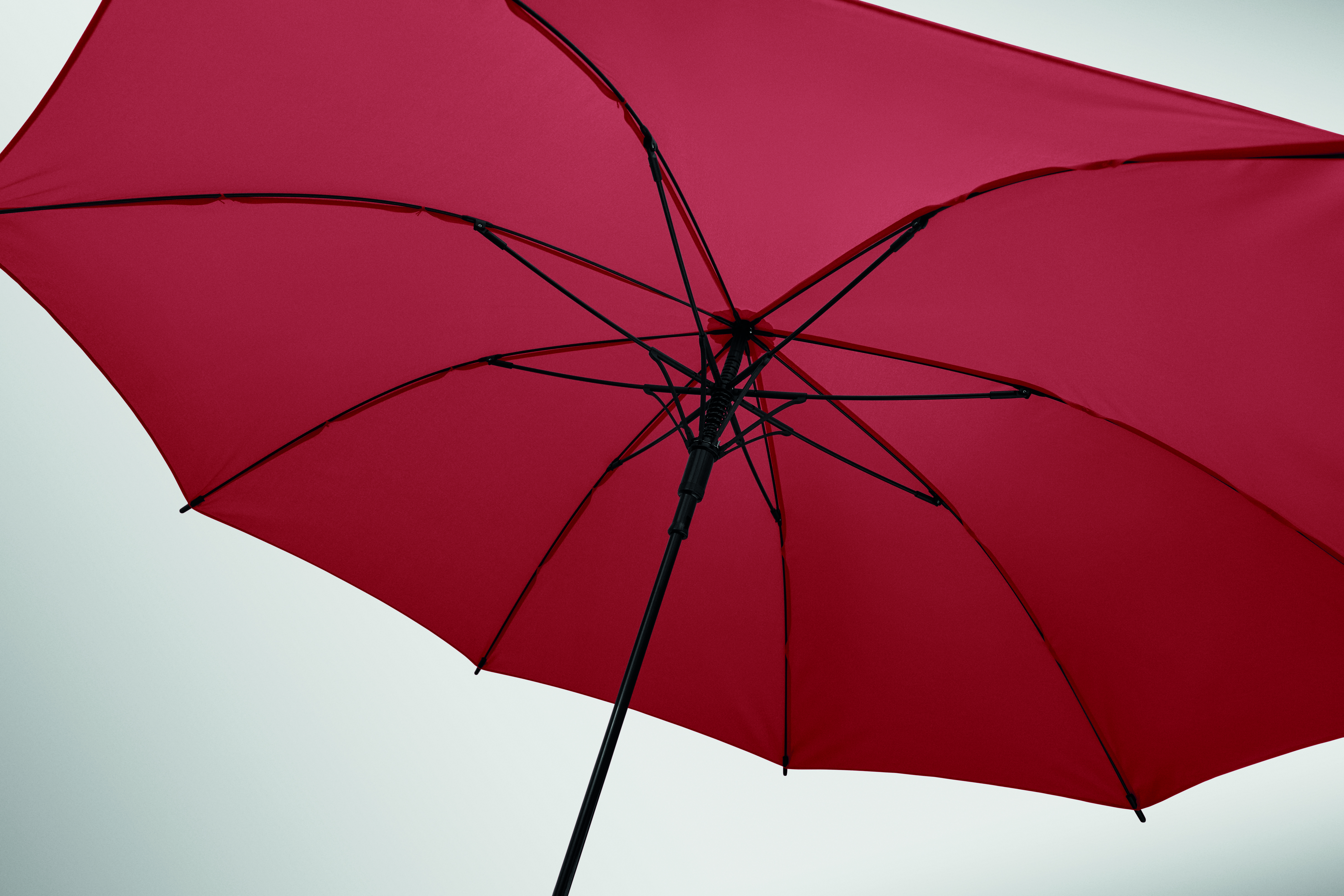 Wiatroodporny parasol o przekątnej 23 cali z automatycznym otwieraniem, stelażem z włókna szklanego i panelami z tkaniny pongee 190T. Plastikowe końcówki i górna część. Gumowany, zakrzywiony uchwyt z tworzywa PP. Ręczne zamknięcie.