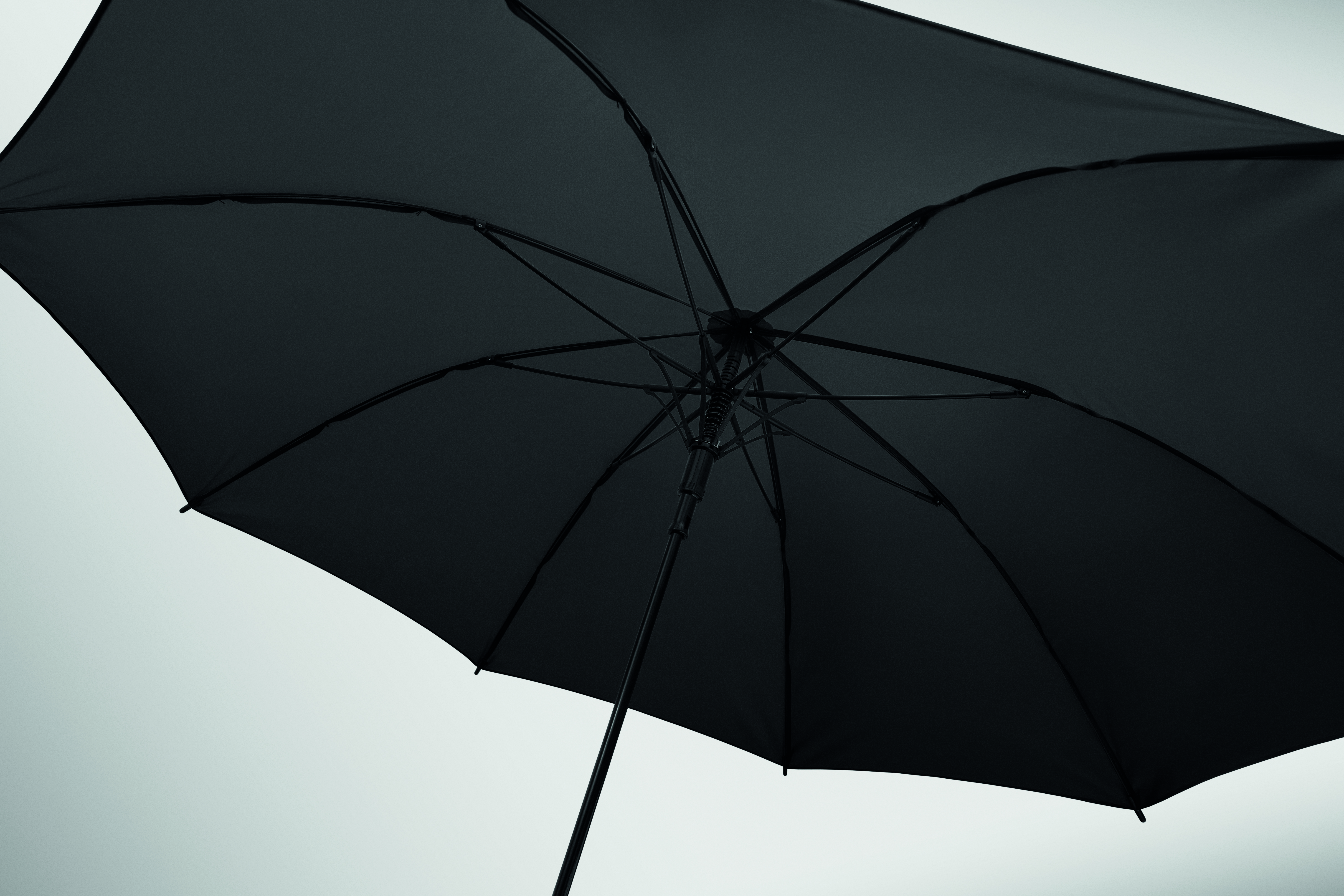 Wiatroodporny parasol o przekątnej 23 cali z automatycznym otwieraniem, stelażem z włókna szklanego i panelami z tkaniny pongee 190T. Plastikowe końcówki i górna część. Gumowany, zakrzywiony uchwyt z tworzywa PP. Ręczne zamknięcie.