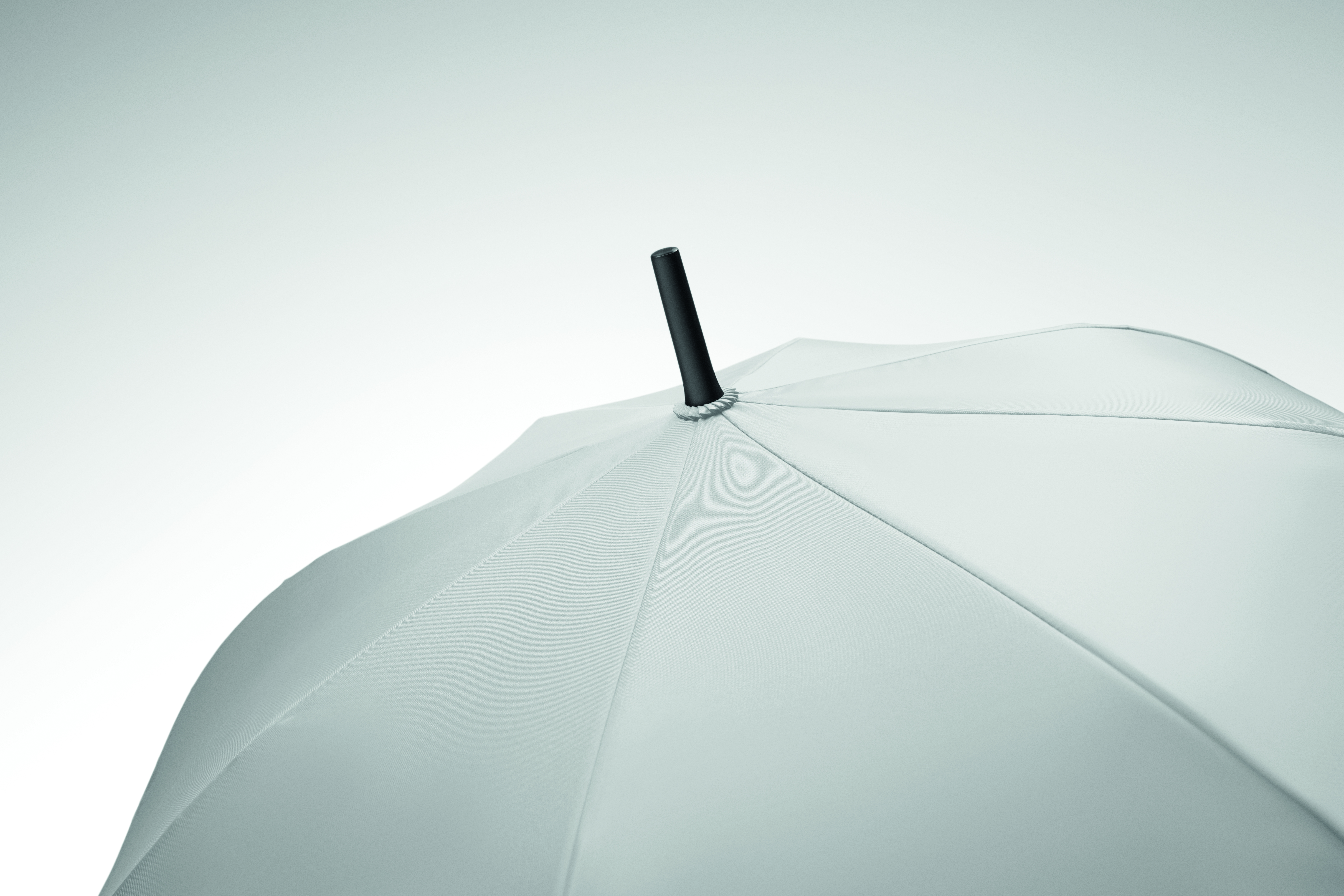 Wiatroodporny parasol o przekątnej 23 cali z automatycznym otwieraniem, stelażem z włókna szklanego i panelami z tkaniny pongee 190T. Plastikowe końcówki i górna część. Gumowany, zakrzywiony uchwyt z tworzywa PP. Ręczne zamknięcie.
