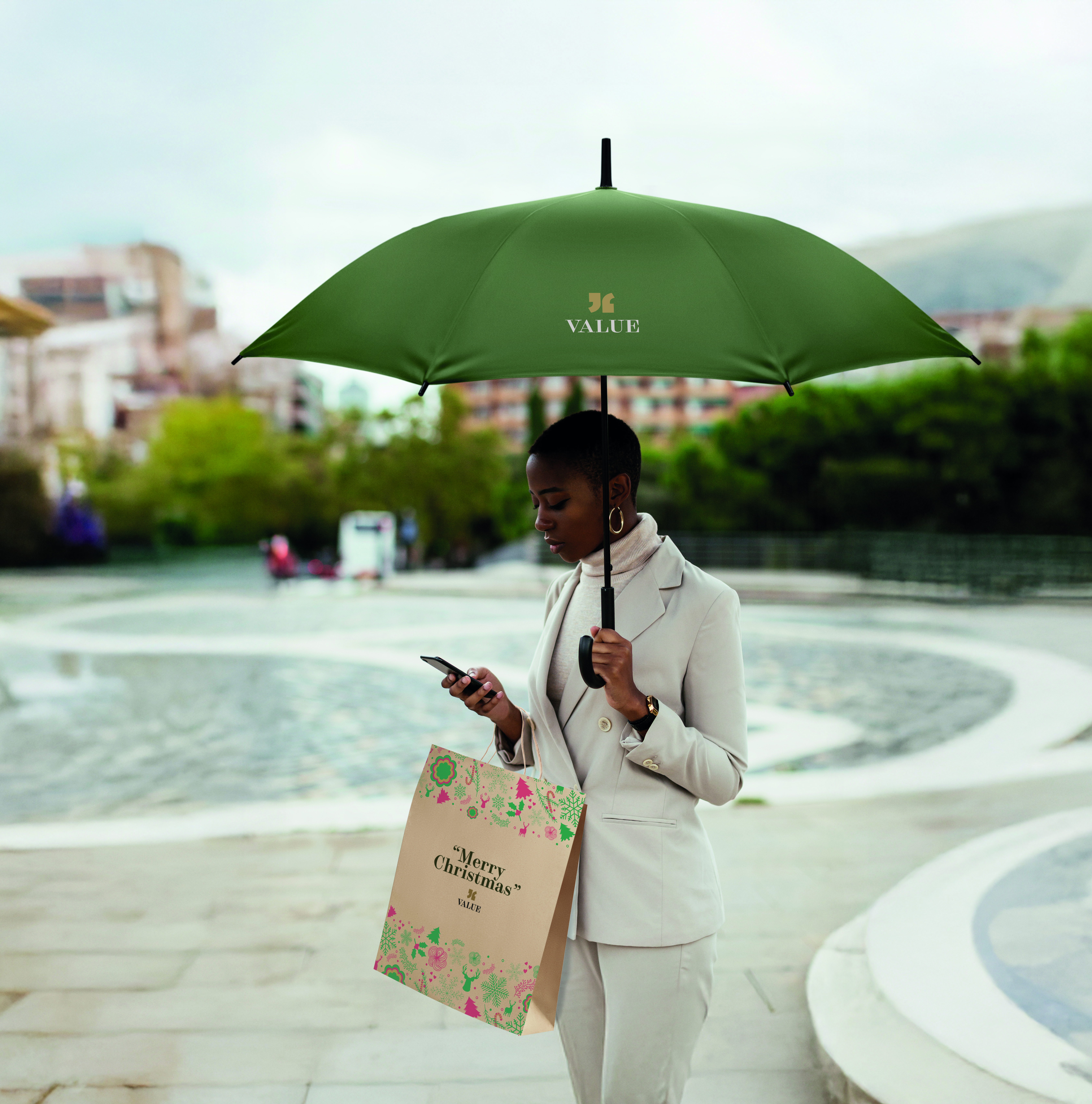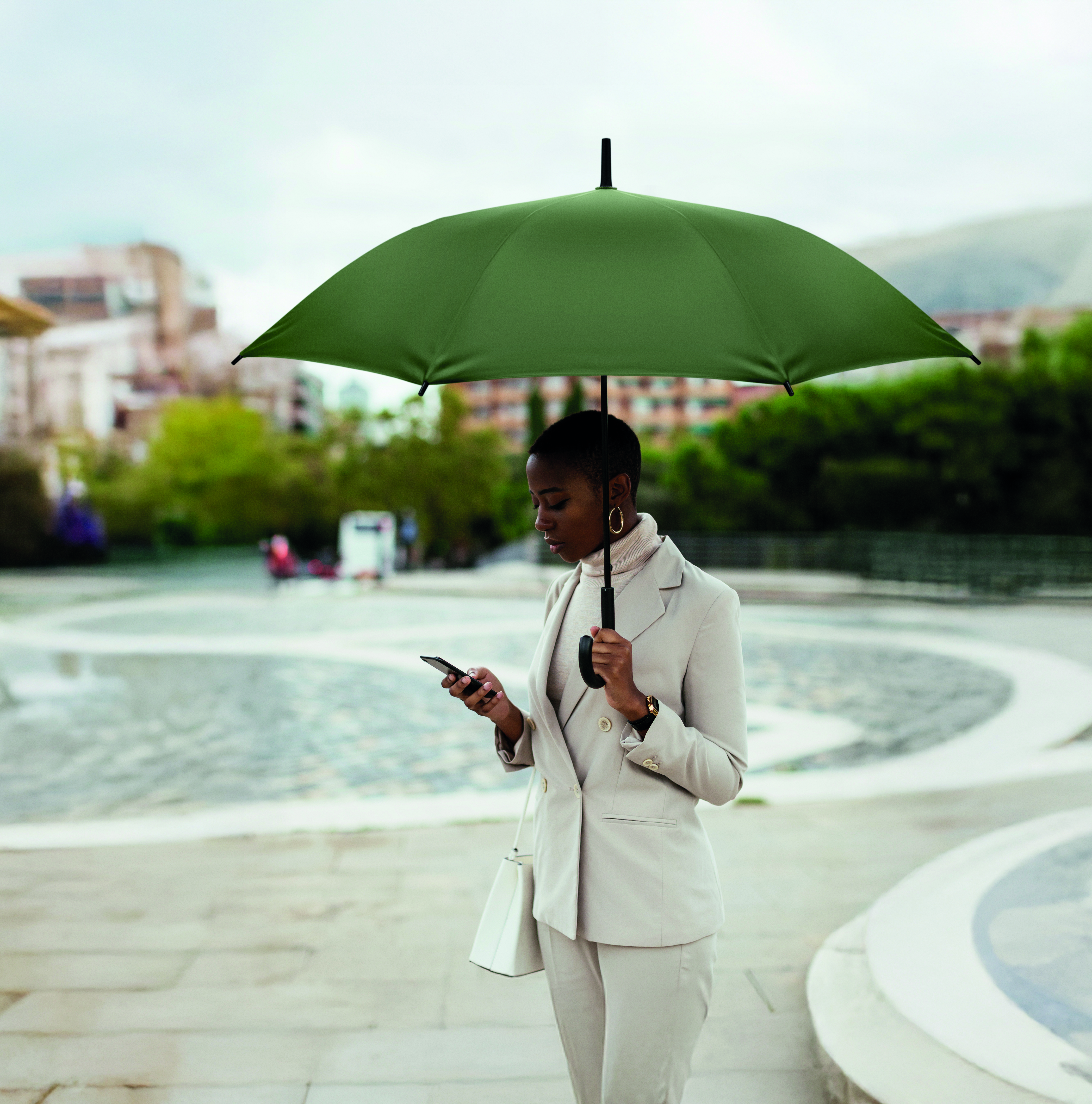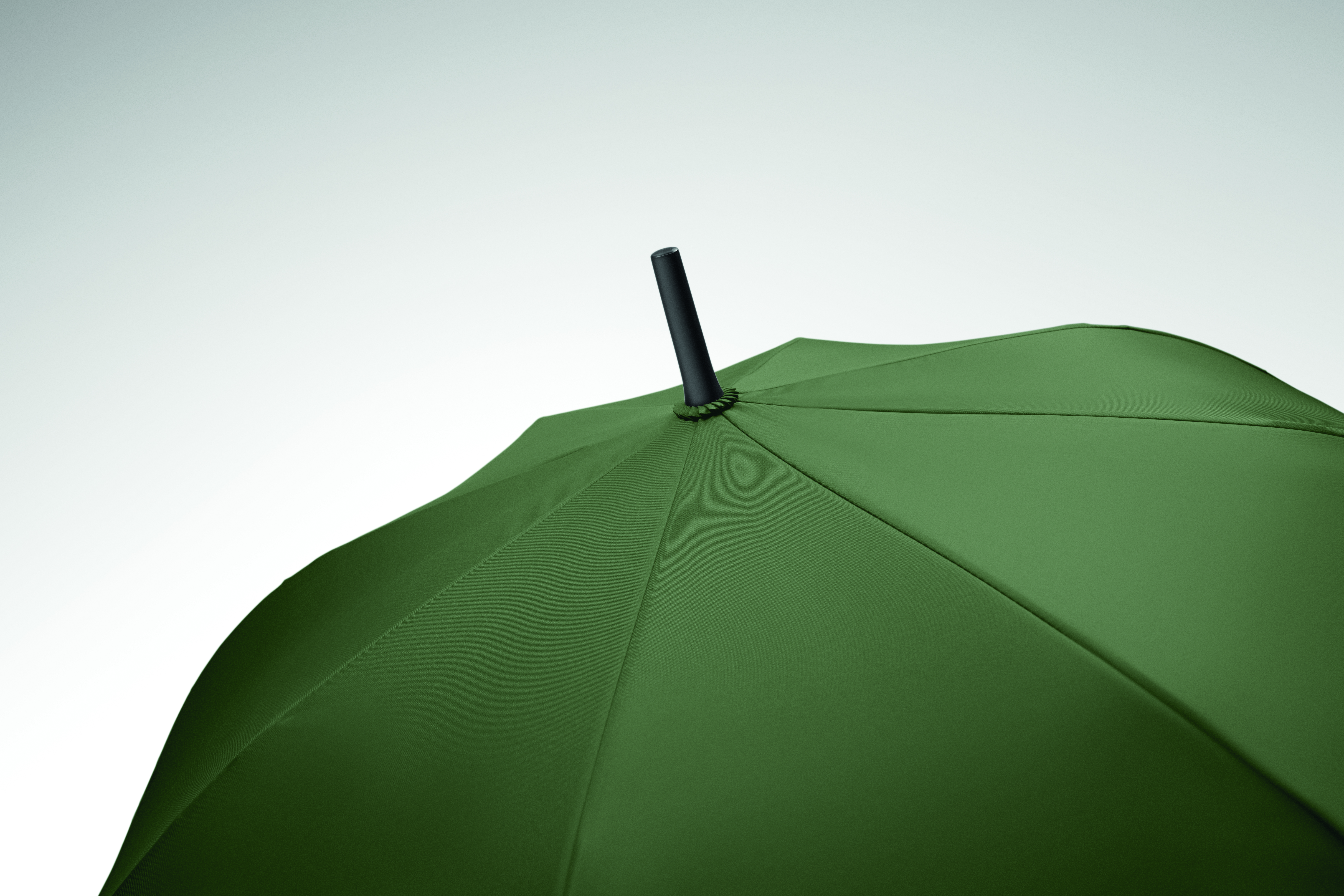 Wiatroodporny parasol o przekątnej 23 cali z automatycznym otwieraniem, stelażem z włókna szklanego i panelami z tkaniny pongee 190T. Plastikowe końcówki i górna część. Gumowany, zakrzywiony uchwyt z tworzywa PP. Ręczne zamknięcie.