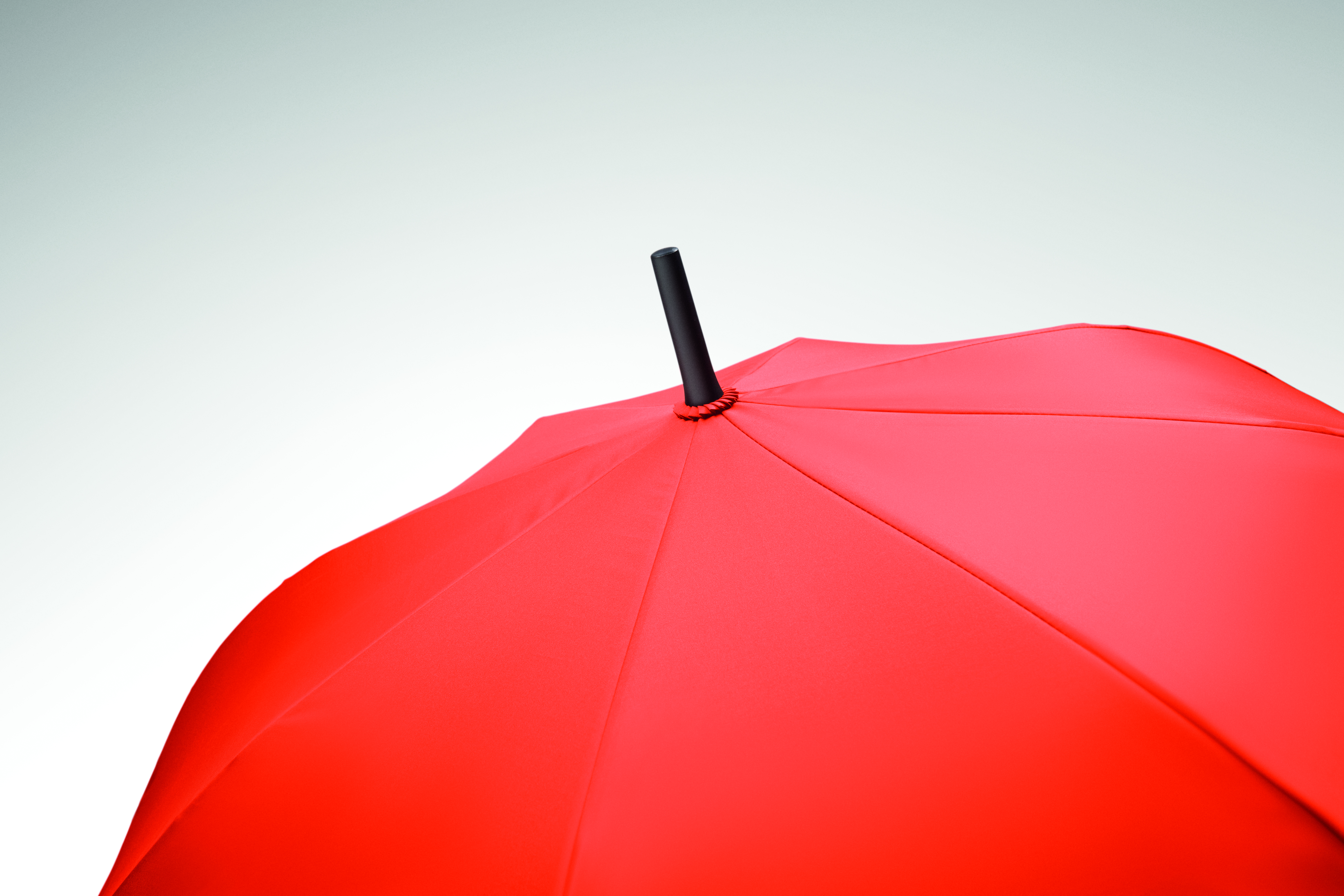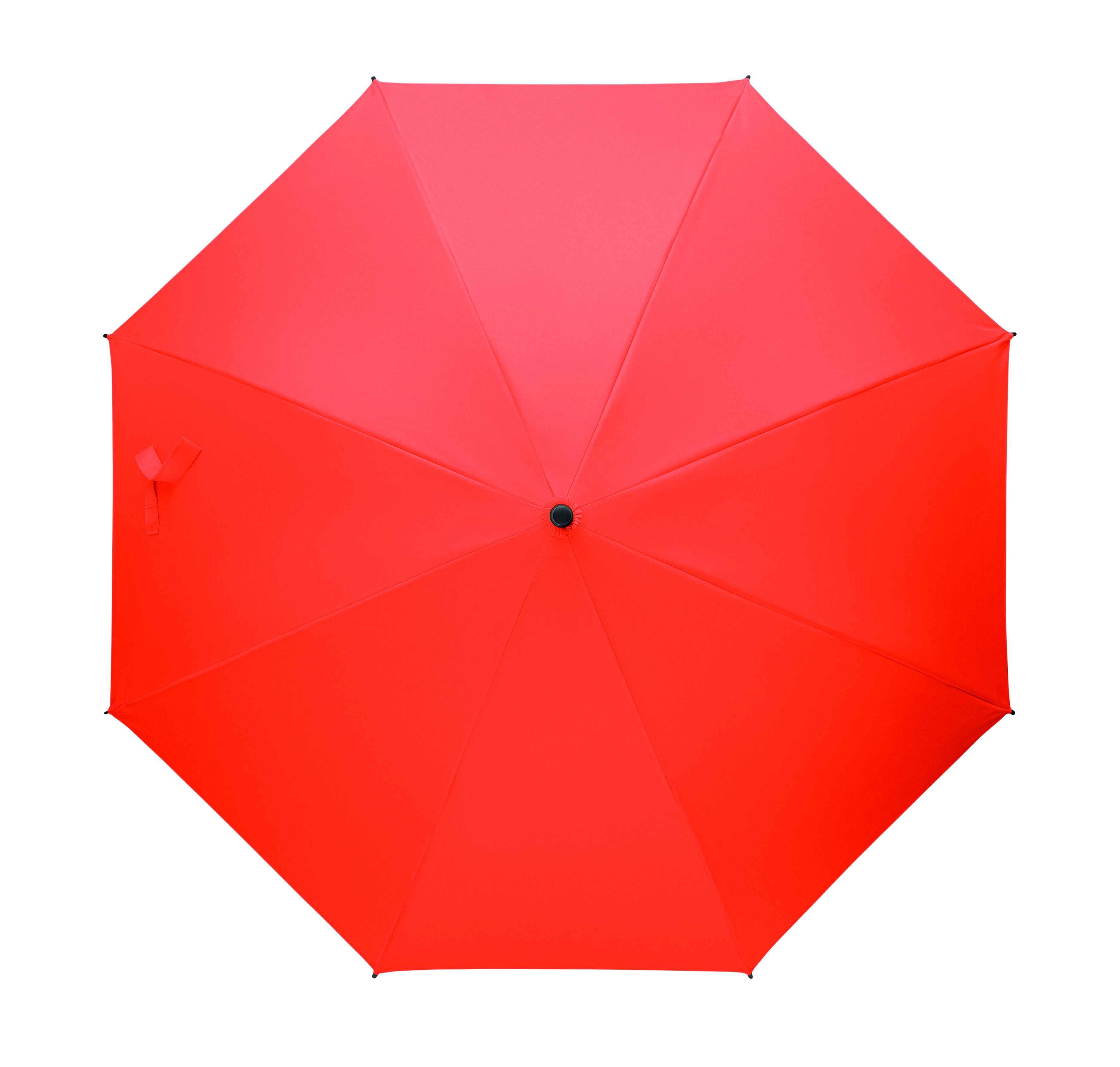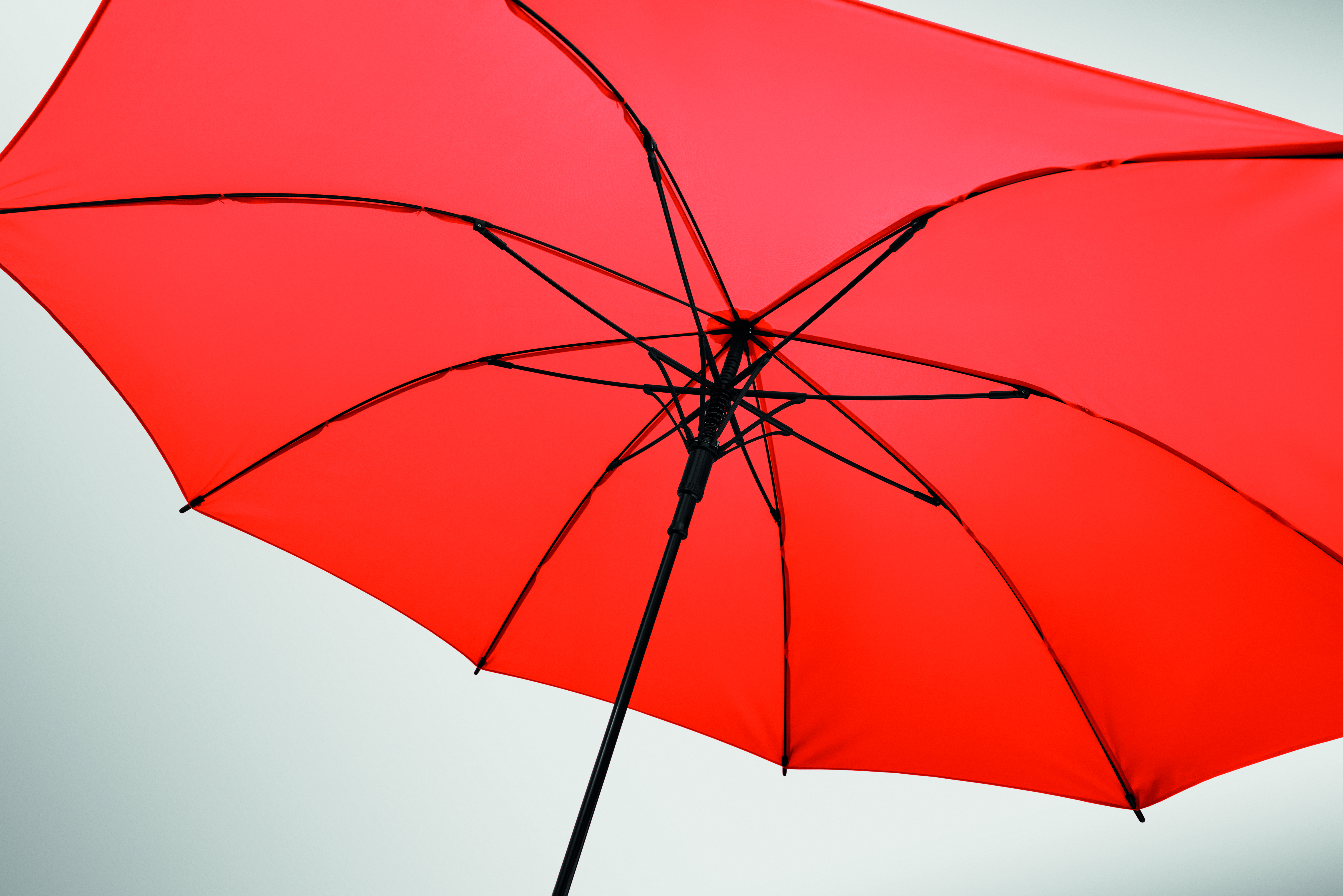 Wiatroodporny parasol o przekątnej 23 cali z automatycznym otwieraniem, stelażem z włókna szklanego i panelami z tkaniny pongee 190T. Plastikowe końcówki i górna część. Gumowany, zakrzywiony uchwyt z tworzywa PP. Ręczne zamknięcie.