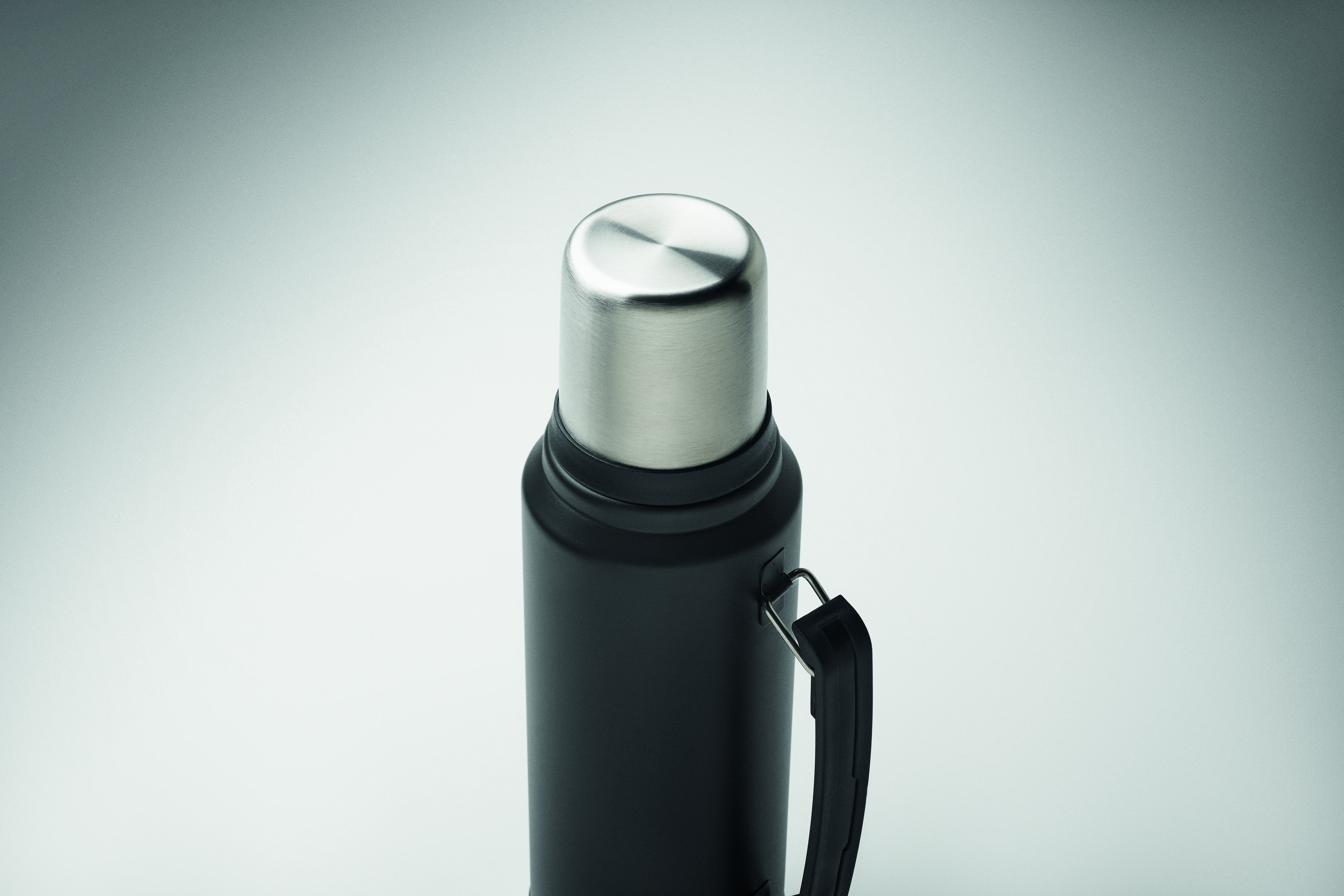 Dwuścienny termos z izolacją próżniową wykonany ze stali nierdzewnej z recyklingu (90% stali nierdzewnej pochodzącej z recyklingu i 10% stali nierdzewnej) z uchwytem z boku. Z pokrywką z PP i kubkiem z recyklingowanej stali nierdzewnej. Nie przecieka. Pojemność: 1 l.