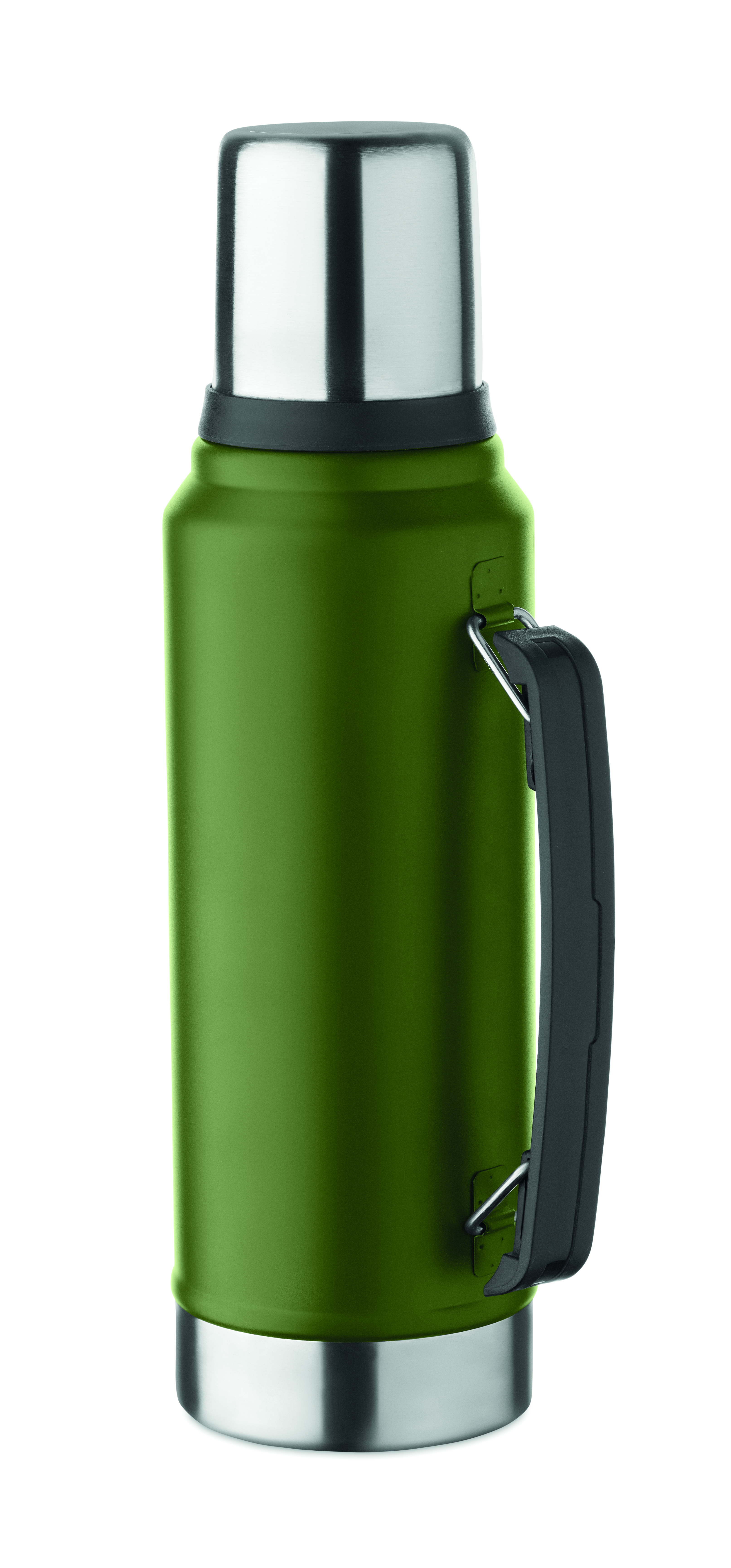 Dwuścienny termos z izolacją próżniową wykonany ze stali nierdzewnej z recyklingu (90% stali nierdzewnej pochodzącej z recyklingu i 10% stali nierdzewnej) z uchwytem z boku. Z pokrywką z PP i kubkiem z recyklingowanej stali nierdzewnej. Nie przecieka. Pojemność: 1 l.