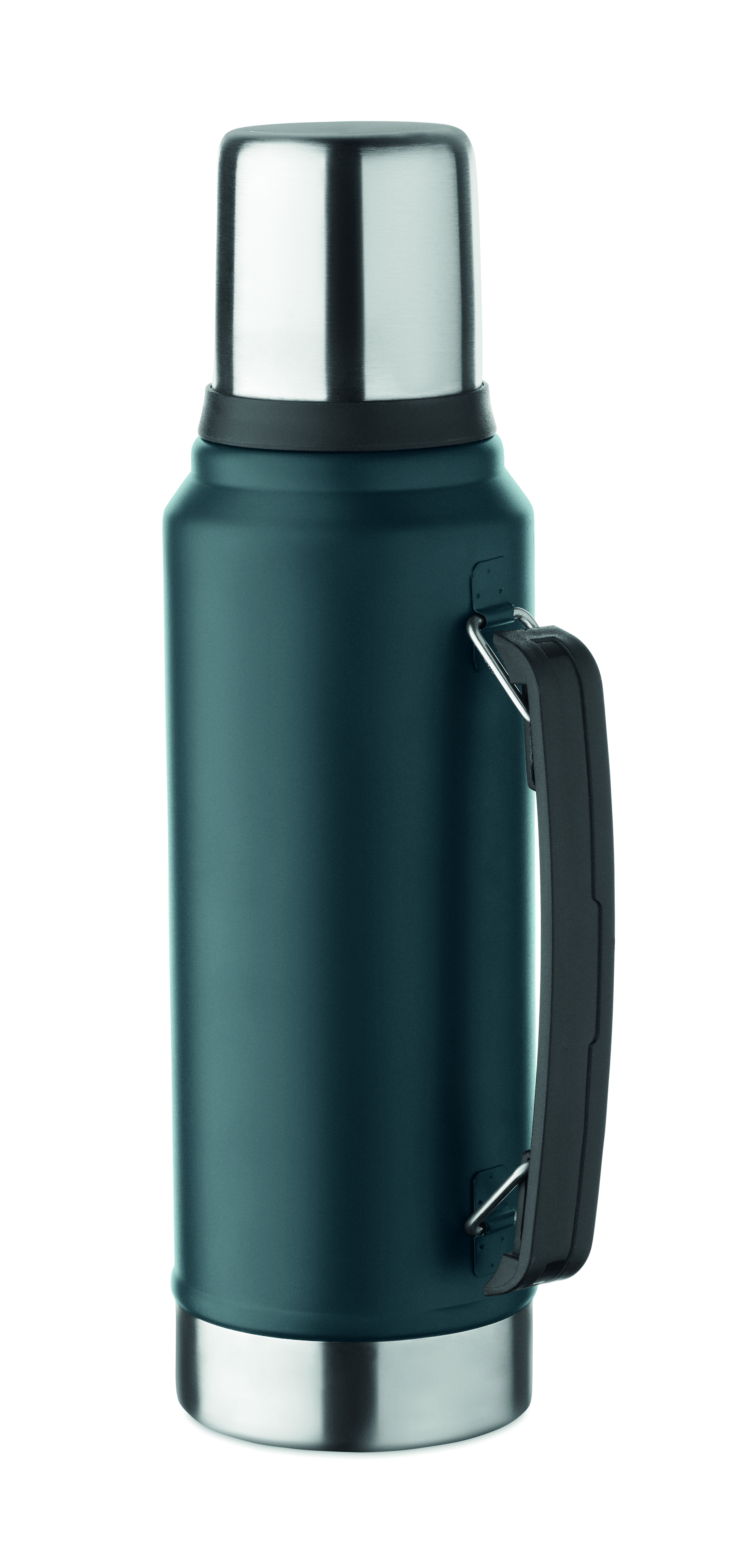 Dwuścienny termos z izolacją próżniową wykonany ze stali nierdzewnej z recyklingu (90% stali nierdzewnej pochodzącej z recyklingu i 10% stali nierdzewnej) z uchwytem z boku. Z pokrywką z PP i kubkiem z recyklingowanej stali nierdzewnej. Nie przecieka. Pojemność: 1 l.