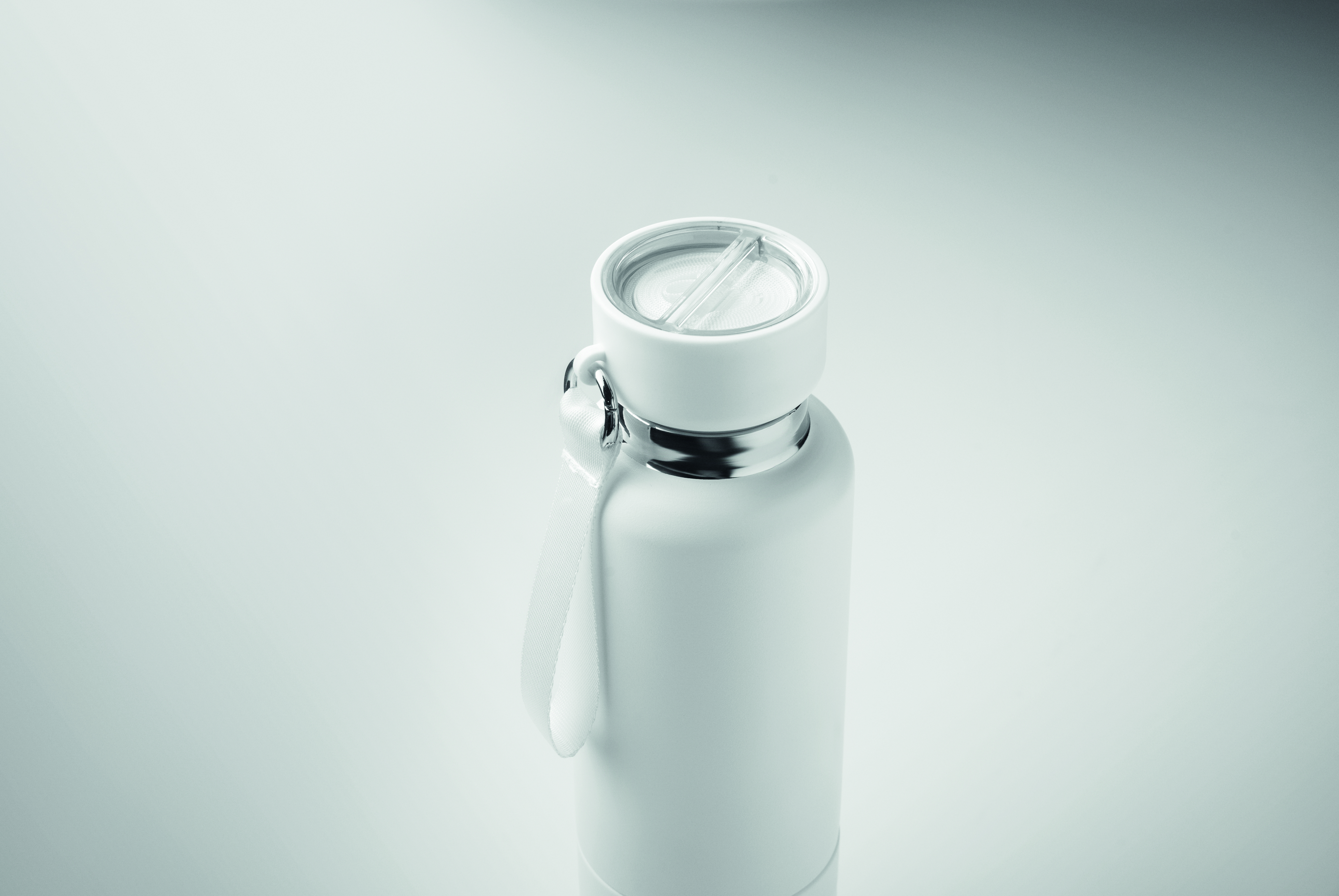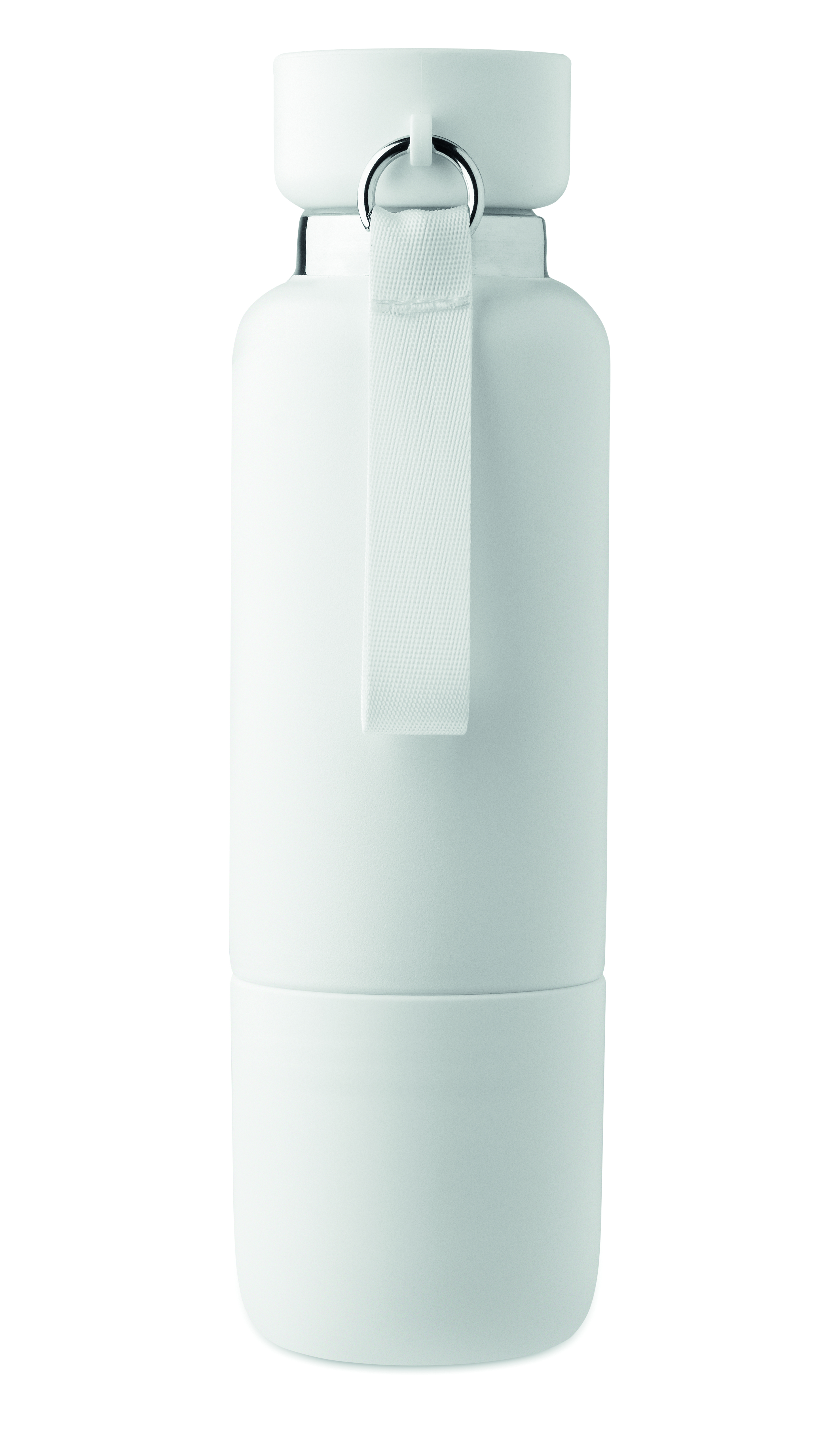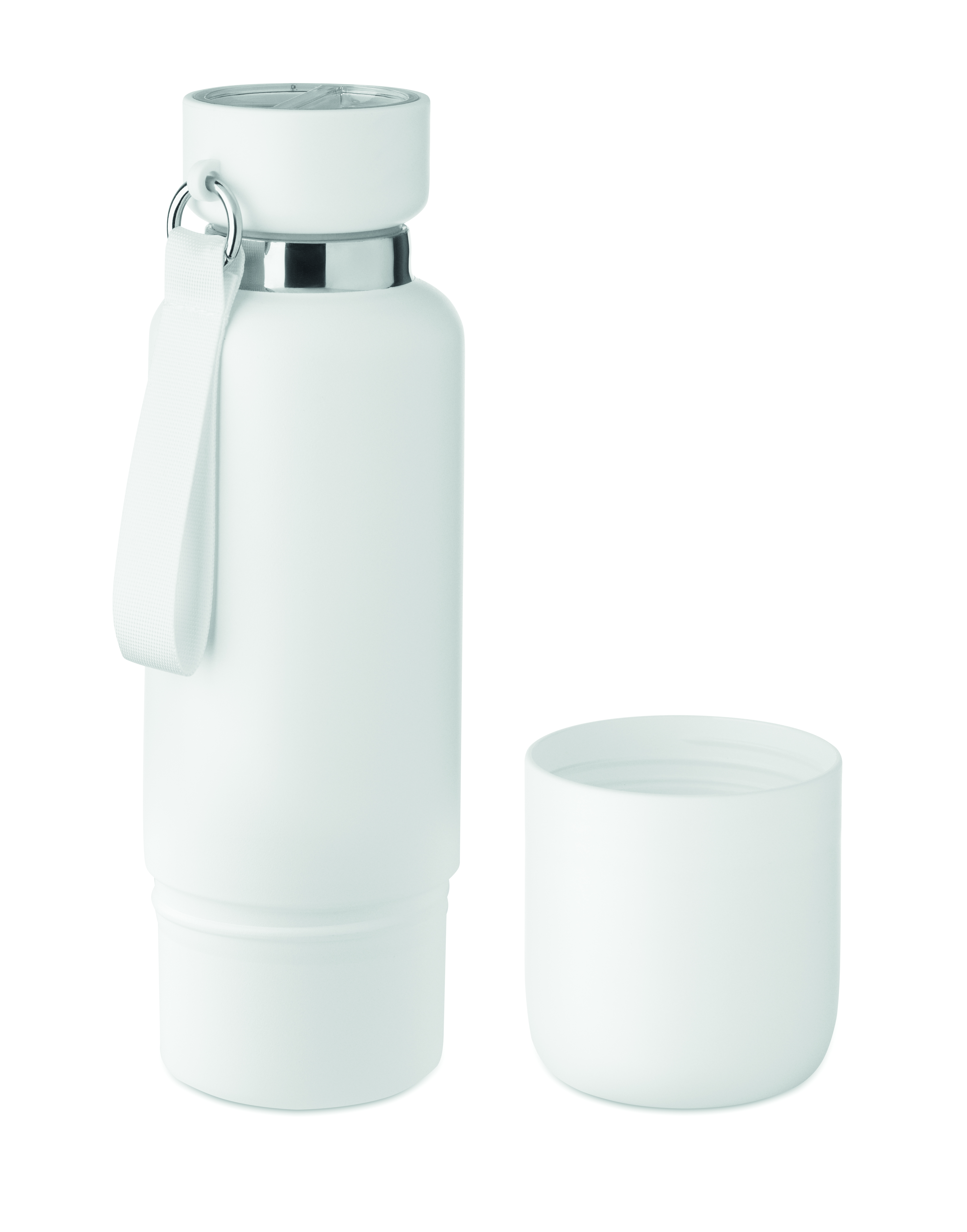 Dwuścienna izolowana butelka wykonana w 90% ze stali nierdzewnej pochodzącej z recyklingu i w 10% ze stali nierdzewnej, ze zintegrowanym uchwytem z paskiem i dodatkowym długim paskiem (70 cm) w pokrywie z PP. Nie przecieka. W zestawie dolny kubek. Pojemność: 500 ml.