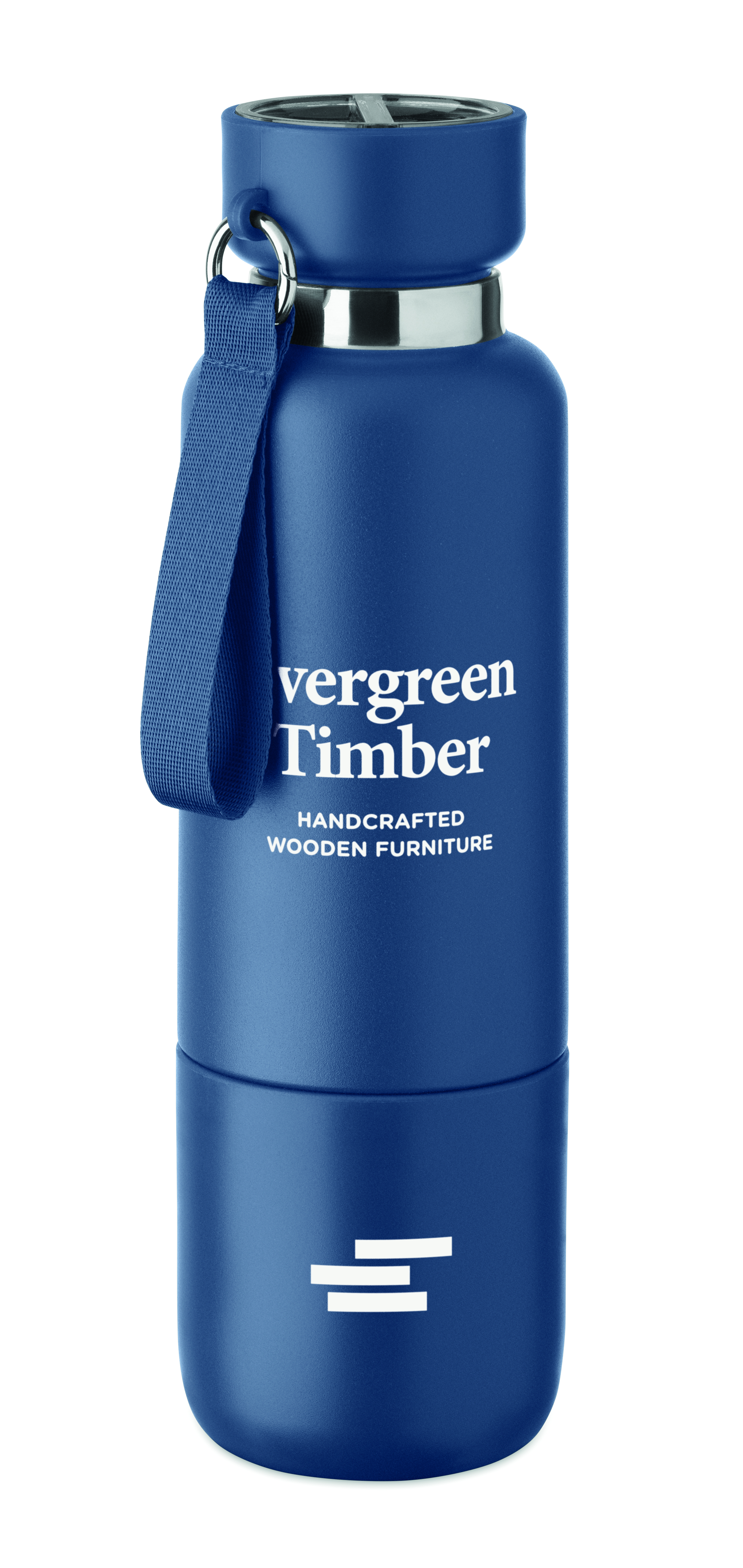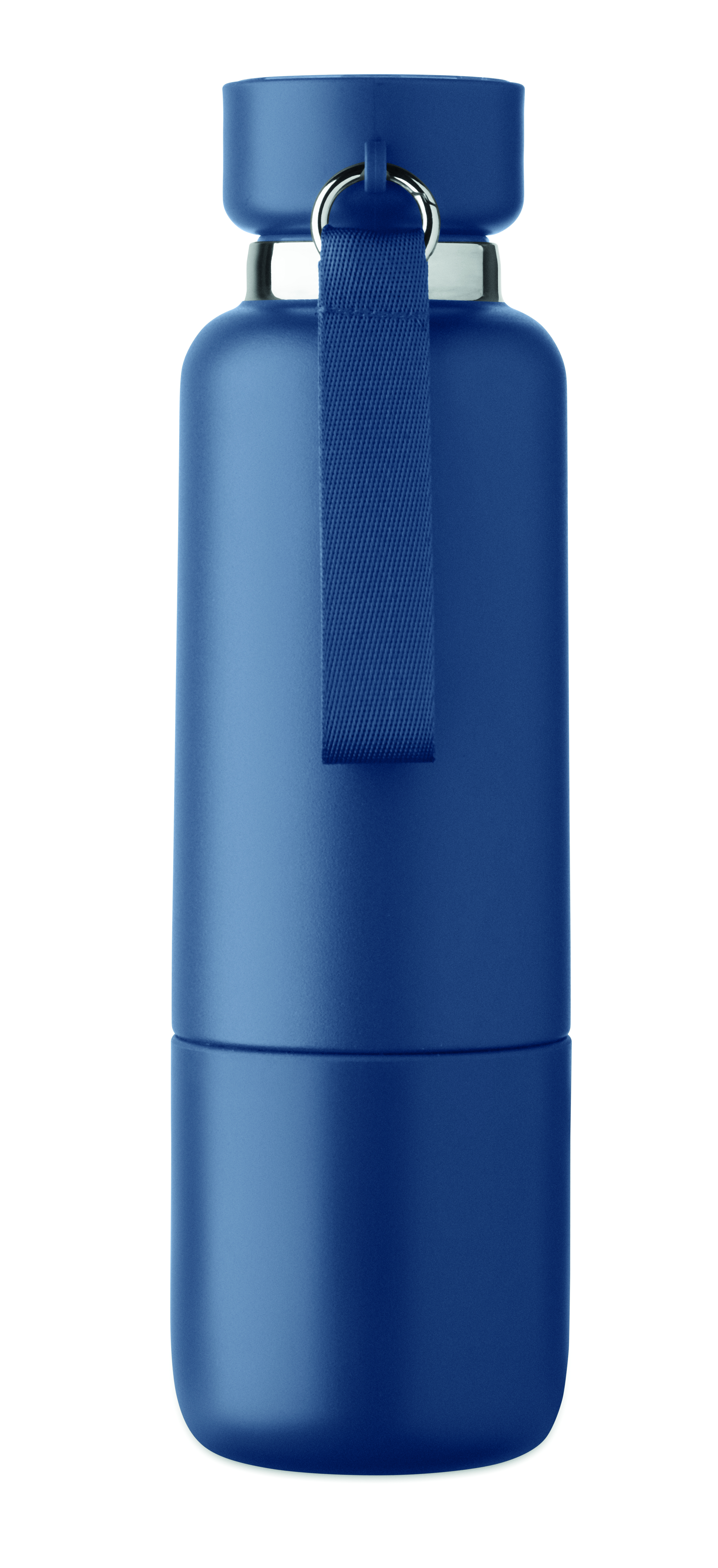 Dwuścienna izolowana butelka wykonana w 90% ze stali nierdzewnej pochodzącej z recyklingu i w 10% ze stali nierdzewnej, ze zintegrowanym uchwytem z paskiem i dodatkowym długim paskiem (70 cm) w pokrywie z PP. Nie przecieka. W zestawie dolny kubek. Pojemność: 500 ml.