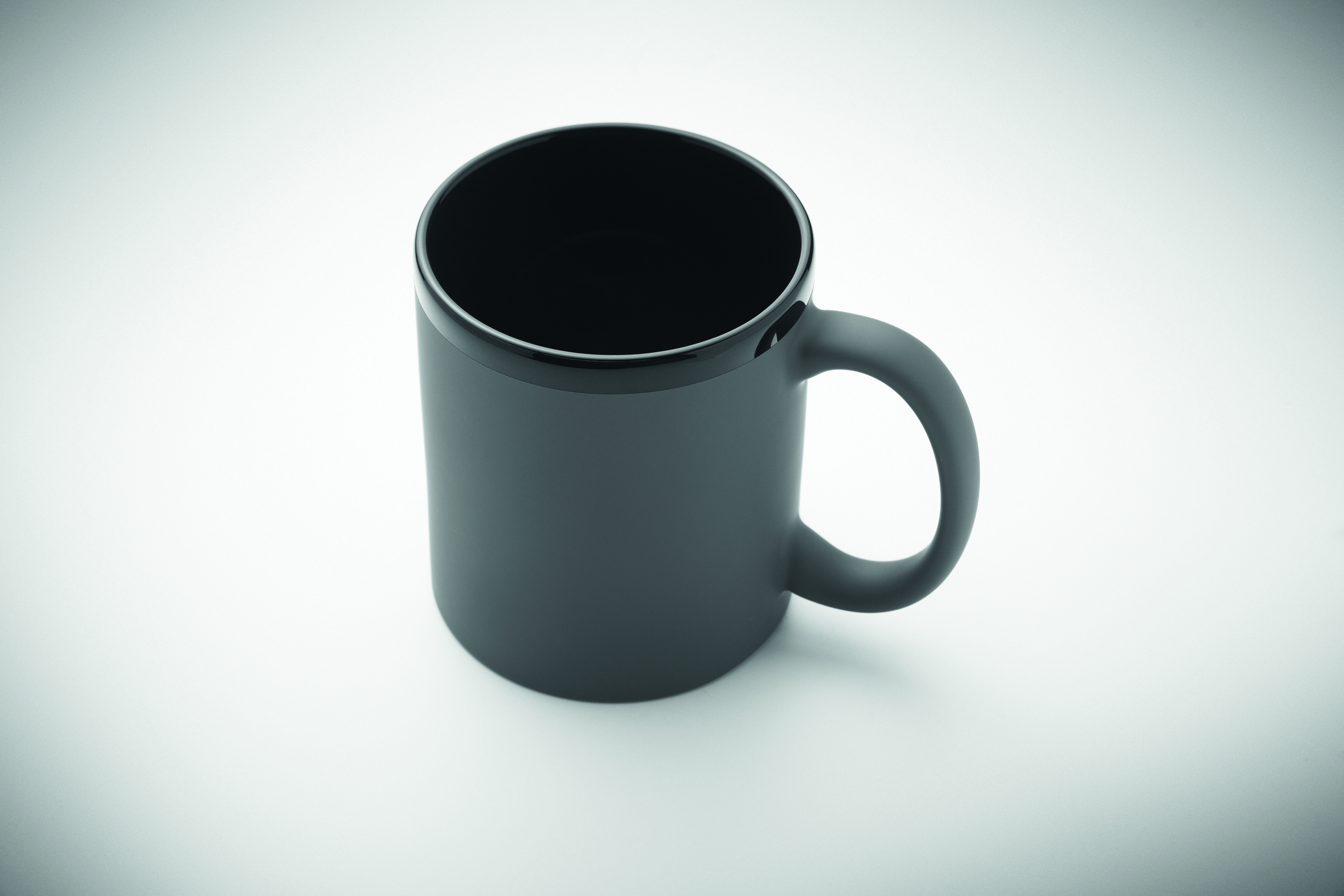 Ceramiczny kubek z powłoką soft touch i czarnym wnętrzem/obrzeżem. Odpowiedni do grawerowania laserowego. Pojemność: 300 ml. Pakowany pojedynczo w białe pudełko kartonowe.