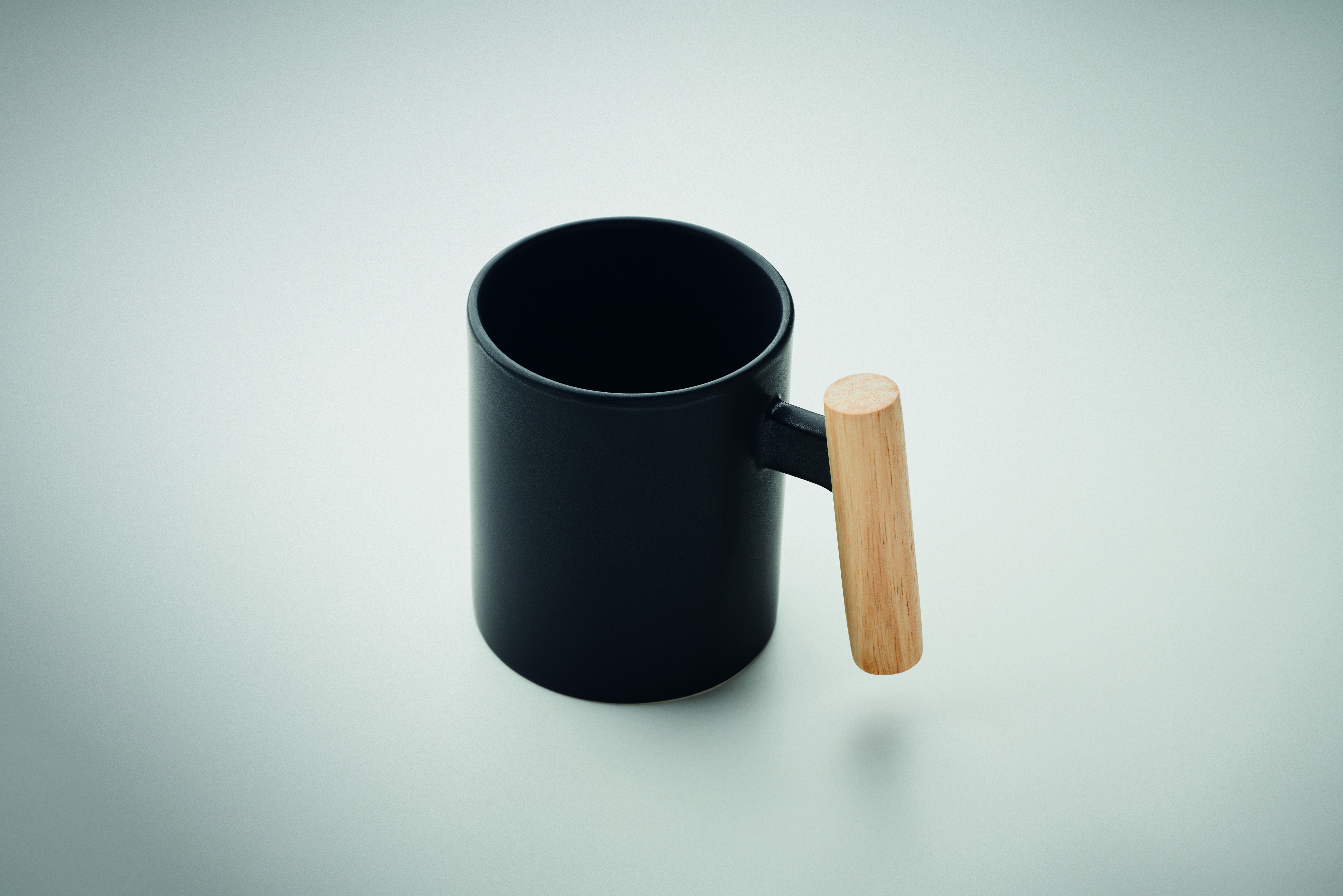 Ceramiczny kubek z drewnianym uchwytem. Pojemność: 320 ml. Pakowany pojedynczo w białe pudełko kartonowe.