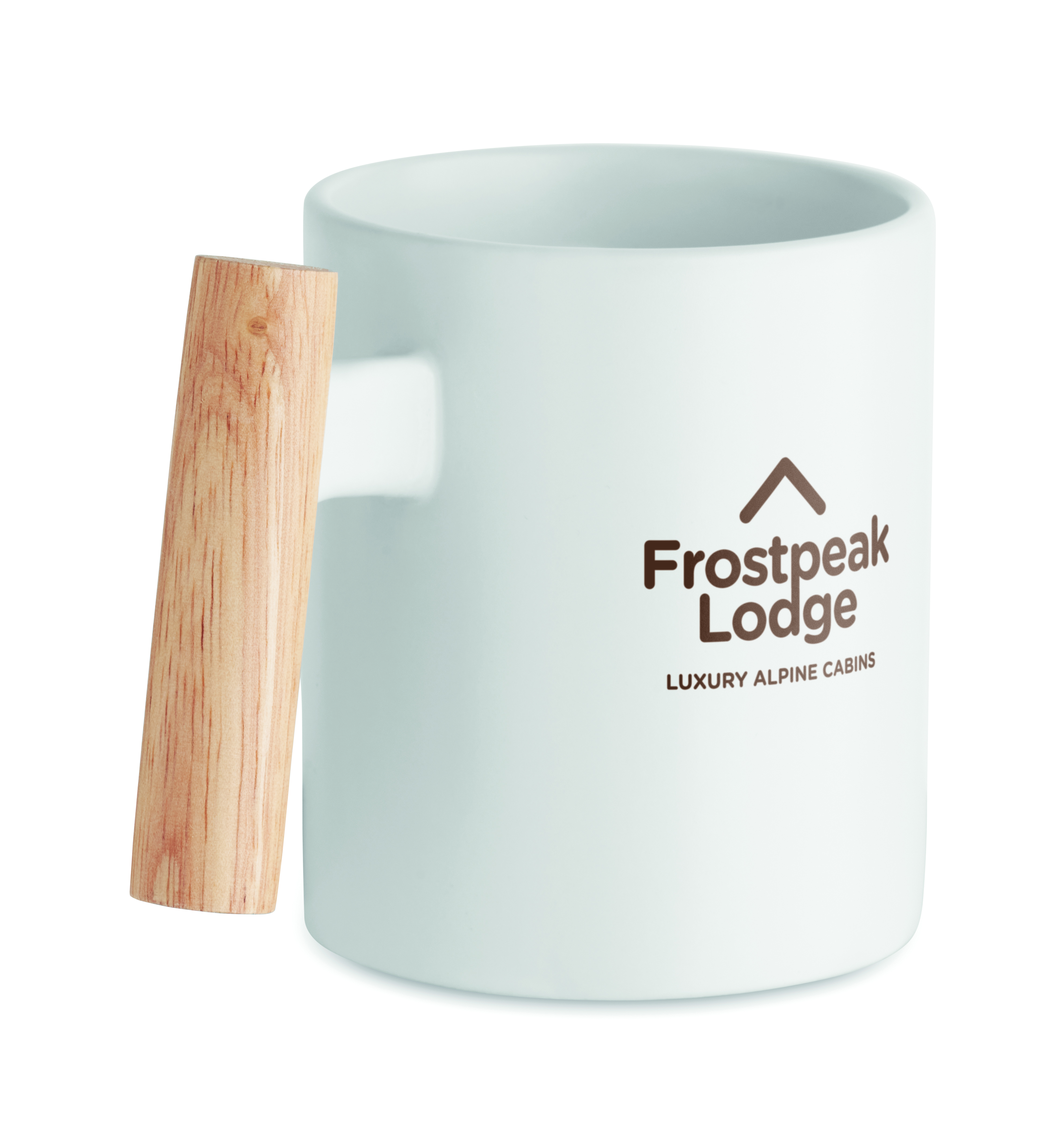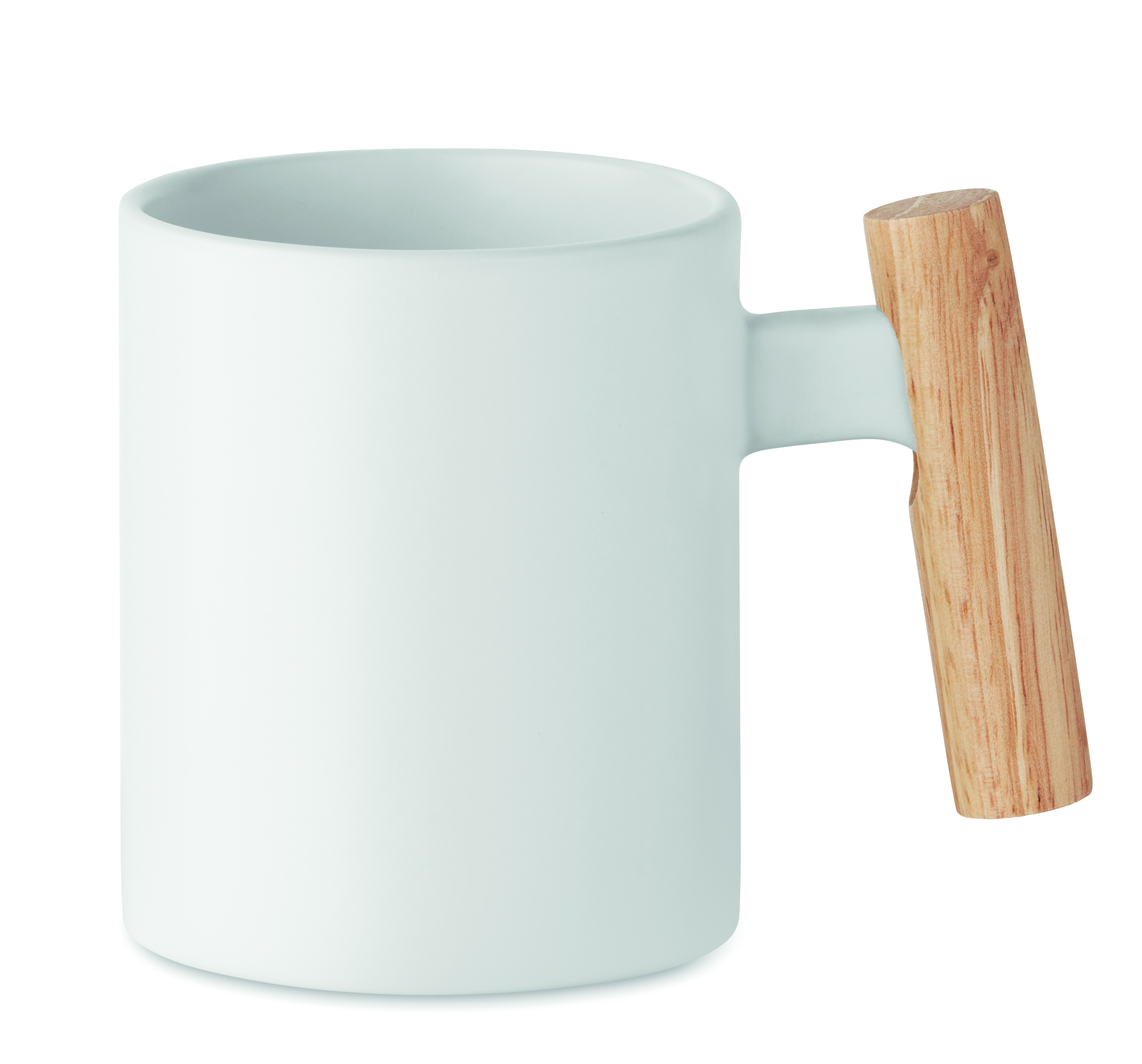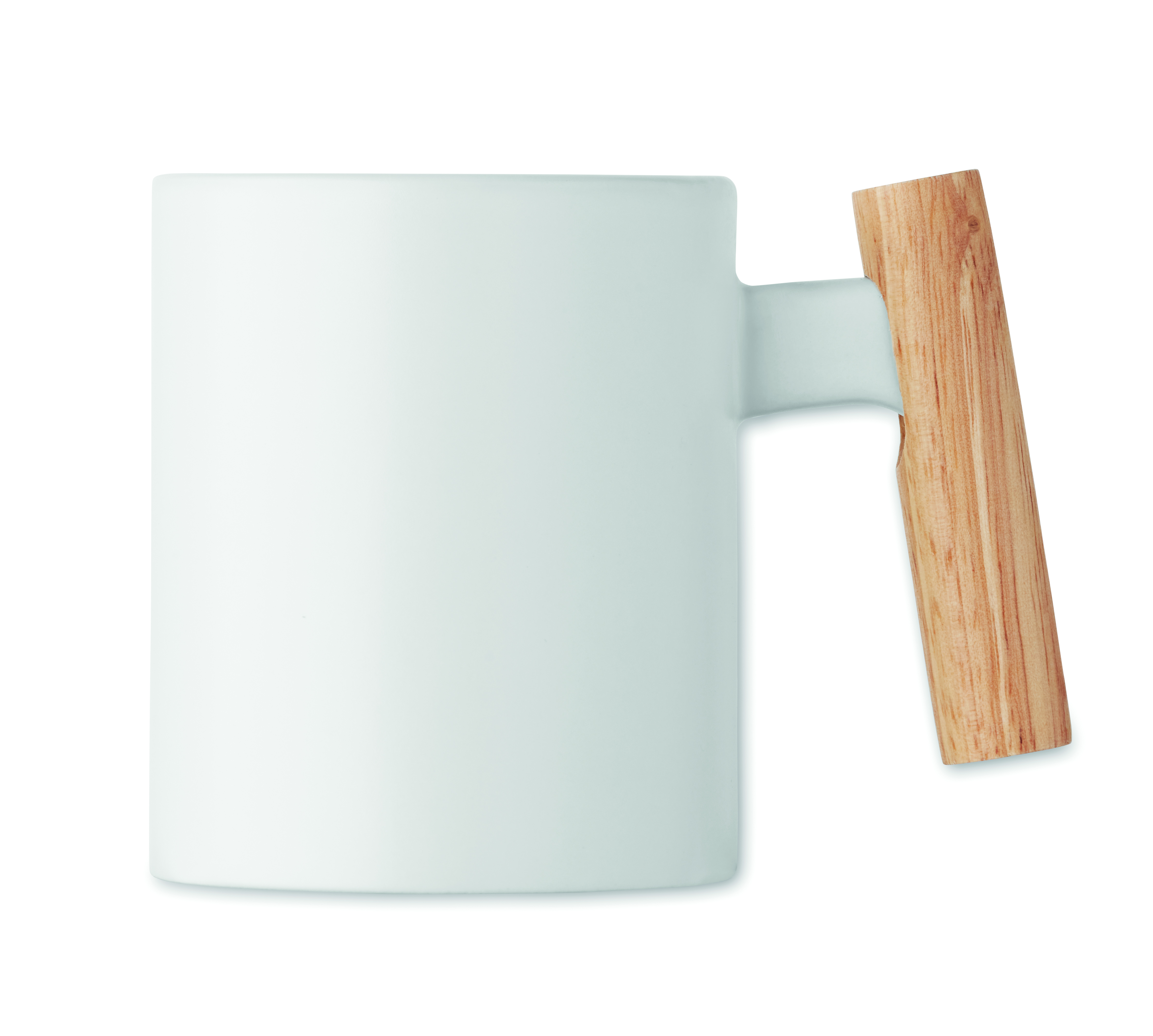 Ceramiczny kubek z drewnianym uchwytem. Pojemność: 320 ml. Pakowany pojedynczo w białe pudełko kartonowe.