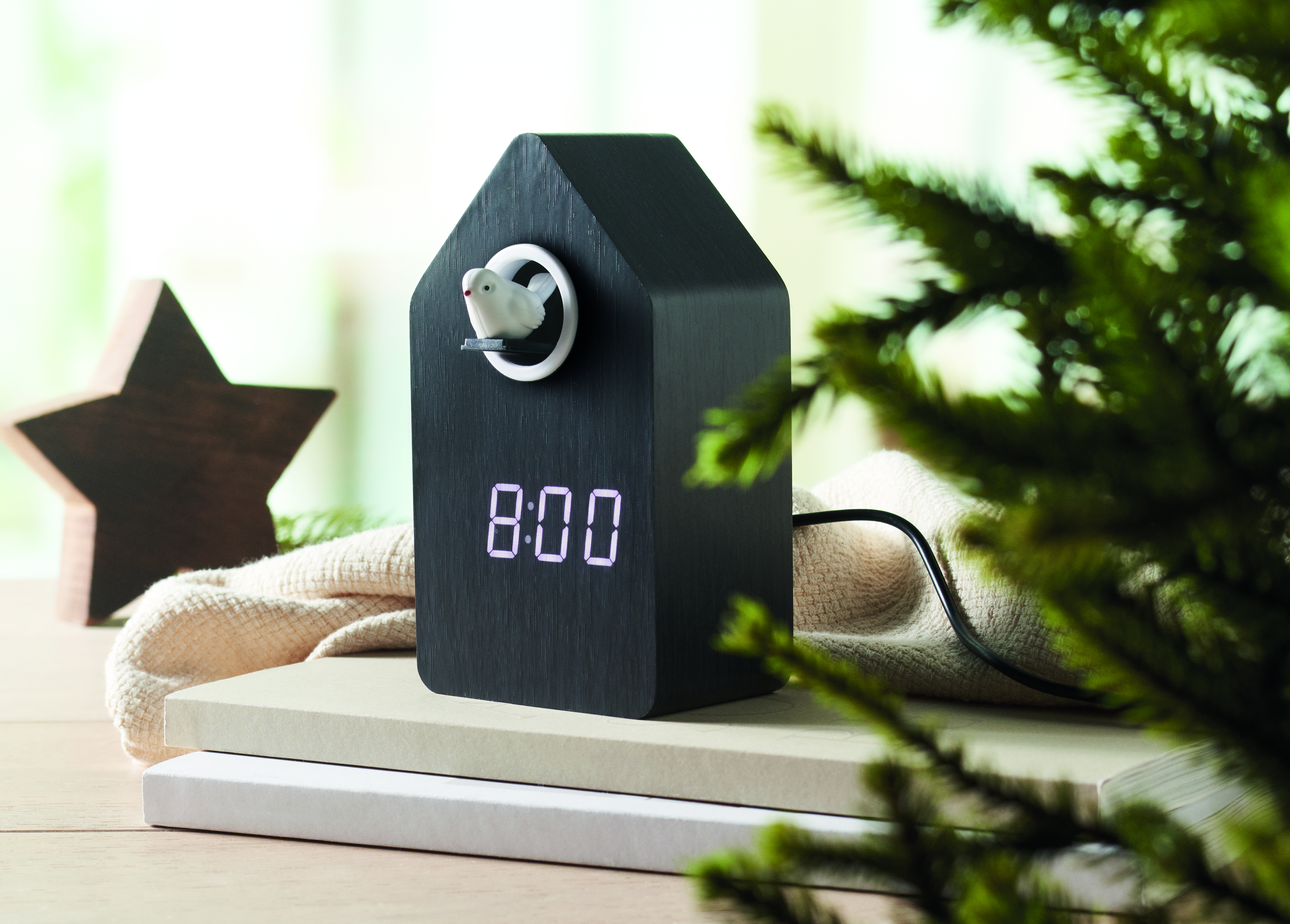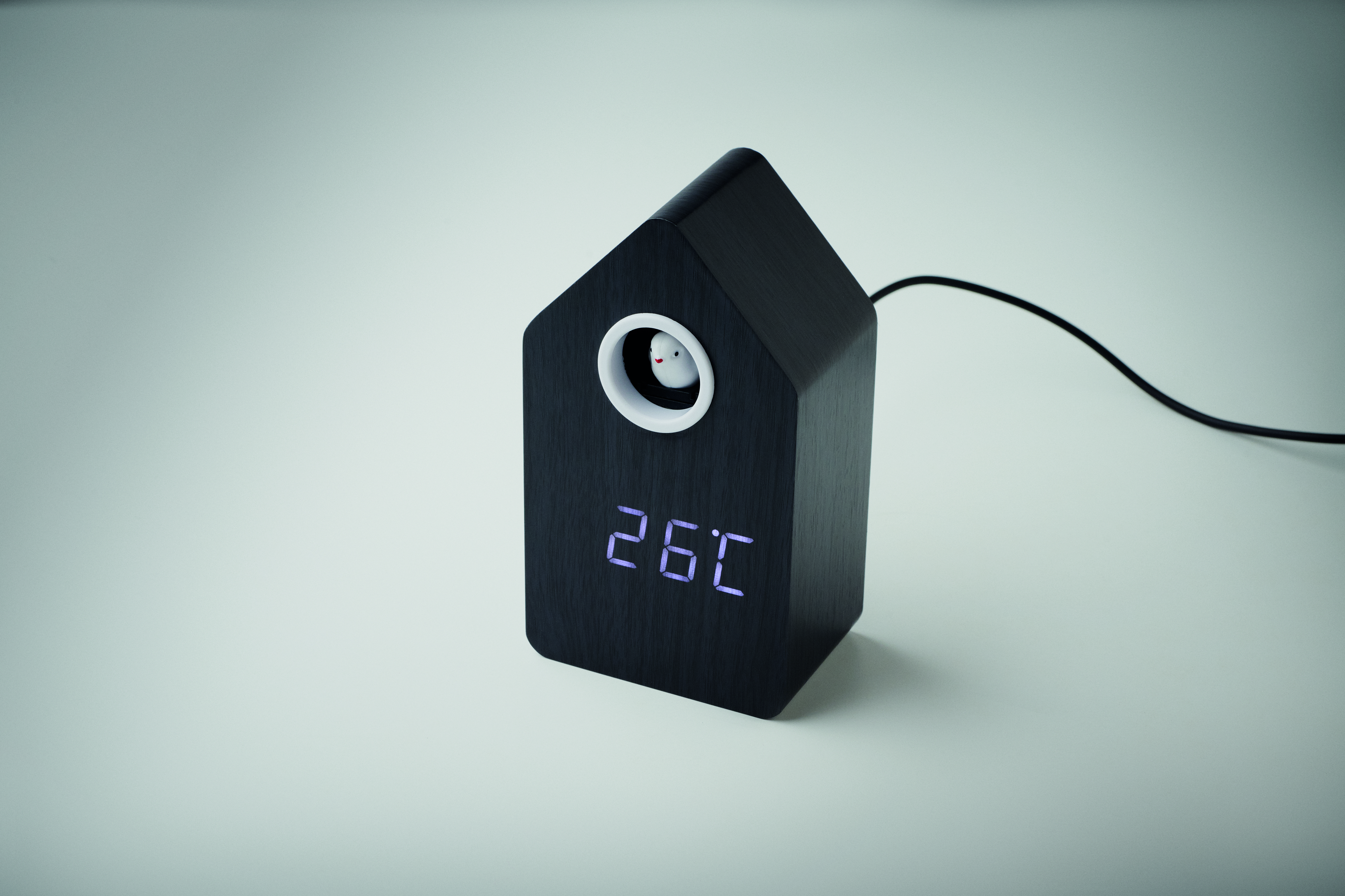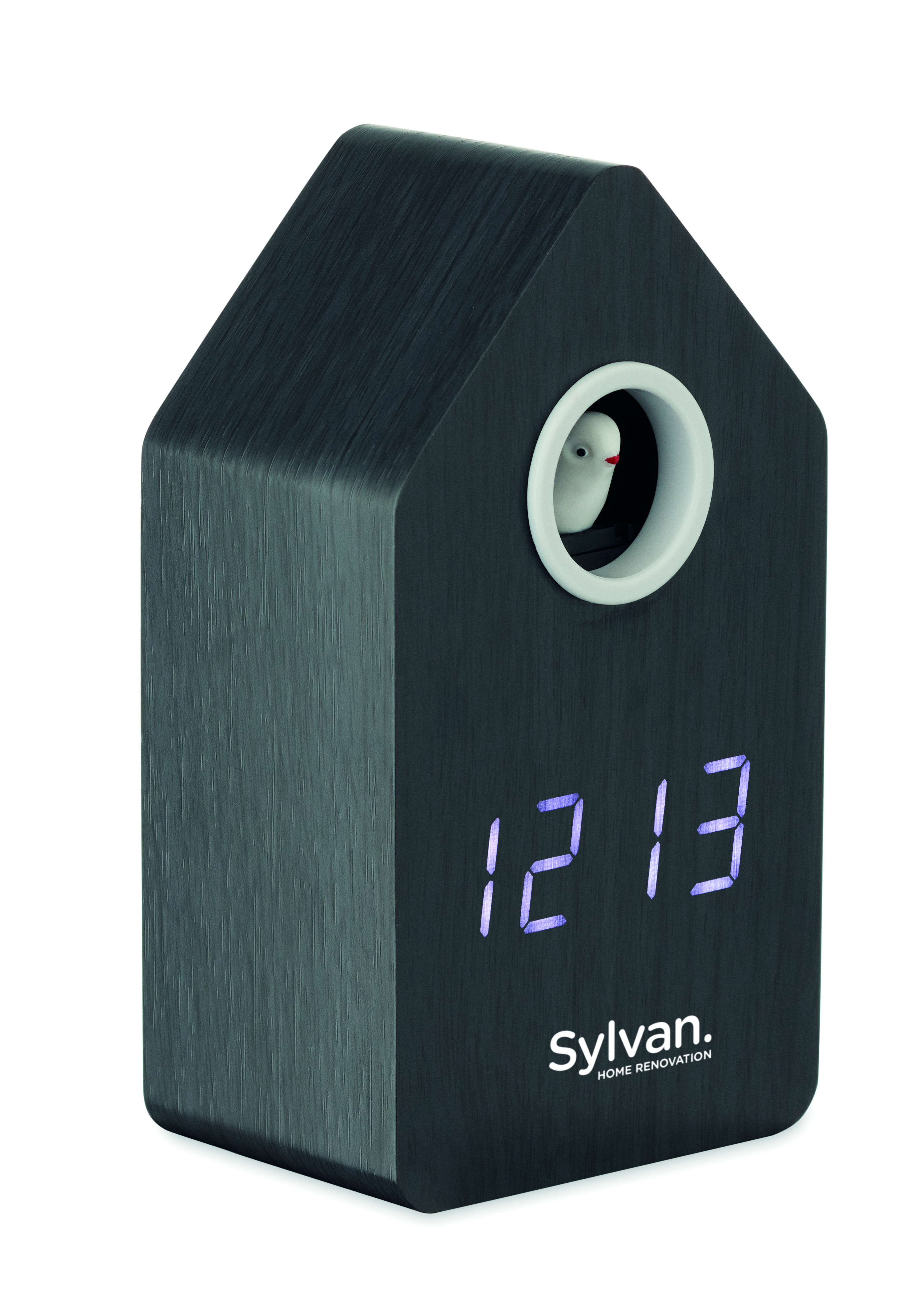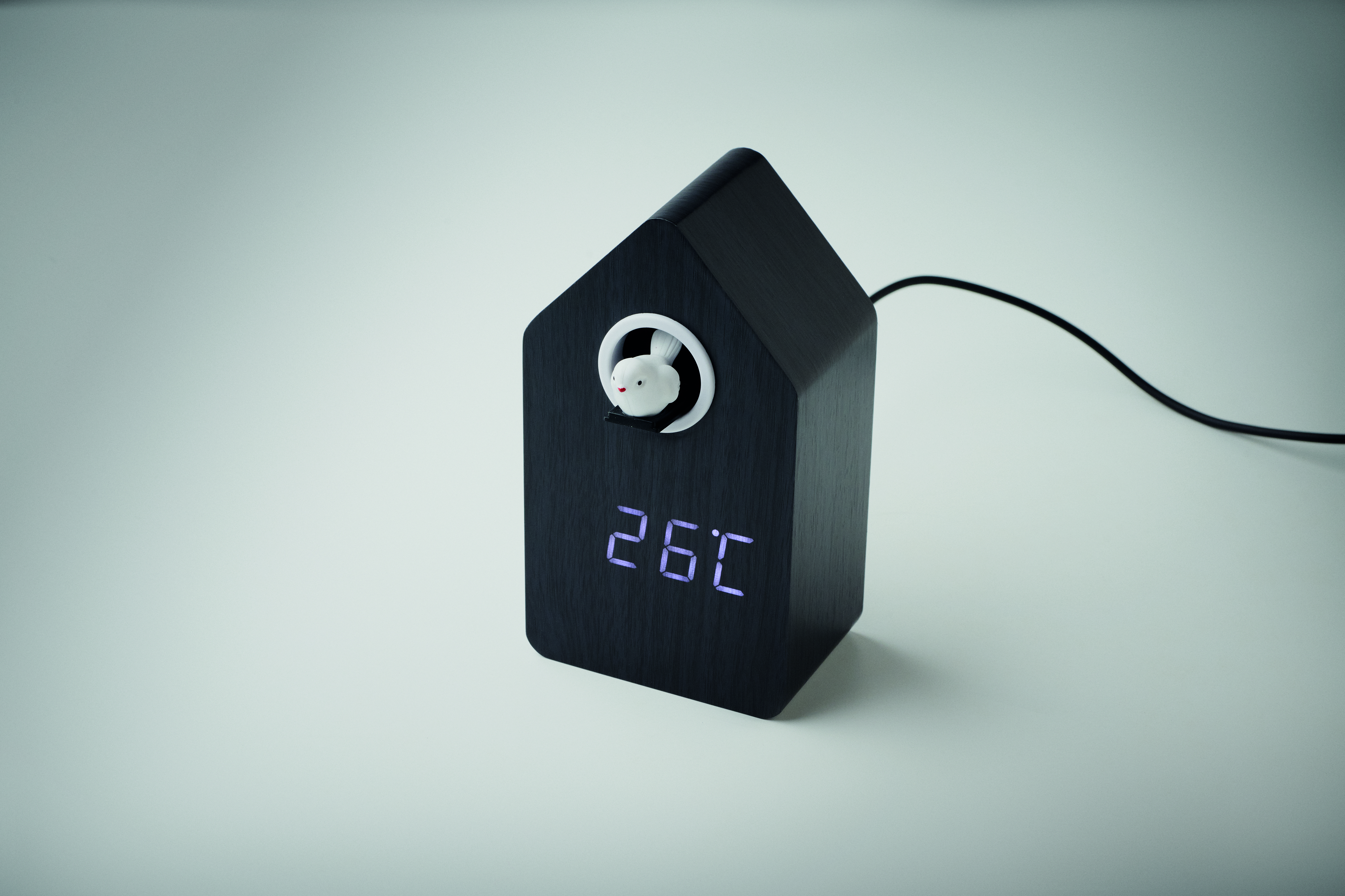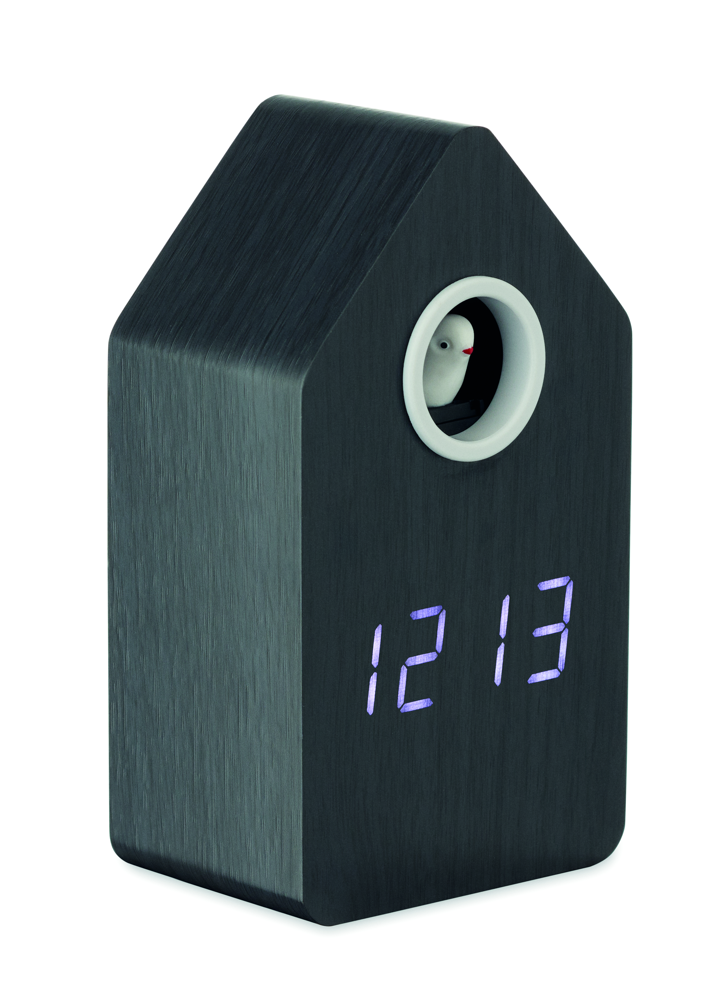 Zegar z kukułką z MDF z wbudowanym alarmem / wyświetlaczem temperatury. Ptak wychodzi o każdej pełnej godzinie wydając odgłos kukułki. Biały wyświetlacz LED. Dźwięk jest automatycznie wyciszany między 22:00 a 06:00. 5-minutowe interwały drzemki.