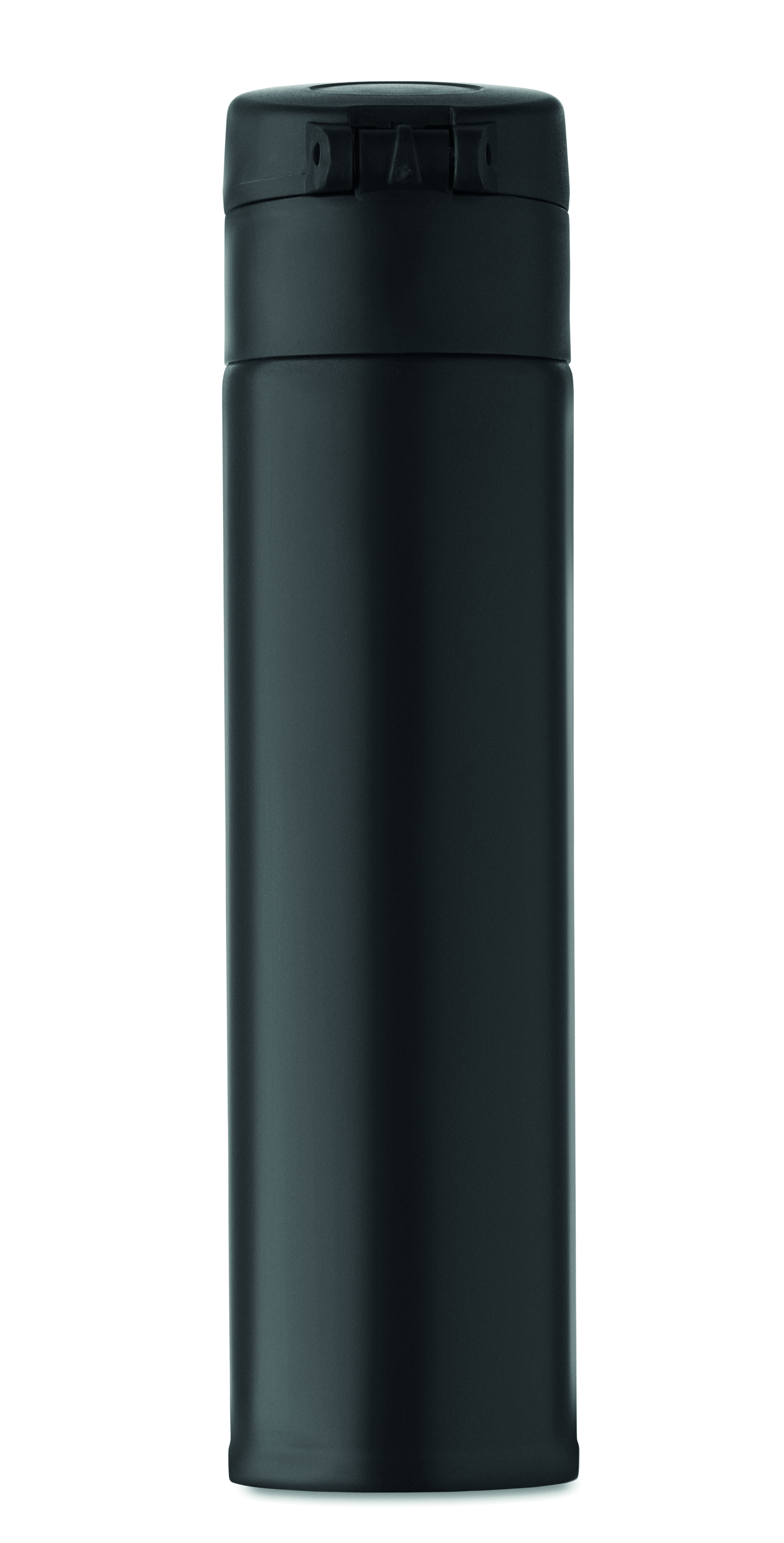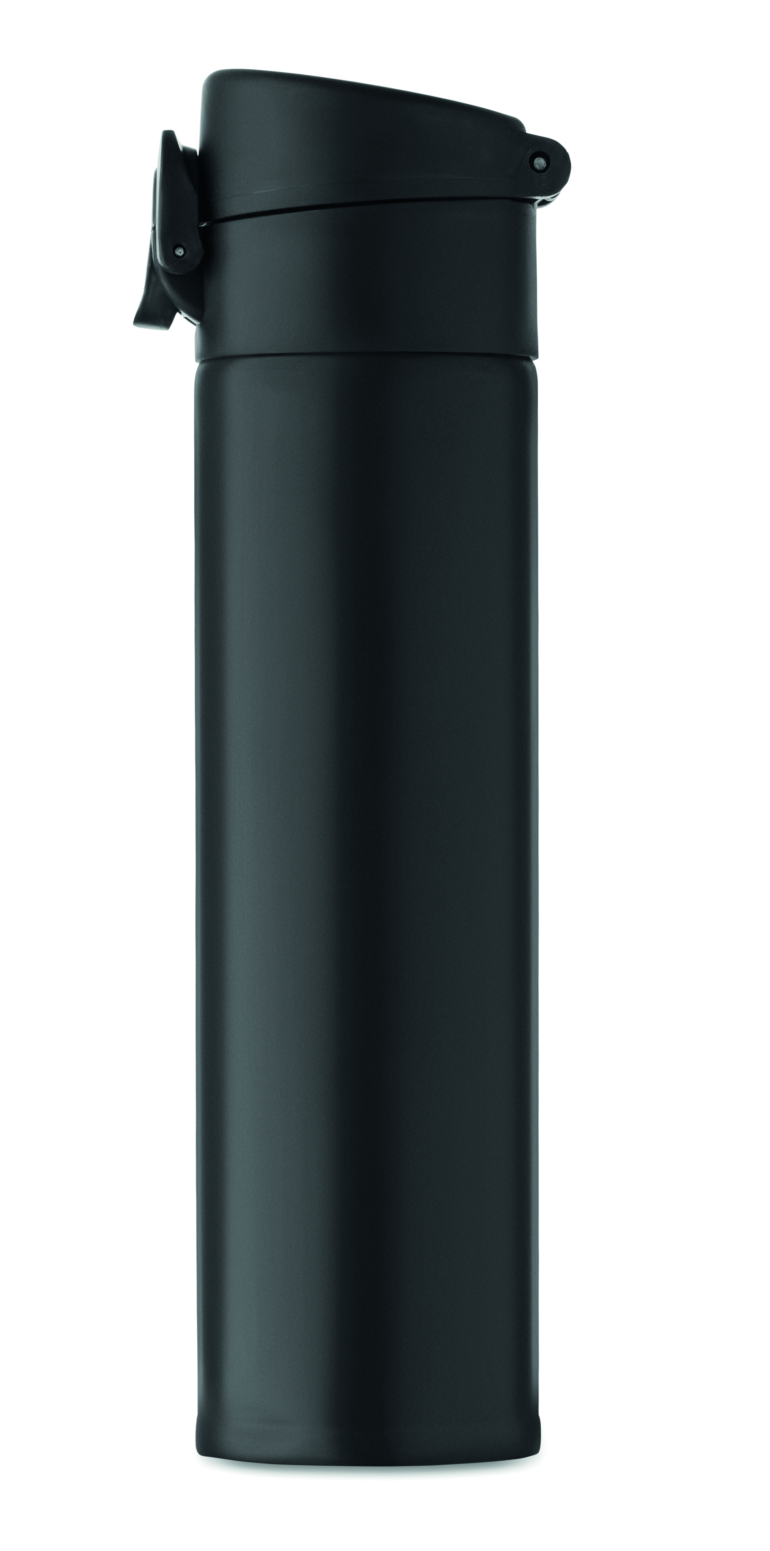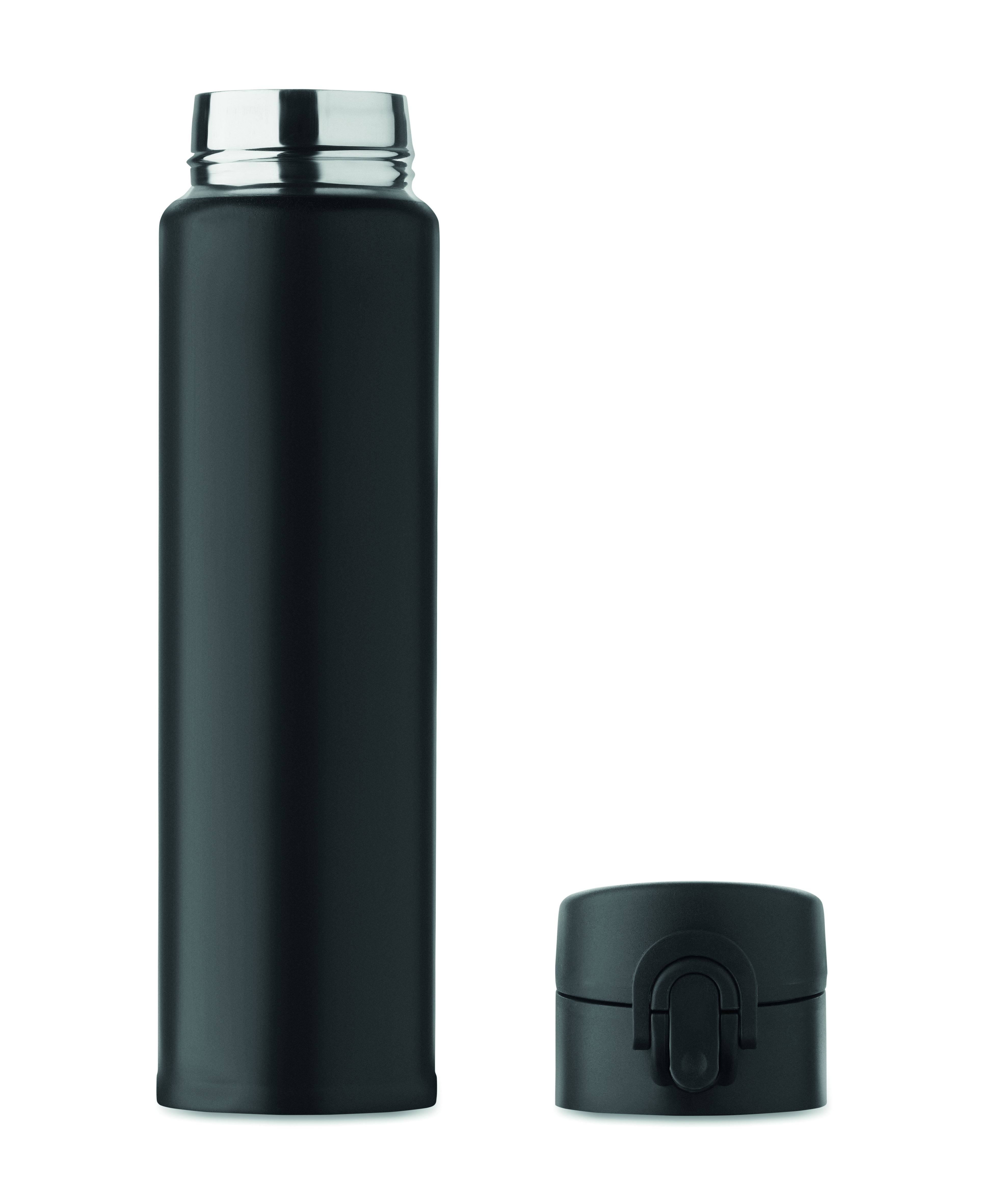 Butelka z podwójnymi ściankami ze stali nierdzewnej pochodzącej z recyklingu (90% stali nierdzewnej pochodzącej z recyklingu i 10% stali nierdzewnej) z zamkiem zabezpieczającym na pokrywie i opcją otwierania przez naciśnięcie. Nie przecieka. Pojemność: 300 ml.