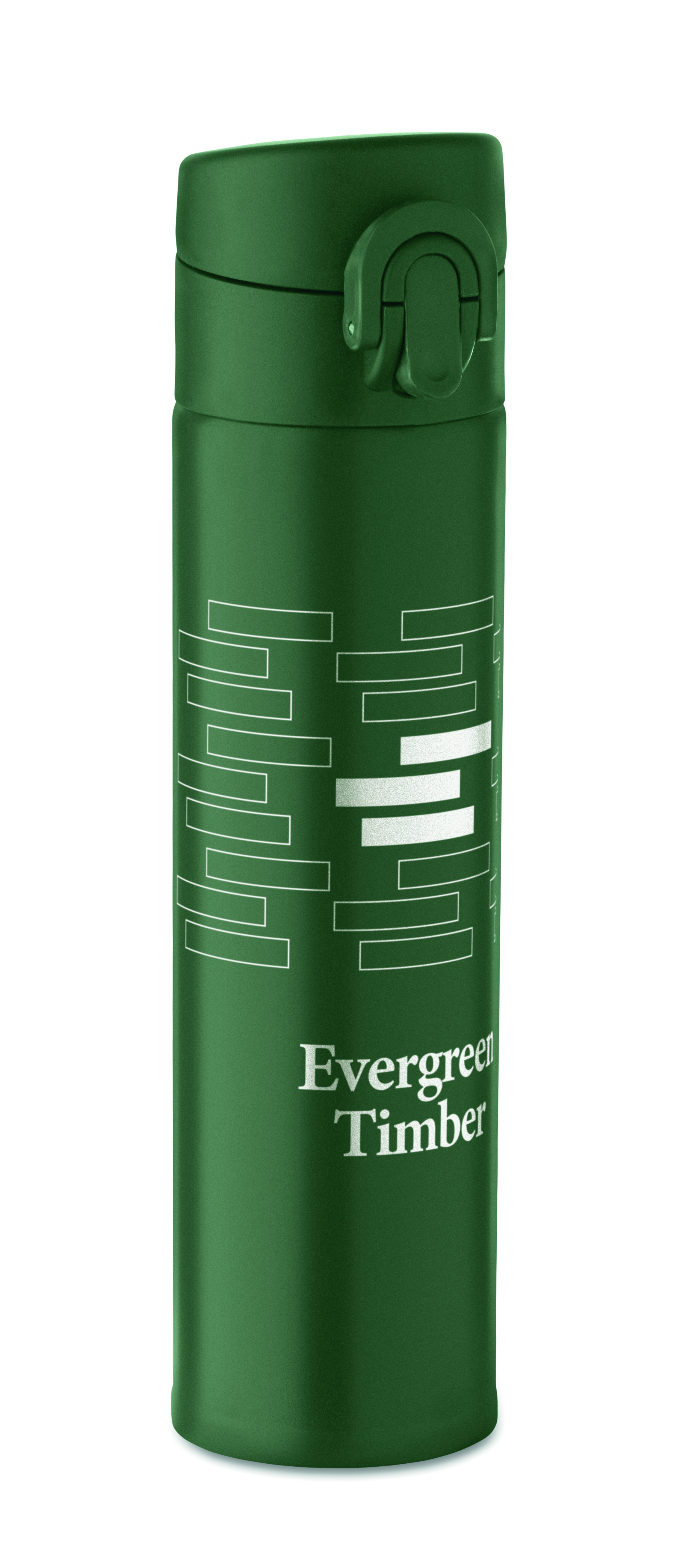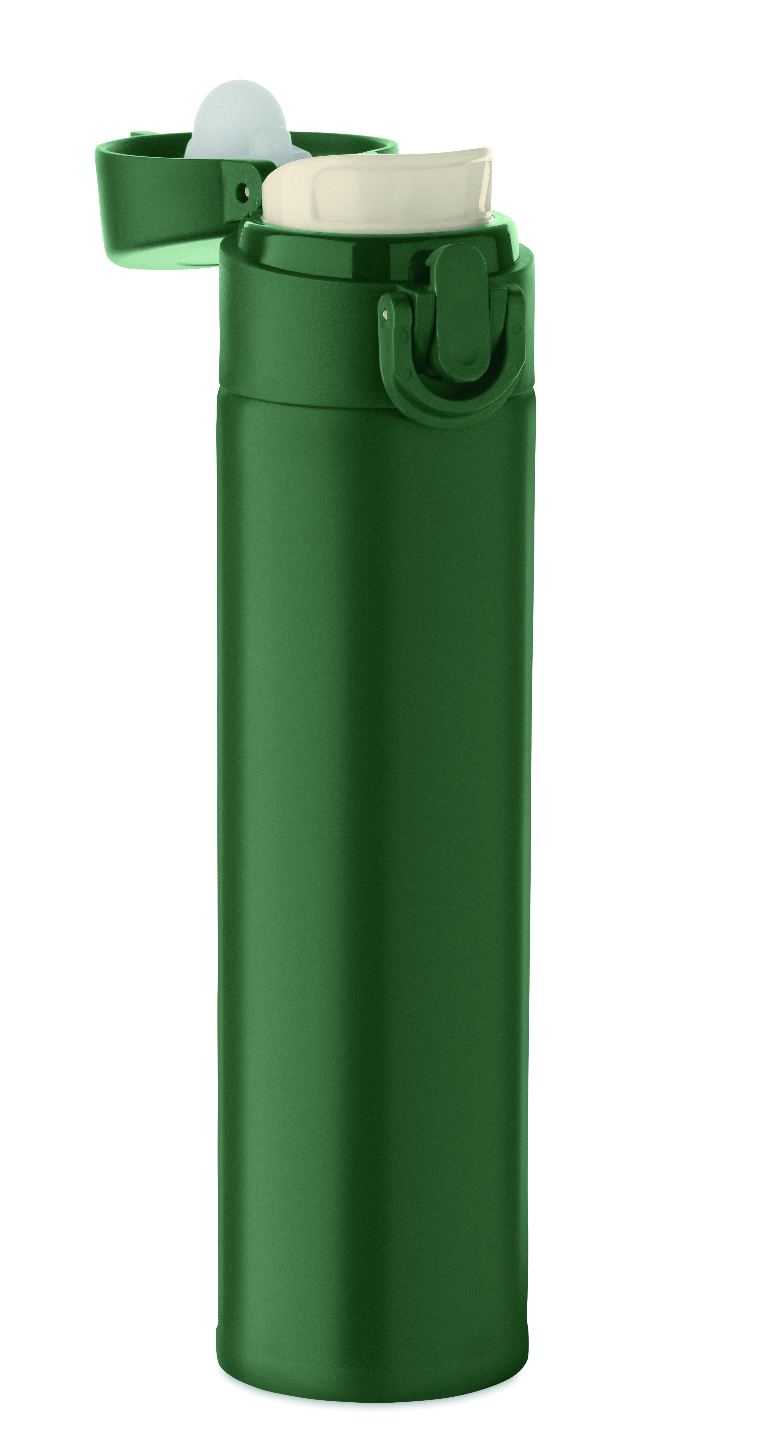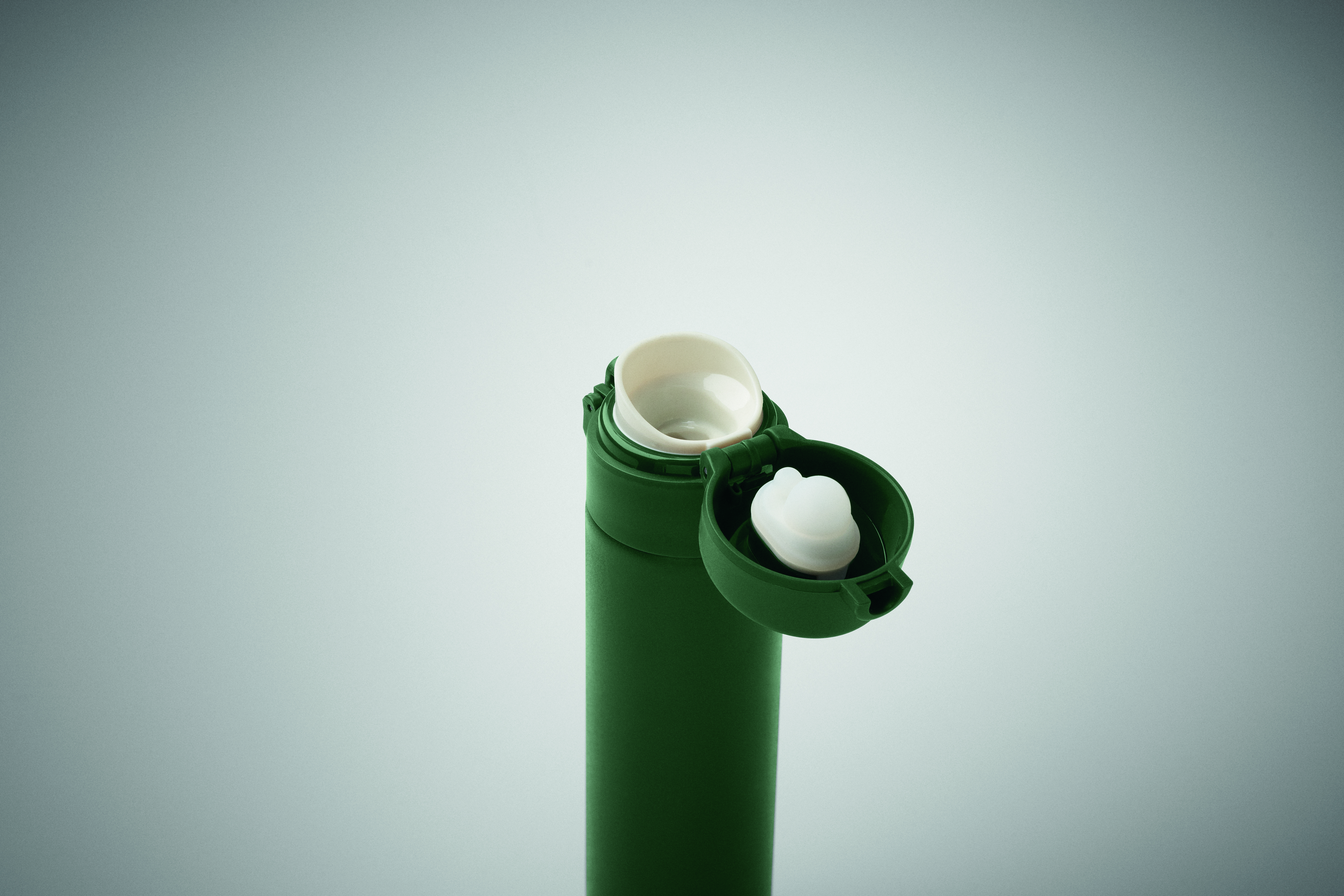 Butelka z podwójnymi ściankami ze stali nierdzewnej pochodzącej z recyklingu (90% stali nierdzewnej pochodzącej z recyklingu i 10% stali nierdzewnej) z zamkiem zabezpieczającym na pokrywie i opcją otwierania przez naciśnięcie. Nie przecieka. Pojemność: 300 ml.