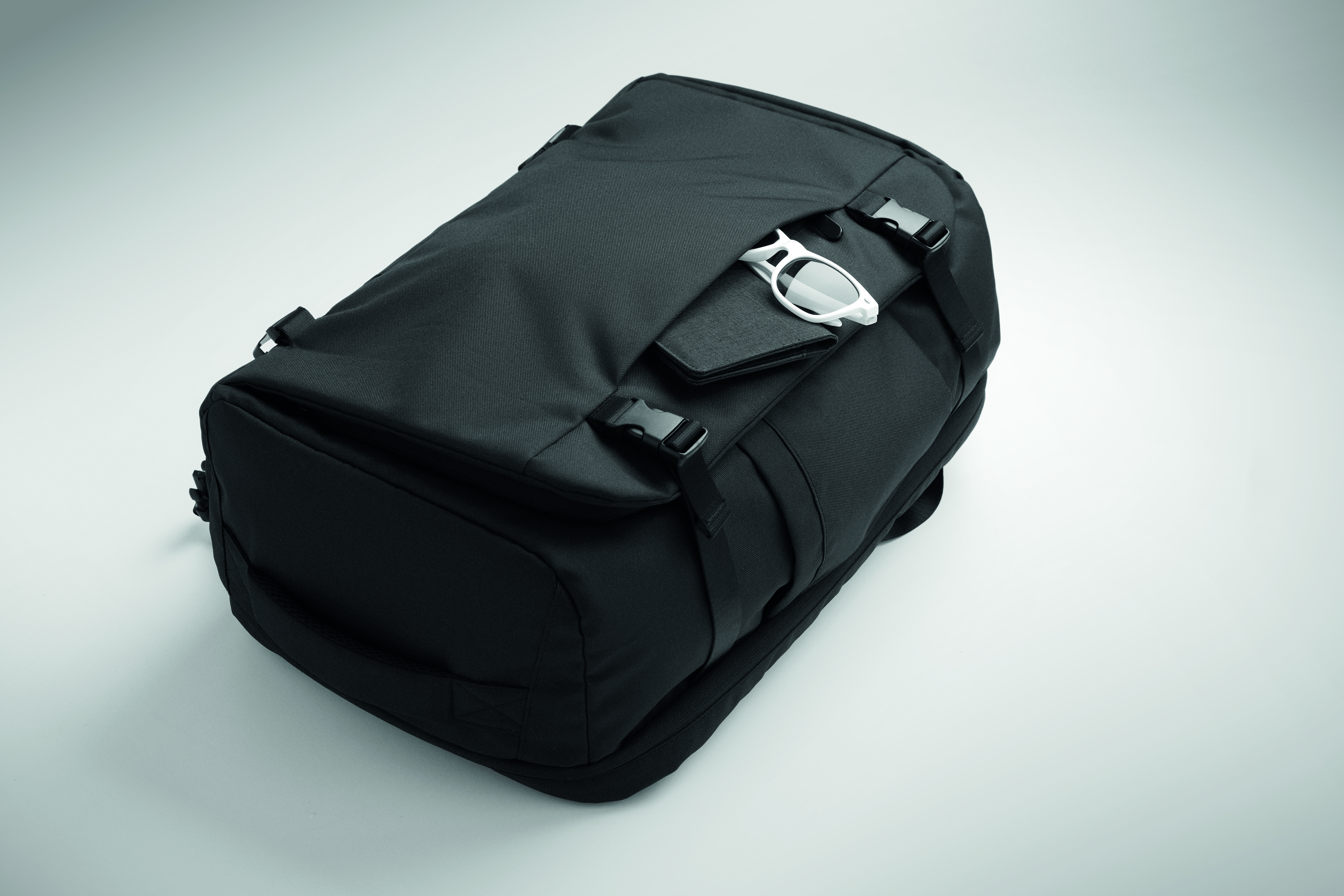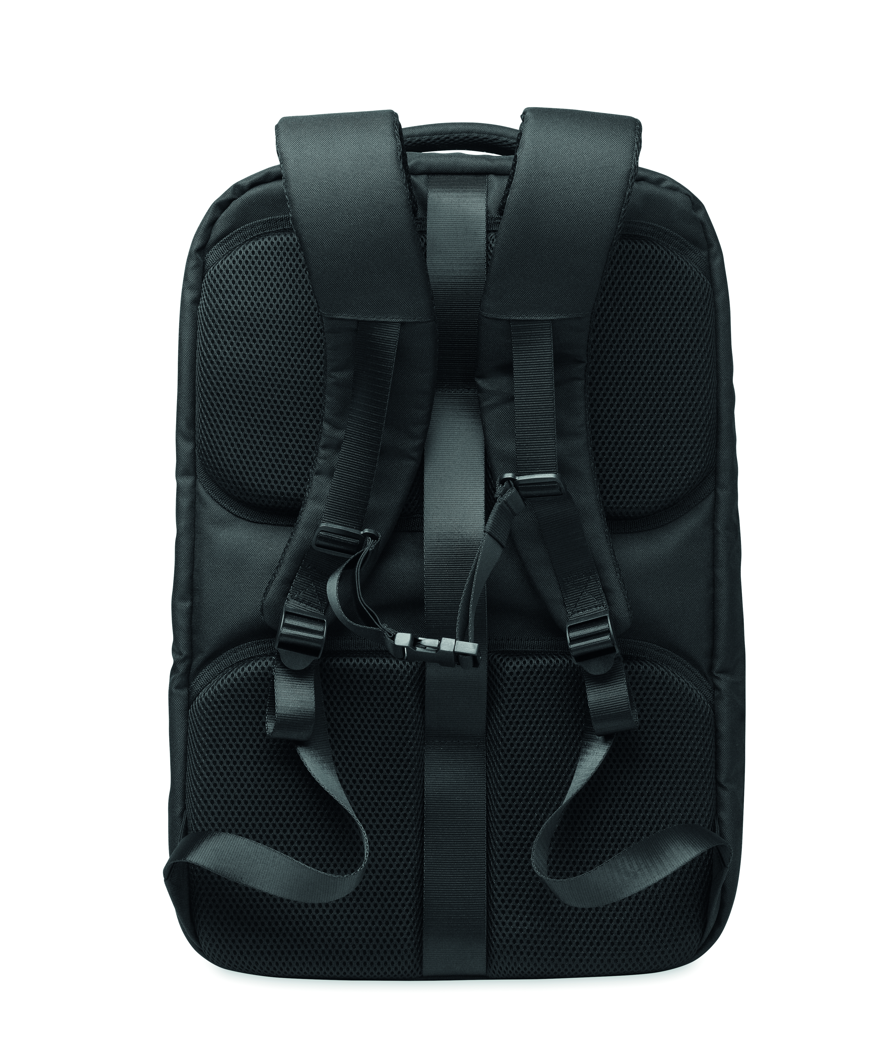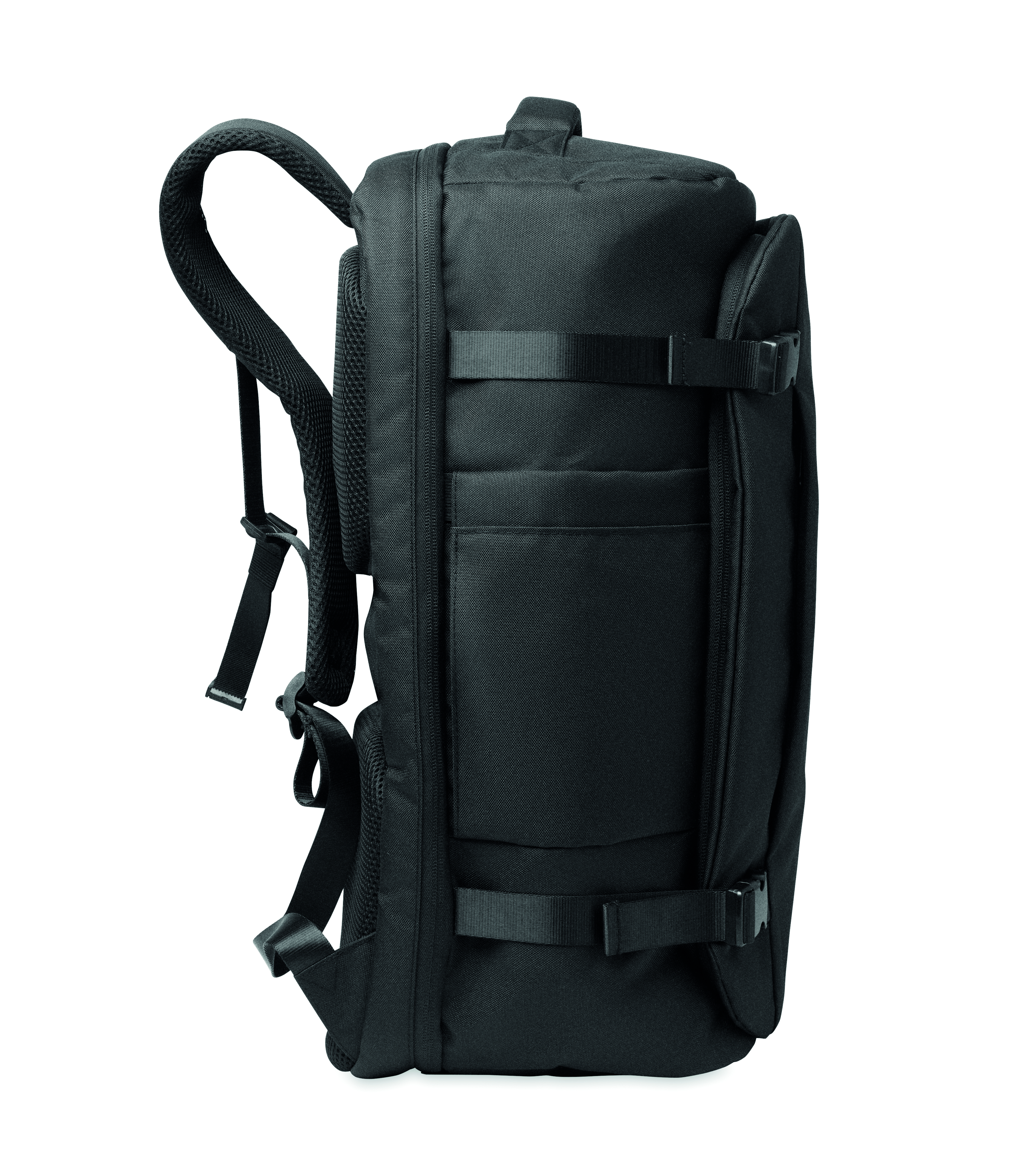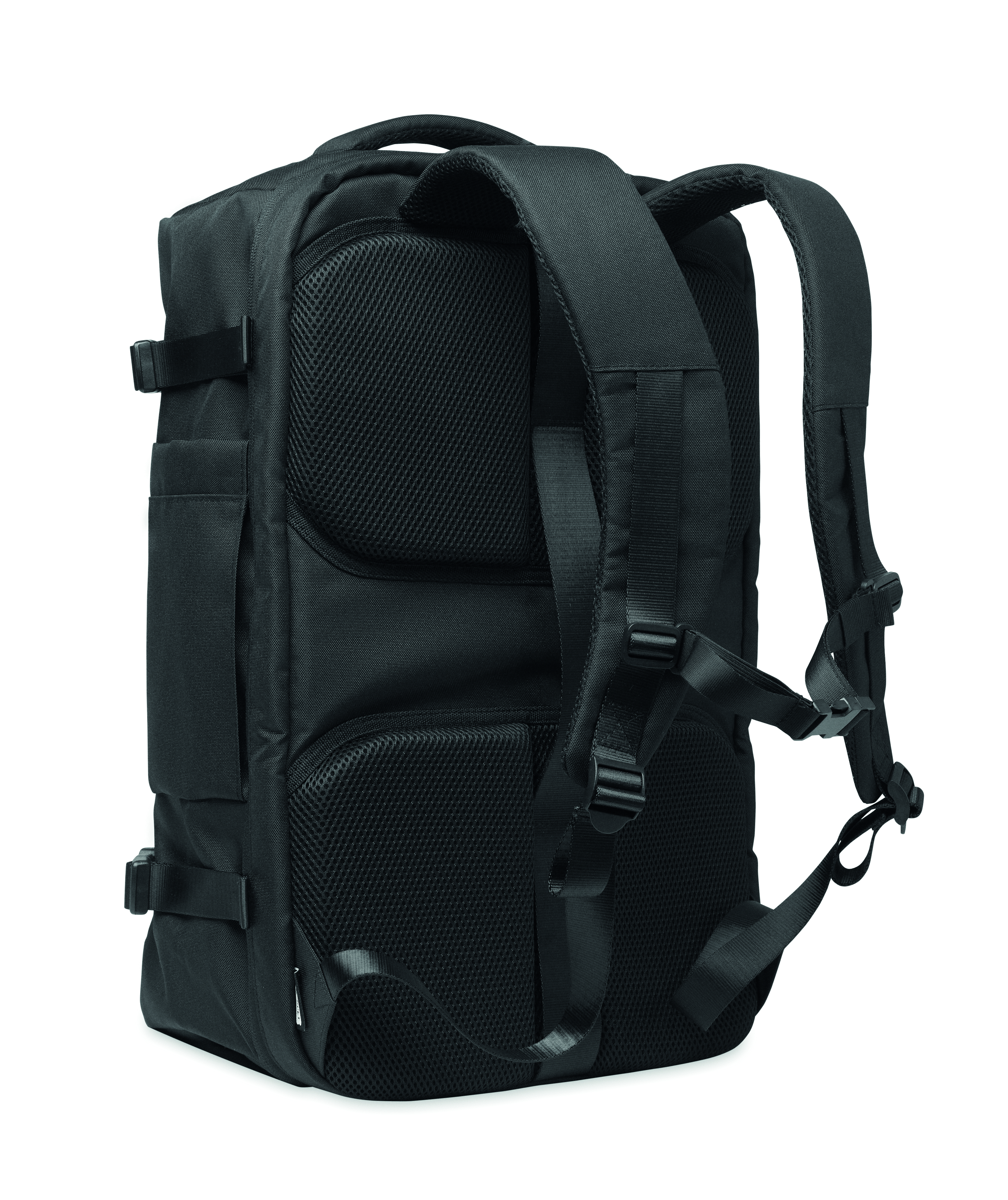 Duży, 17-calowy plecak podróżny na laptopa wykonany z poliestru 600D RPET. Posiada kilka przegródek, w tym jedną główną na ubrania, dwie wyściełane na laptopa i tablet. Wyściełany panel tylny, pasek na ramię, uchwyt.