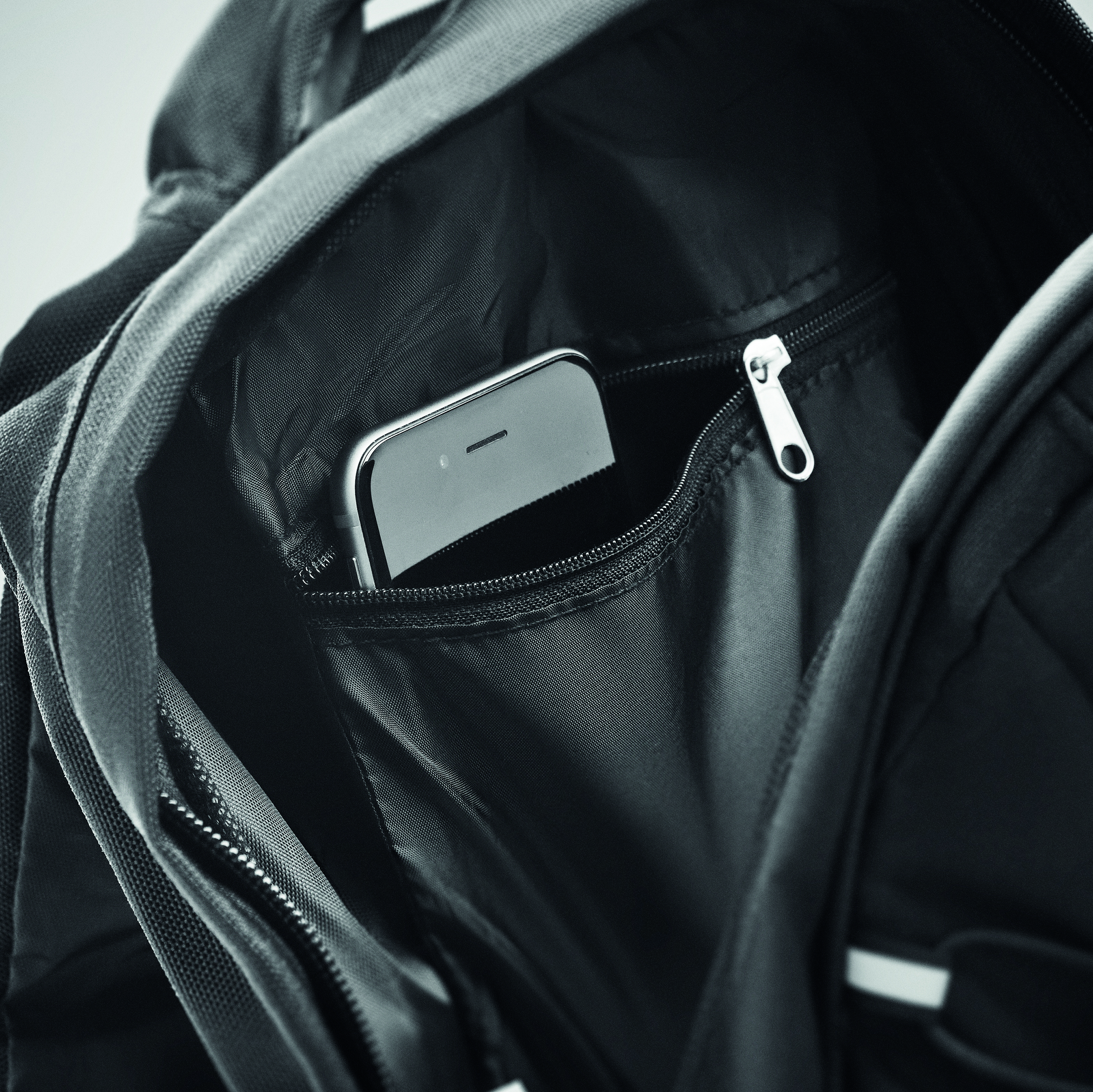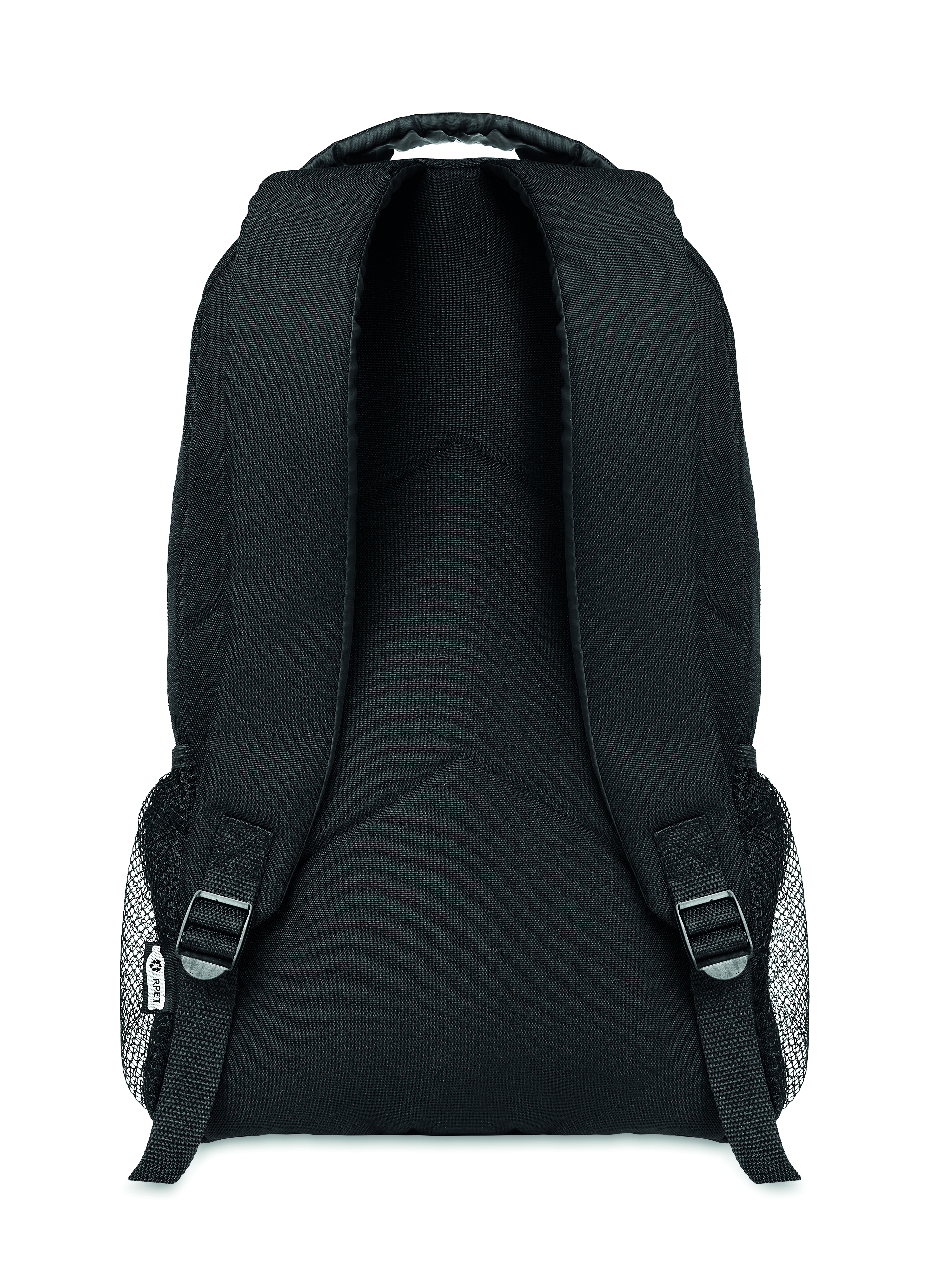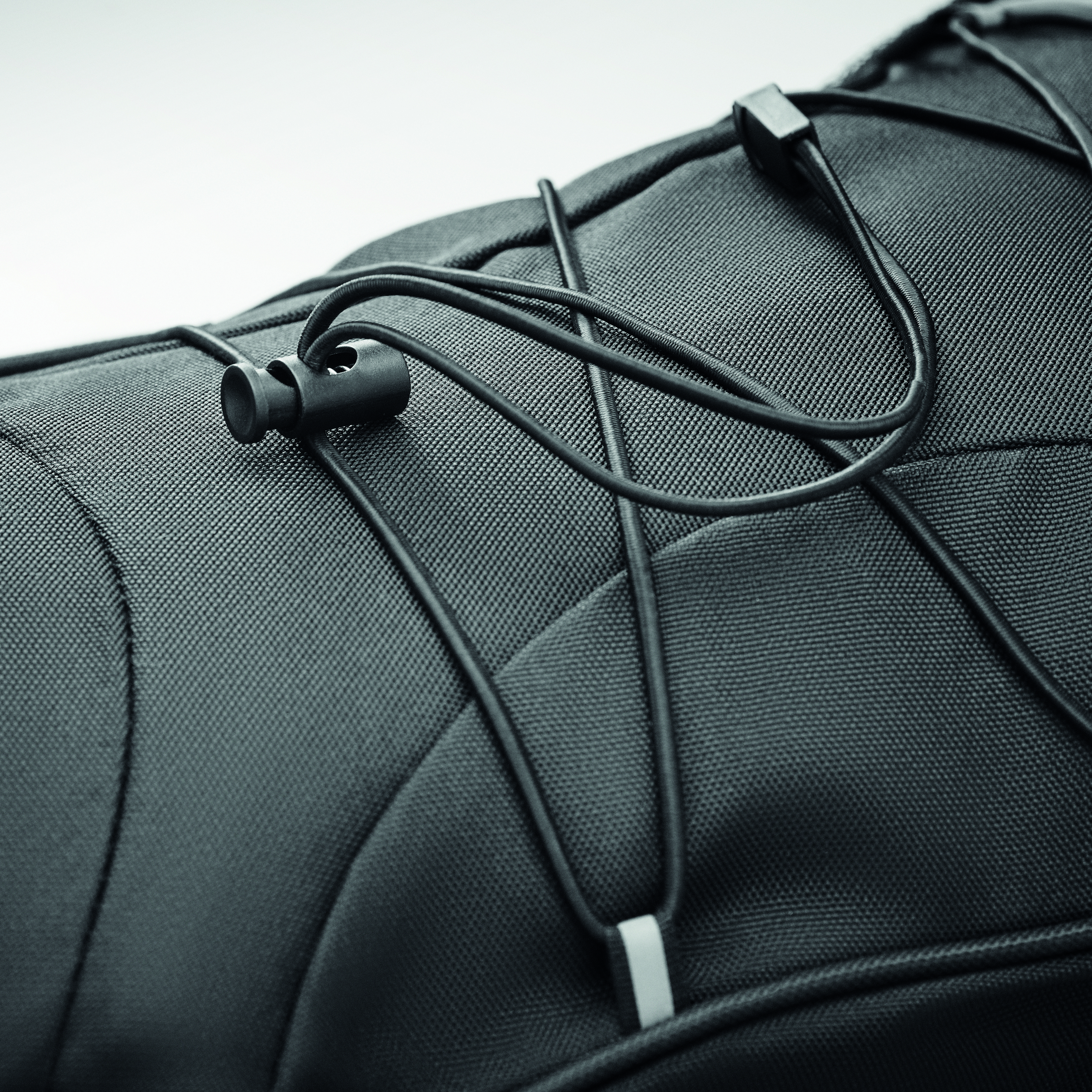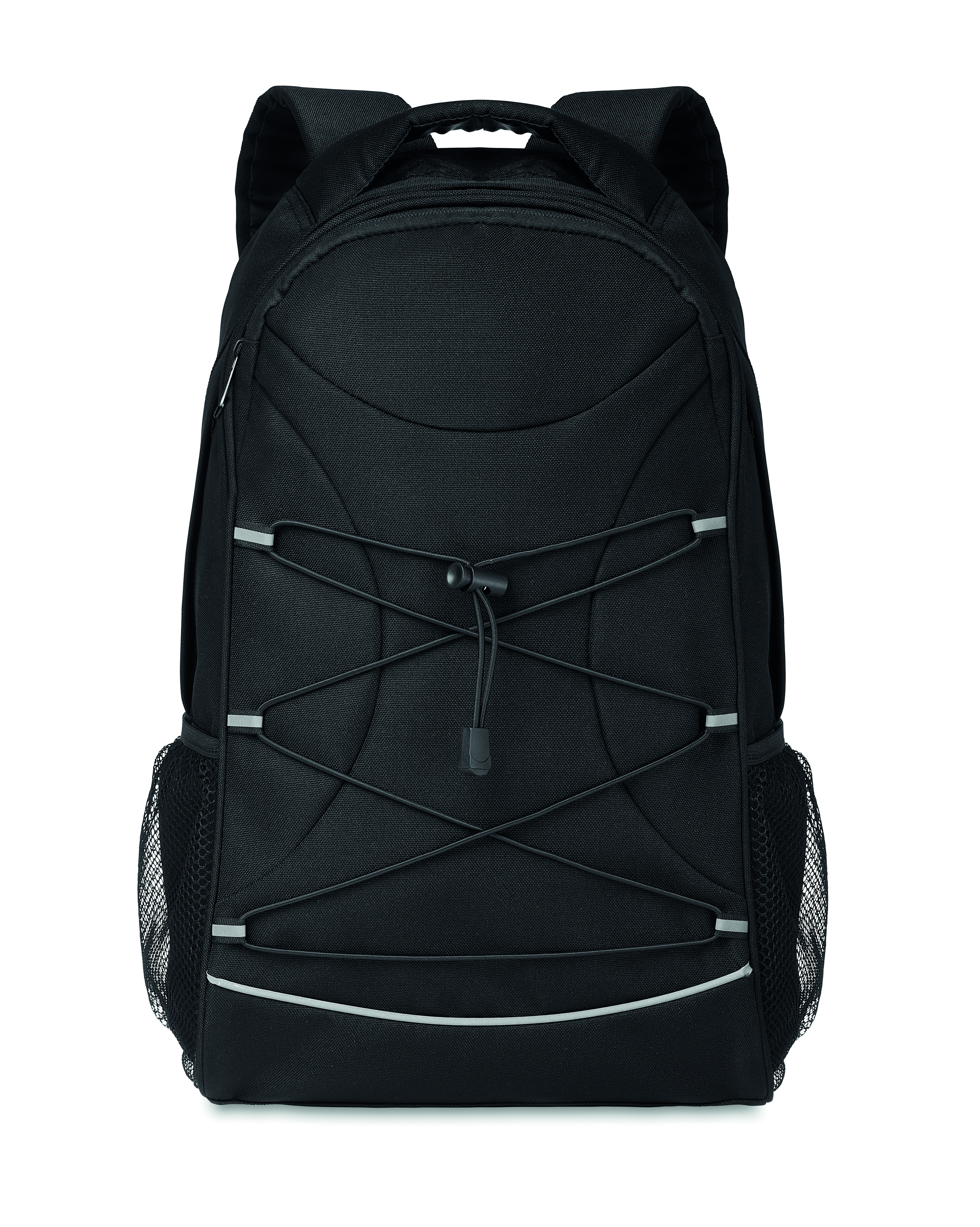Plecak wykonany z materiału 600D RPET z odblaskowymi detalami z przodu i kieszeniami z siatki po obu stronach.