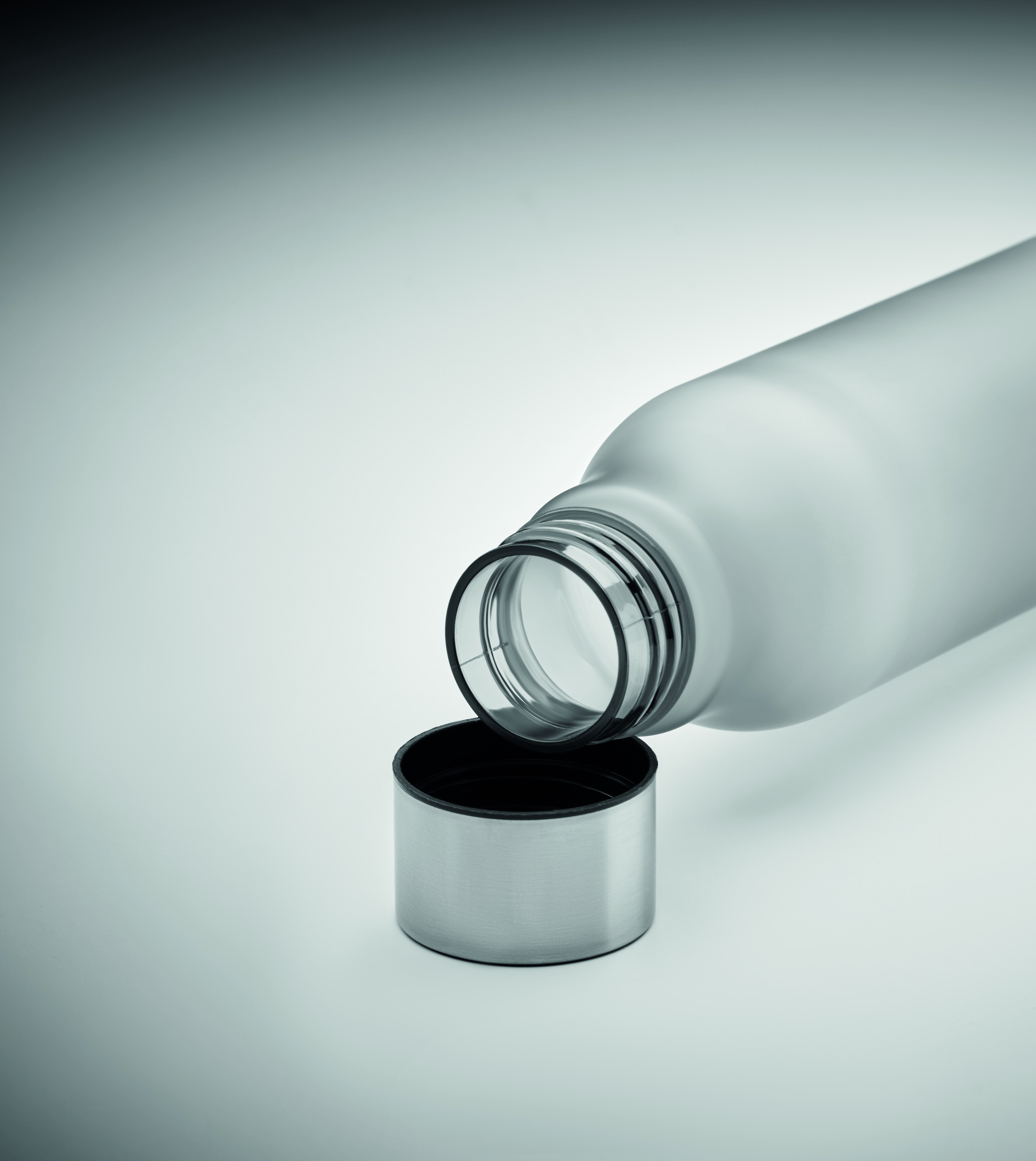 Butelka z RPET z gumowanym wykończeniem, zakrętka ze stali nierdzewnej z silikonowym pierścieniem. Bez BPA. Szczelna. Pojemność: 600 ml. Nie nadaje się do napojów gazowanych.