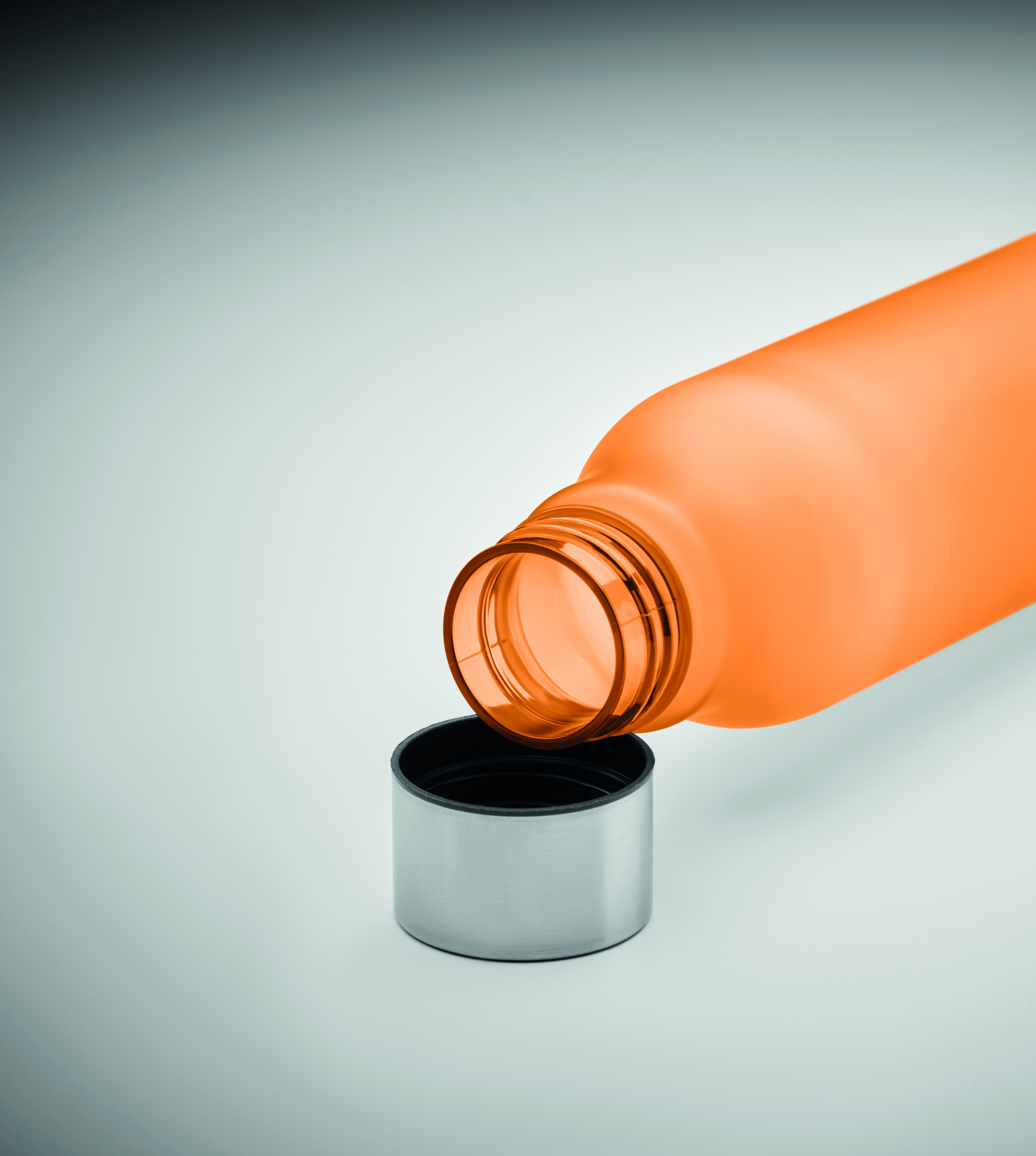 Butelka z RPET z gumowanym wykończeniem, zakrętka ze stali nierdzewnej z silikonowym pierścieniem. Bez BPA. Szczelna. Pojemność: 600 ml. Nie nadaje się do napojów gazowanych.