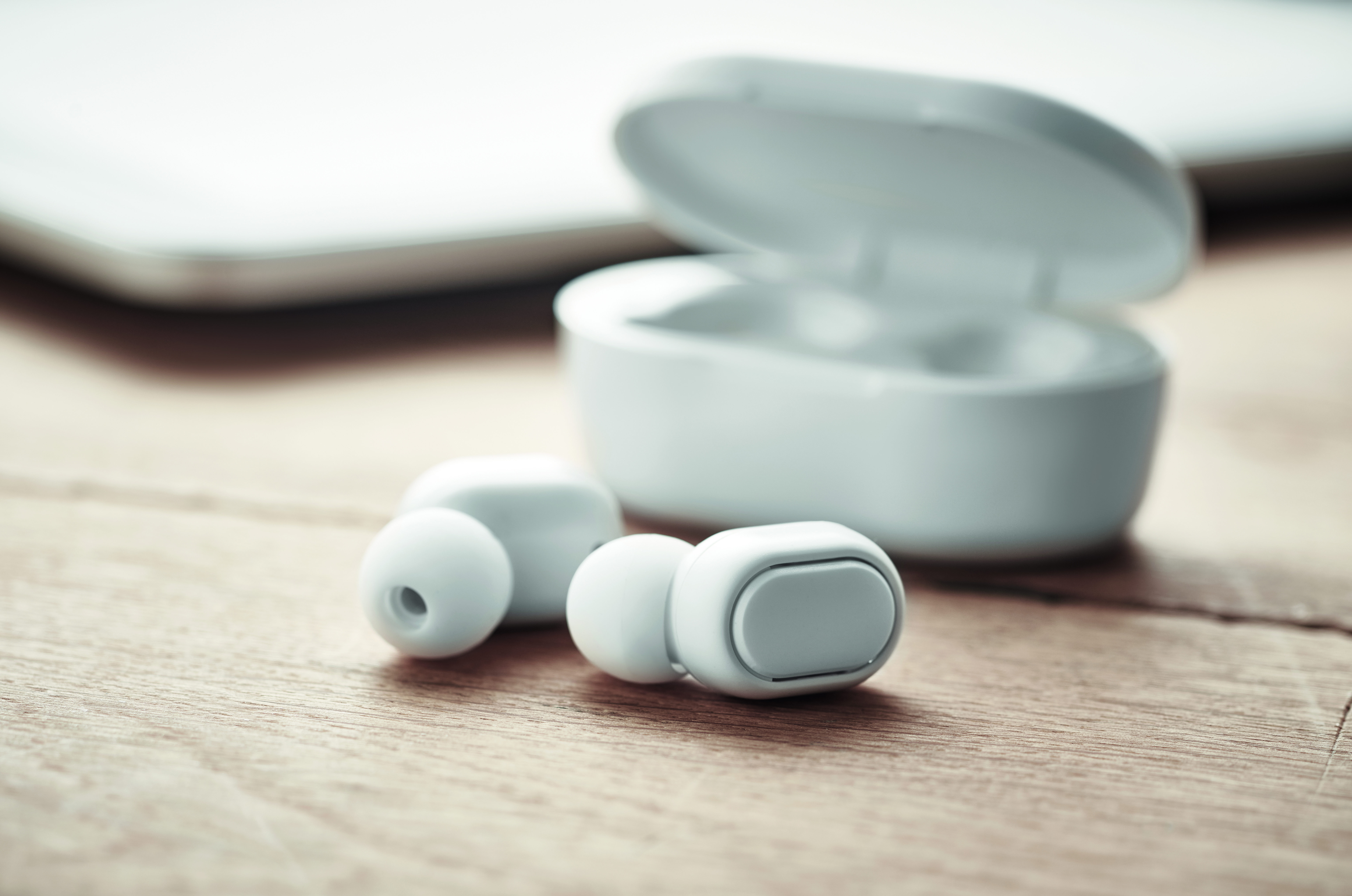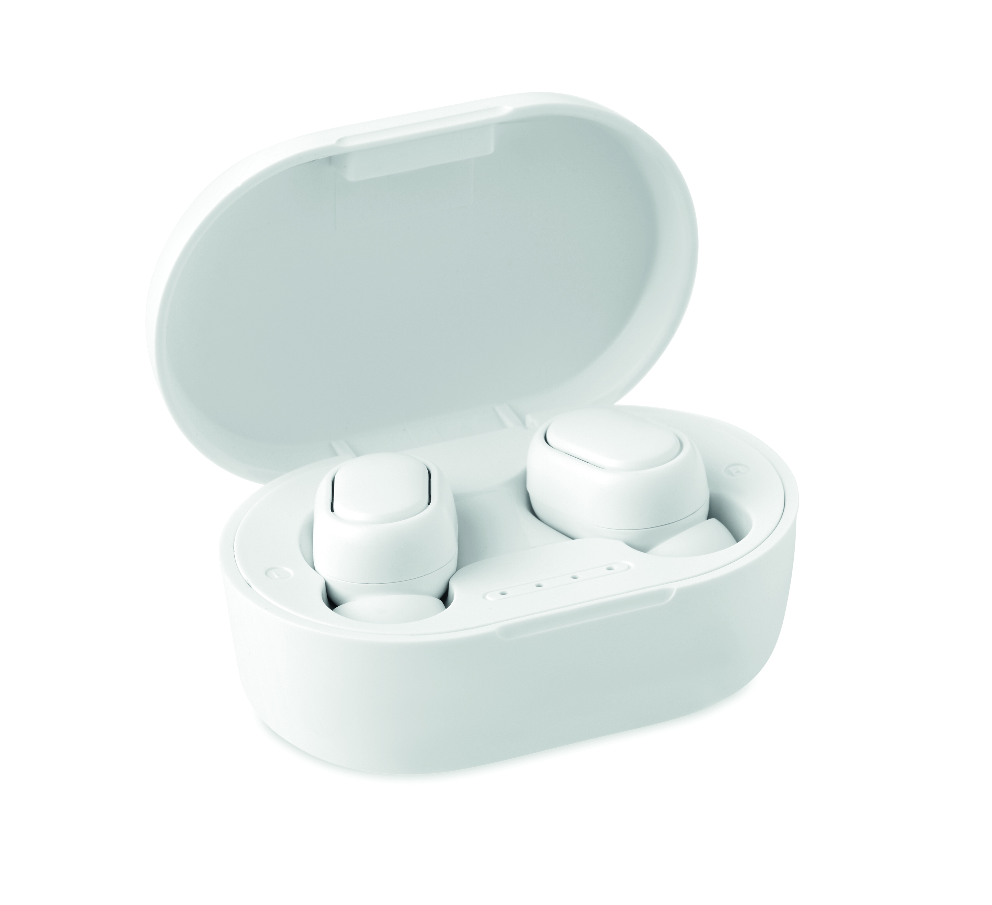 Bezprzewodowe stereofoniczne słuchawki douszne z mikrofonem i wbudowanym akumulatorem 40 mAh z ABS z recyklingu True Wireless Stereo (TWS) 5.3. Czas odtwarzania około 4 godziny. Autometyczne parowanie. W zestawie kabel do ładowania micro USB i stacja ładowania 300 mAh.