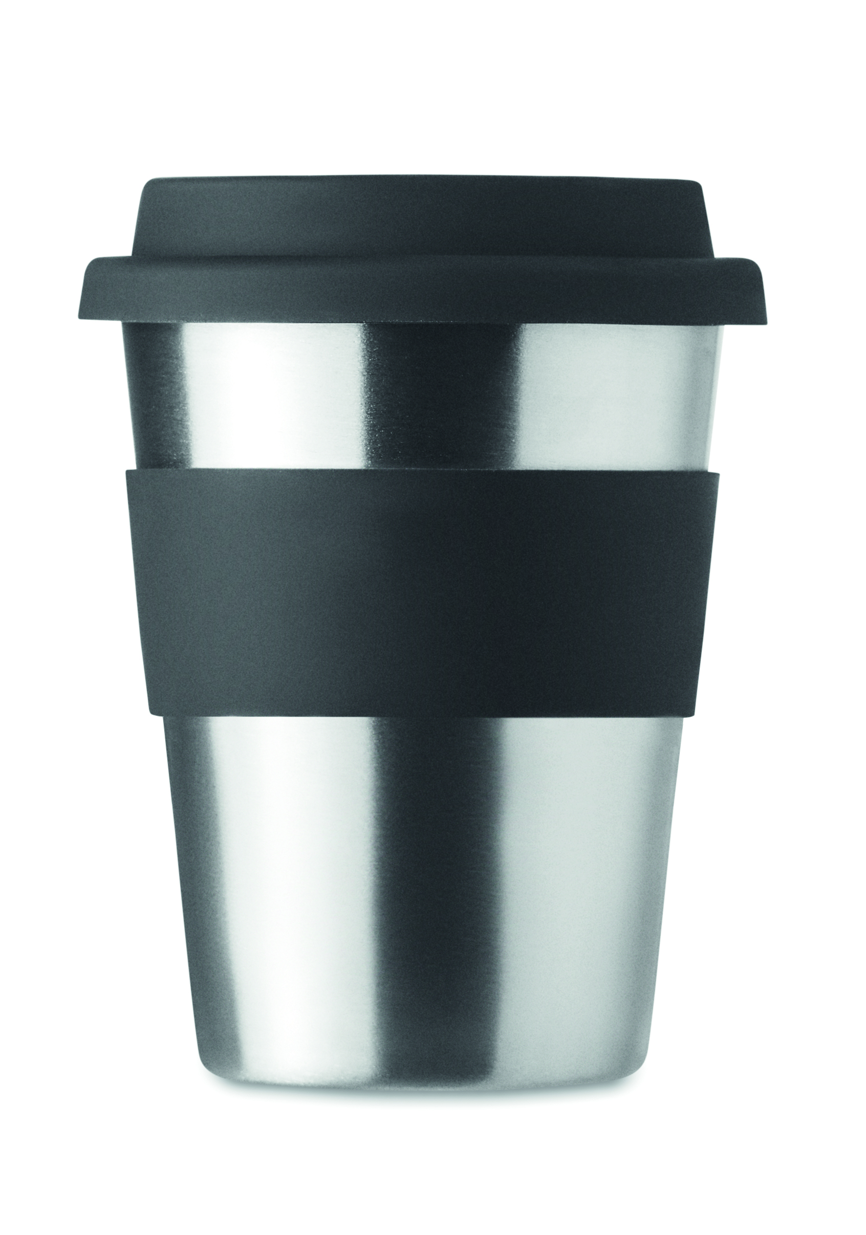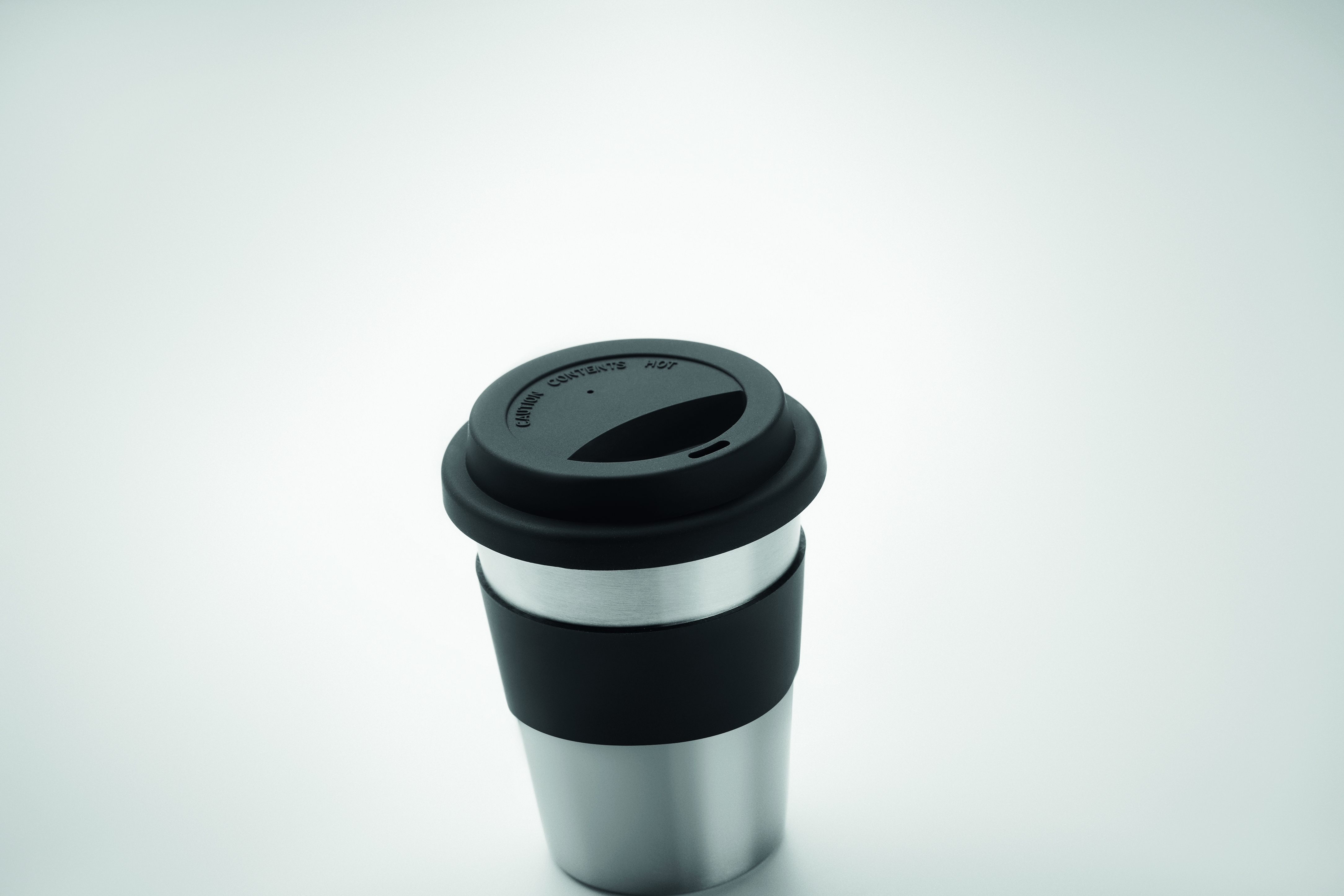 Jednościenny kubek ze stali nierdzewnej z silikonową pokrywką i uchwytem. Pojemność 350 ml. Ponieważ jest to kubek z pojedynczą ścianką, może dochodzić do wymiany ciepła.