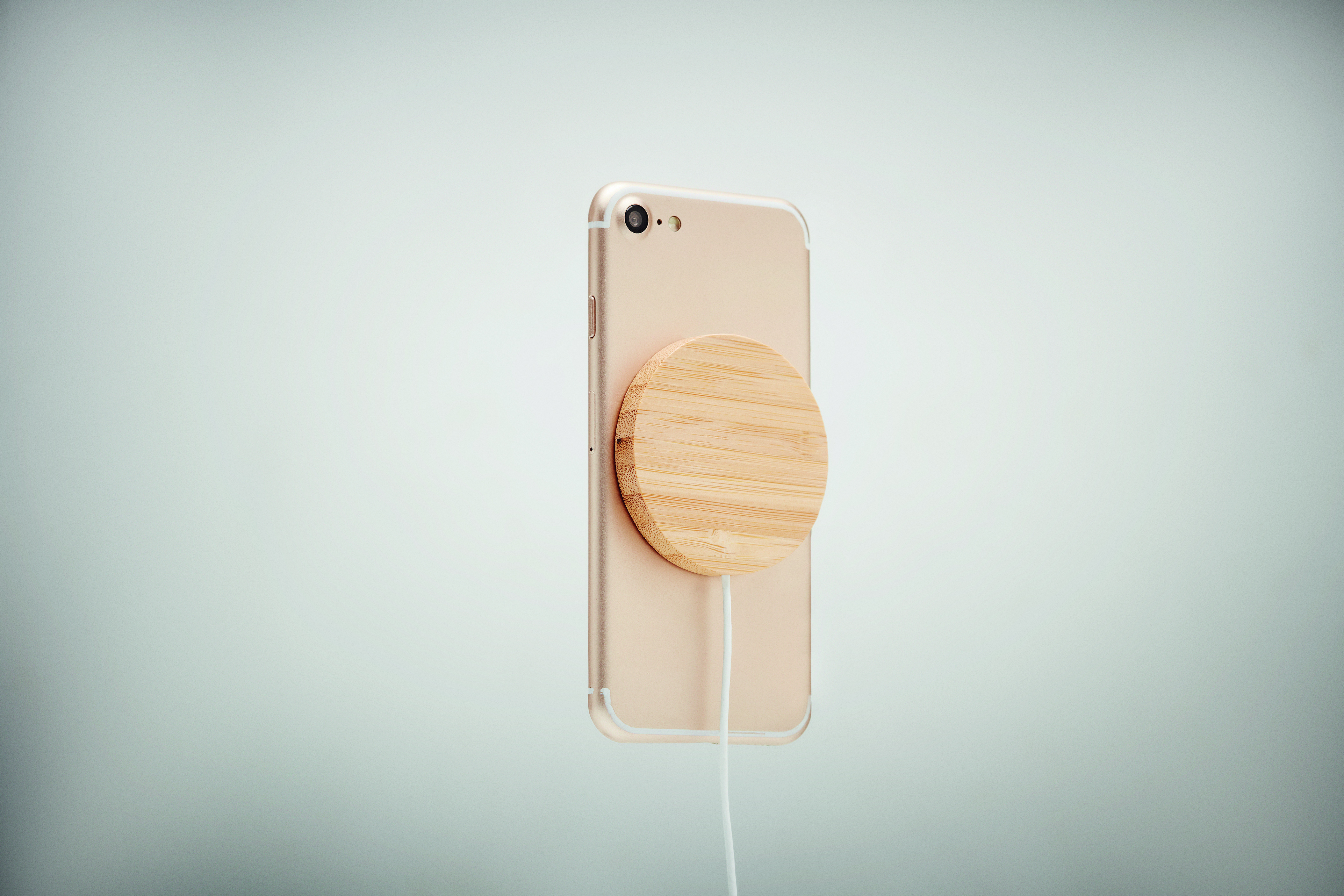 Magnetyczna bambusowa ładowarka bezprzewodowa. Wyjście: DC 9V/1.1A (10W) do szybkiego ładowania. W tym dodatkowy magnetyczny metalowy pierścień do ładowania innych niemagnetycznych telefonów z funkcją bezprzewodowego ładowania. Bambus jest produkt