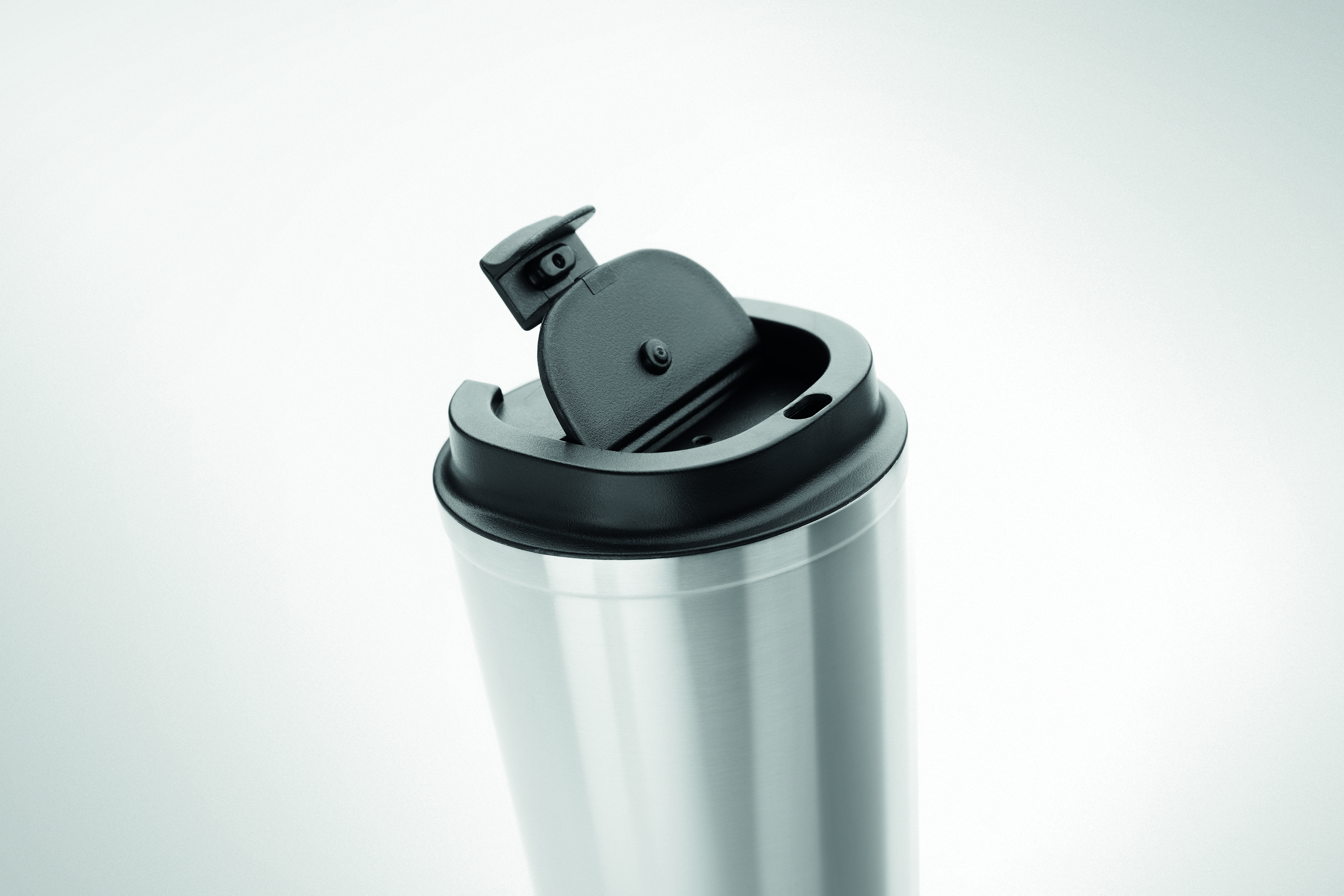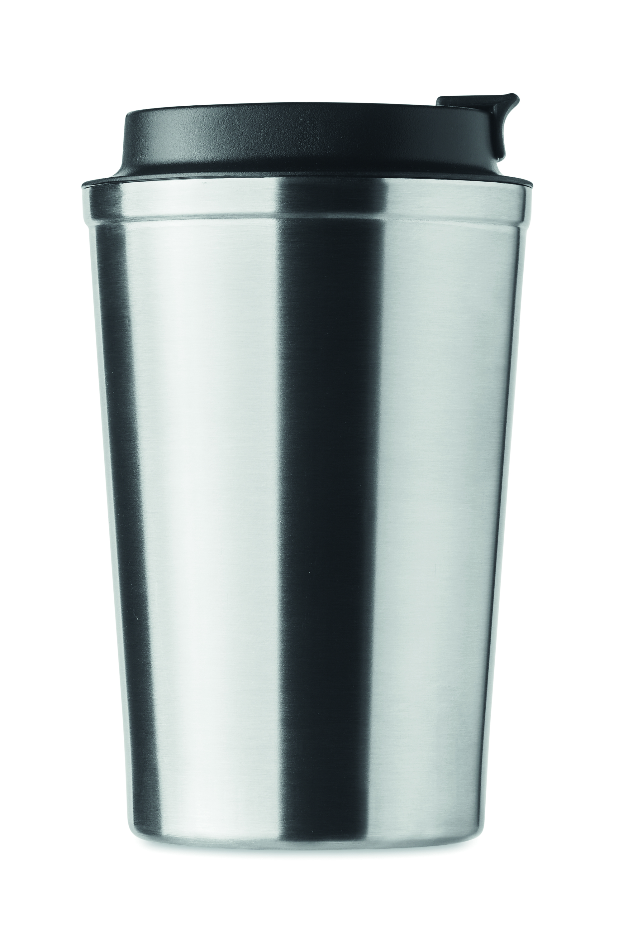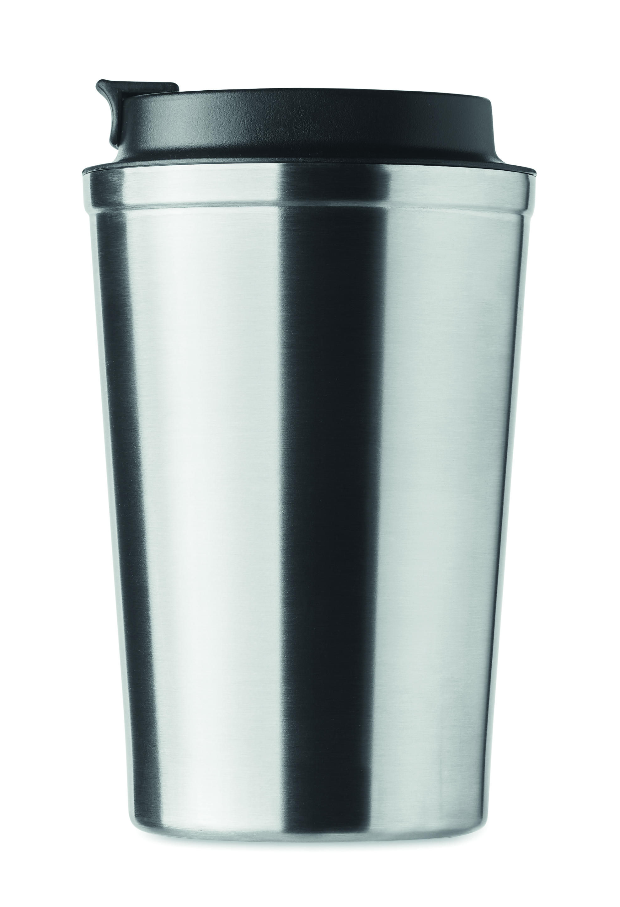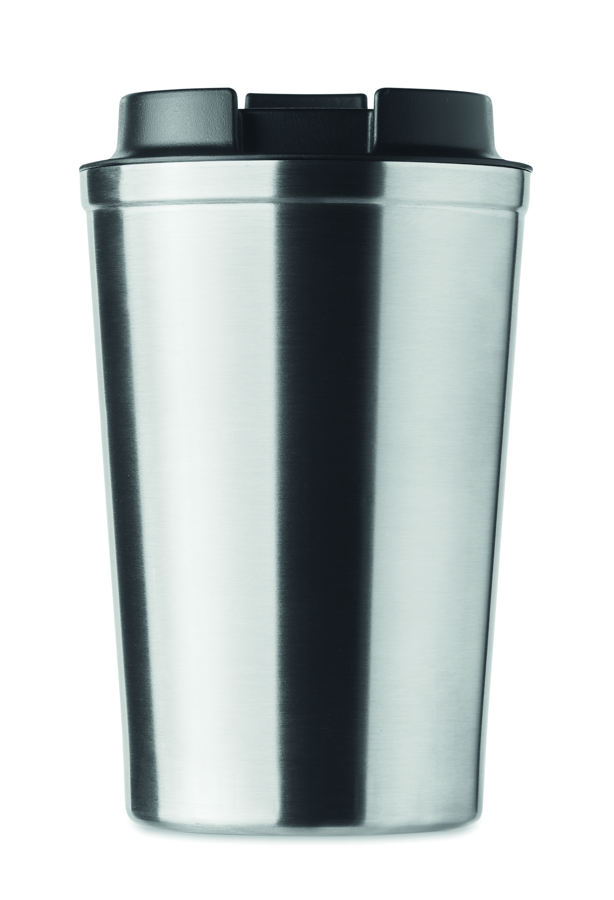 Dwuścienny kubek ze stali nierdzewnej z pokrywką z PP. Pojemność: 350 ml. Szczelny.