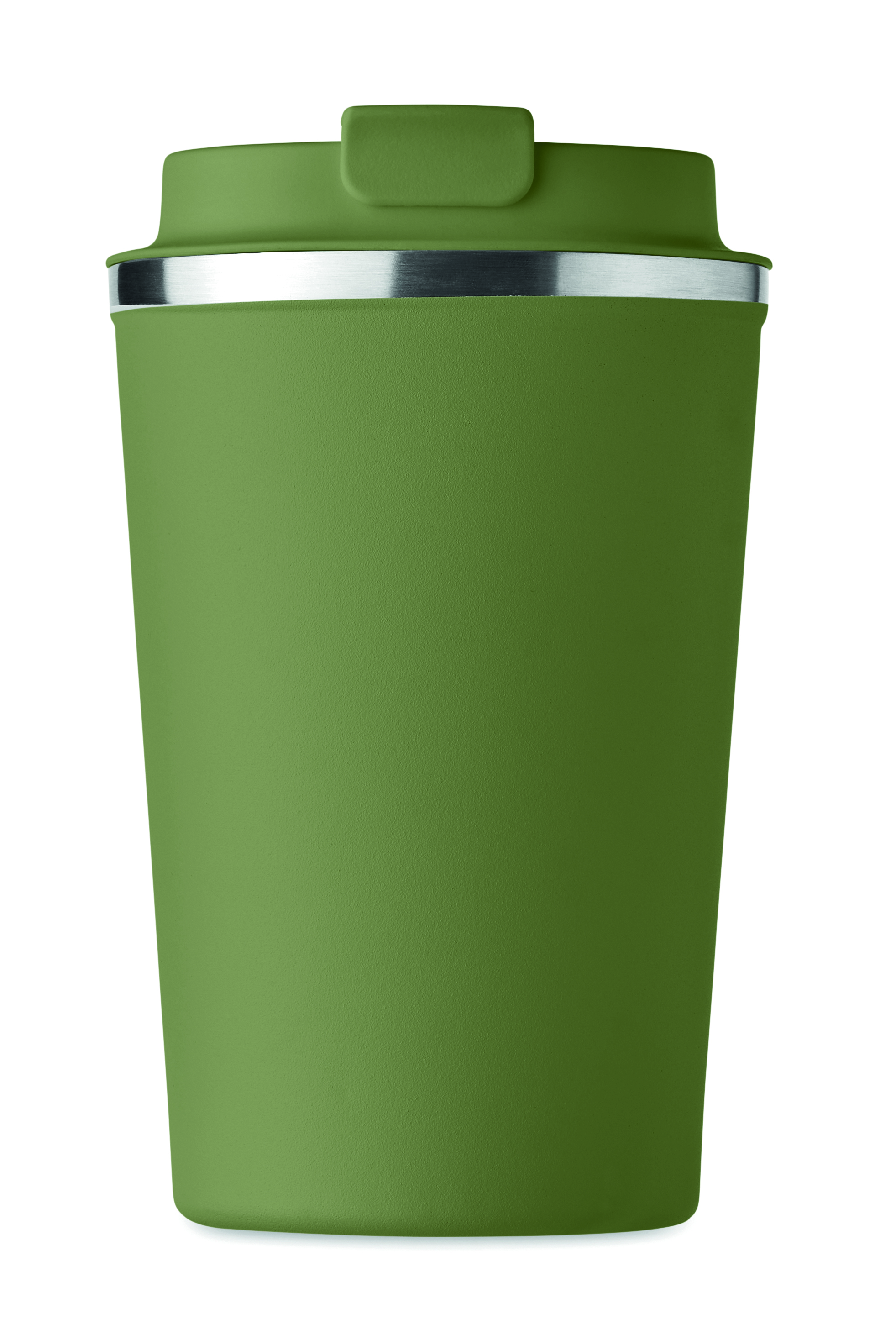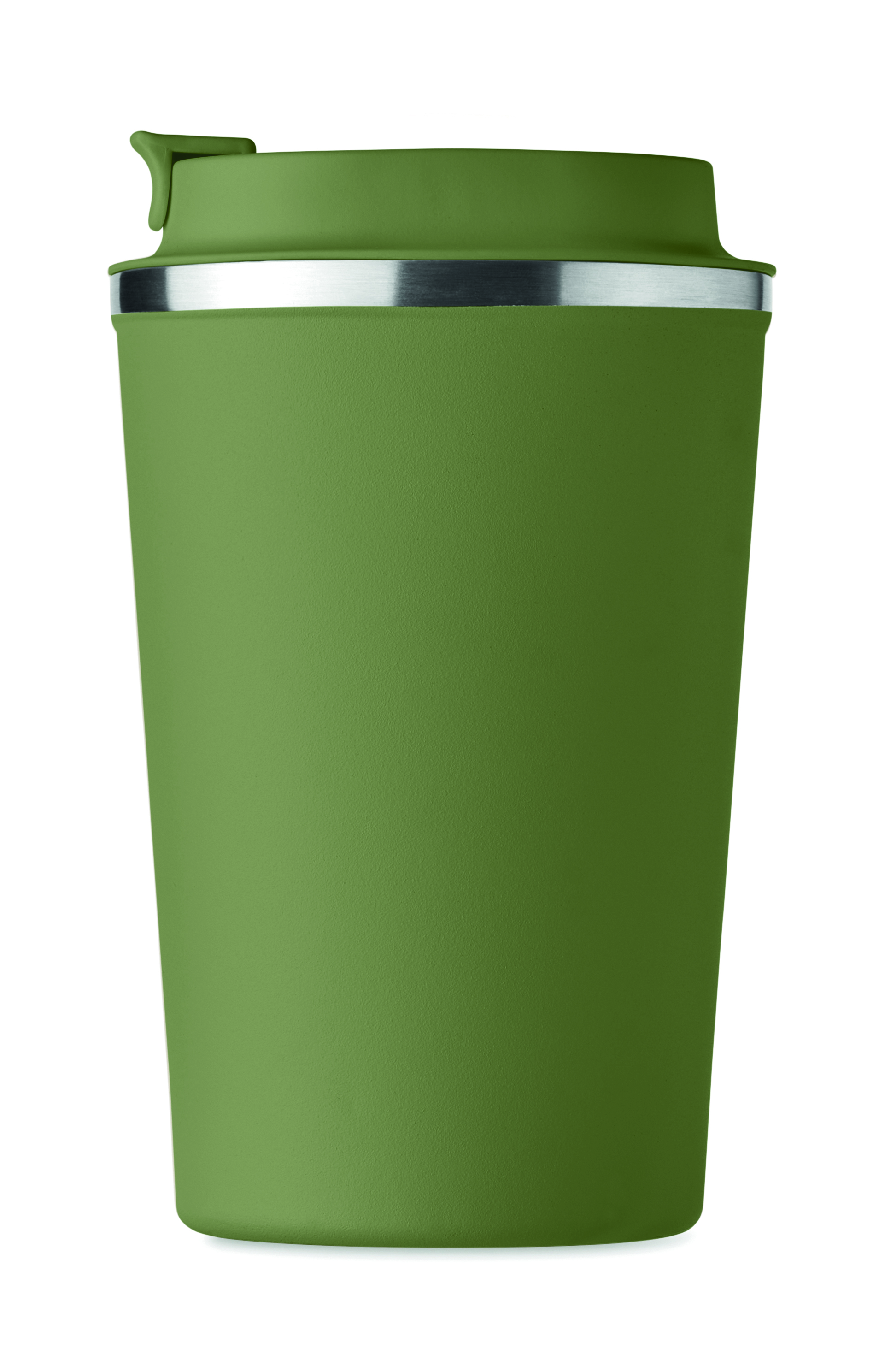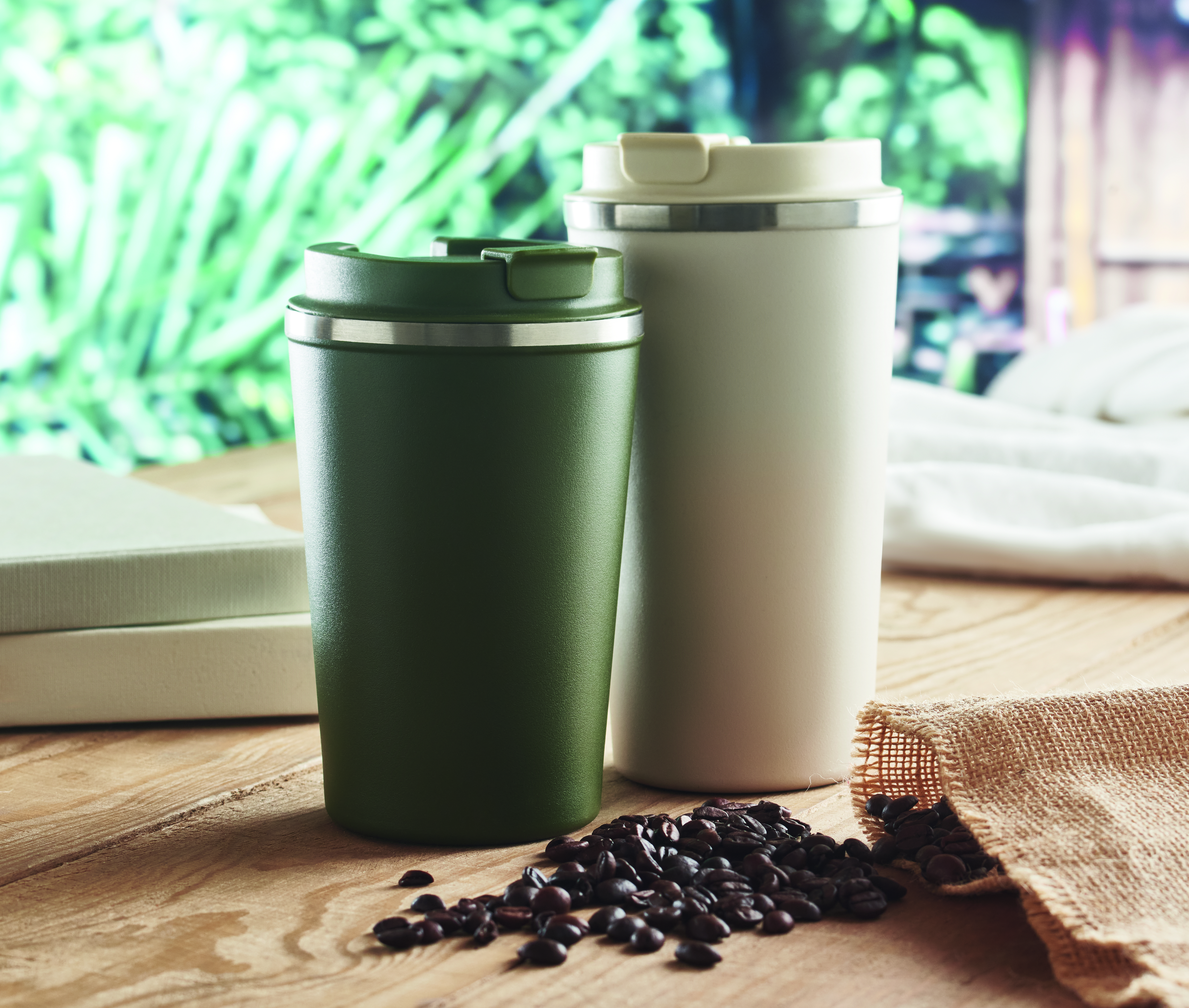Dwuścienny kubek ze stali nierdzewnej z pokrywką z PP. Pojemność: 350 ml. Szczelny.