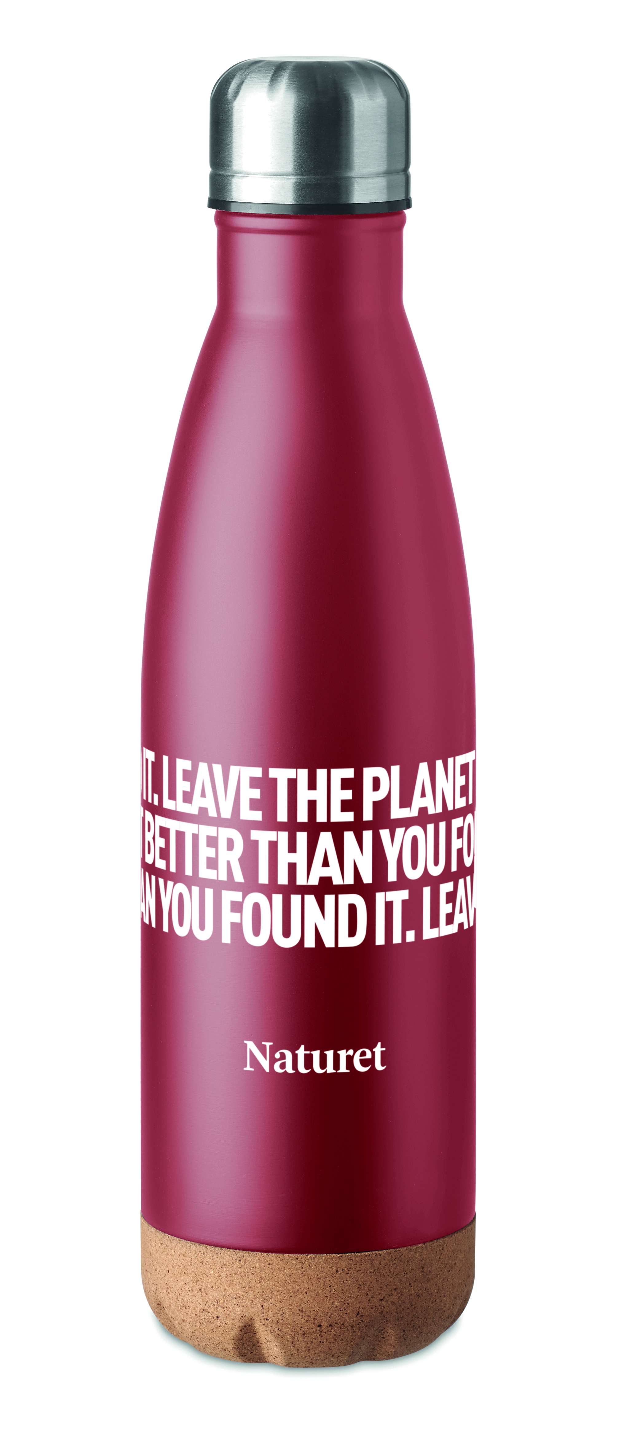 Butelka próżniowa z podwójną ścianką ze stali nierdzewnej z korkową podstawą. Pojemność: 500 ml. Szczelna. Korek jest materiałem w 100% naturalnym. Ze względu na jego strukturę i porowatość powierzchni ostateczny wygląd nadruku na każdym artykule może się różnić.