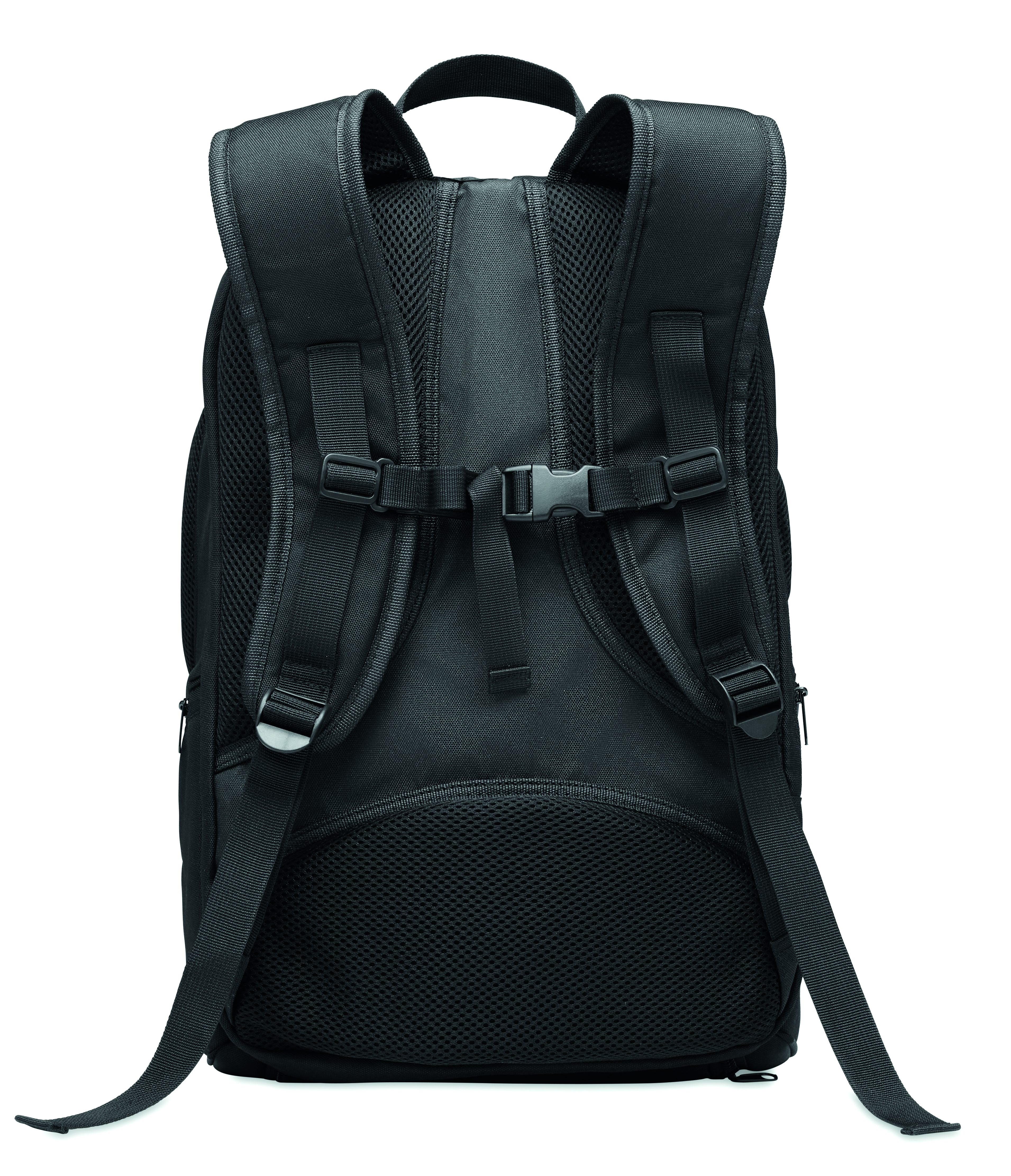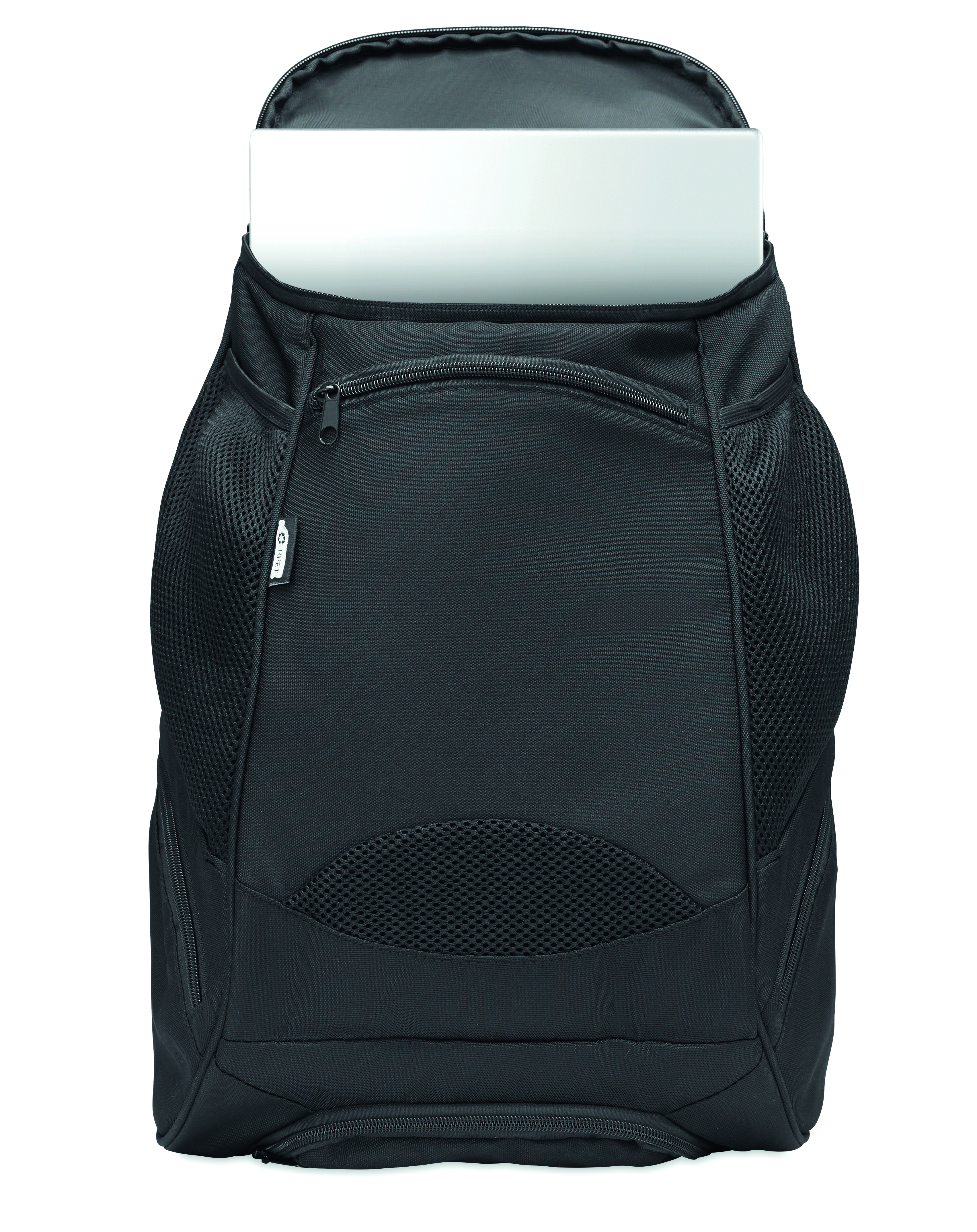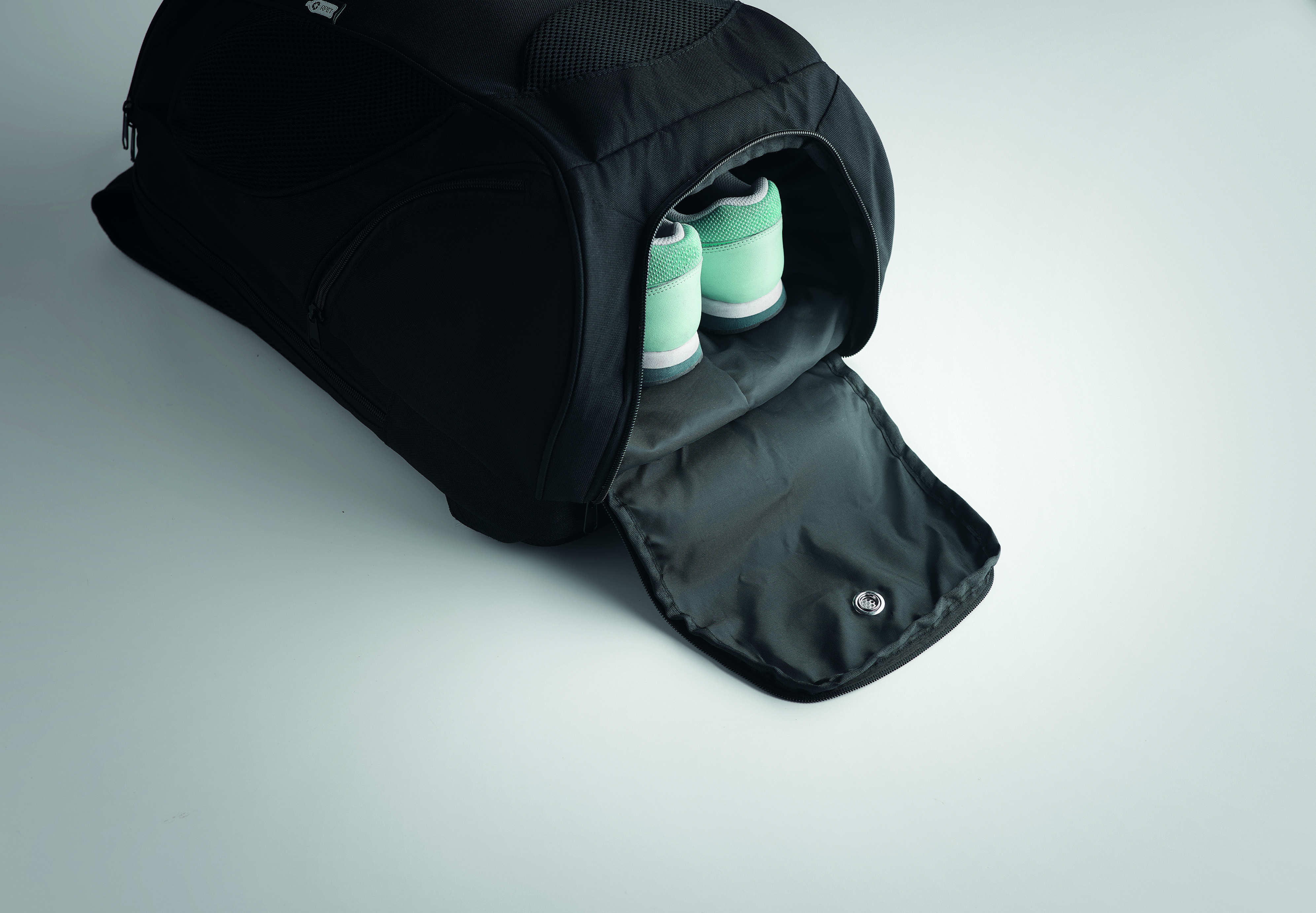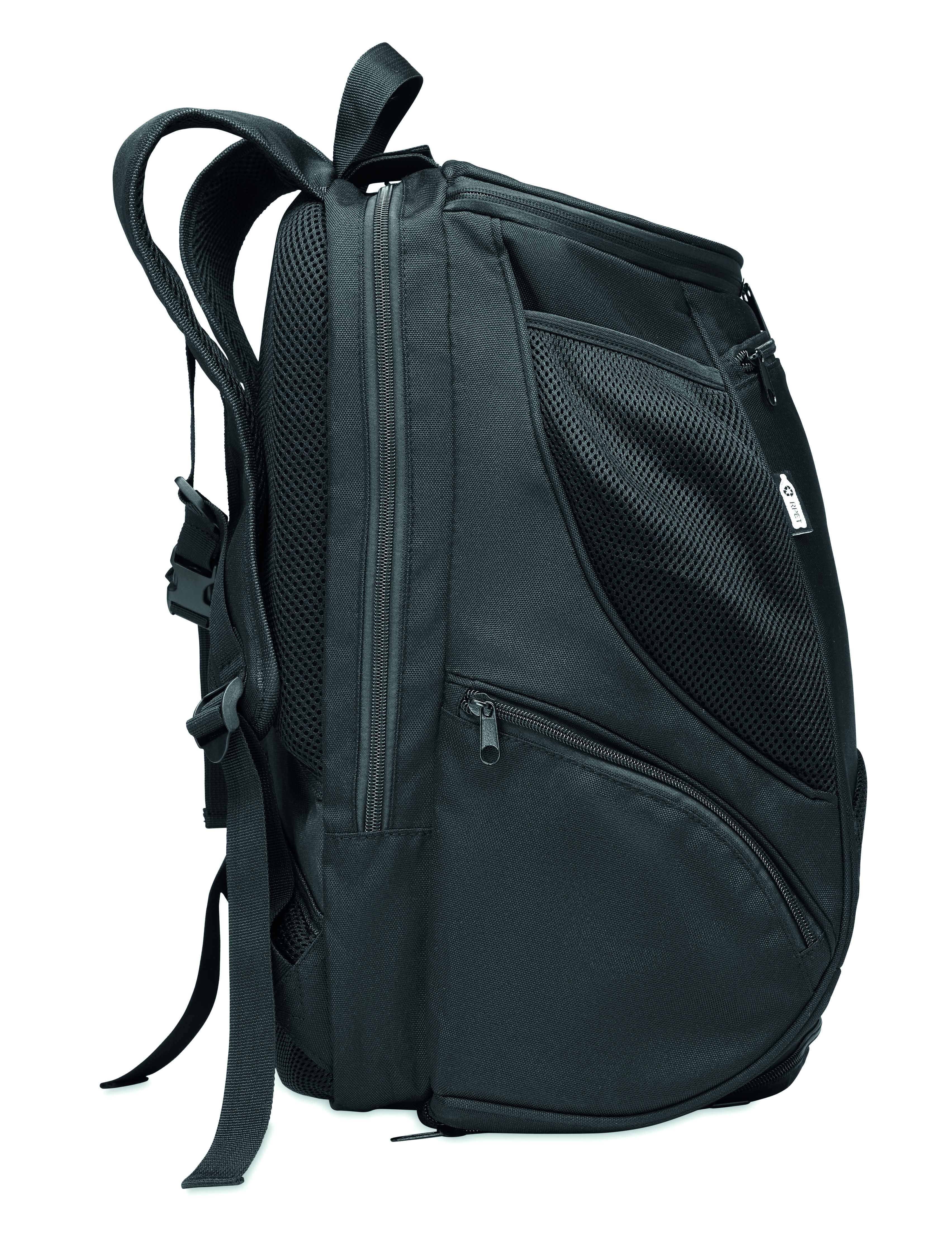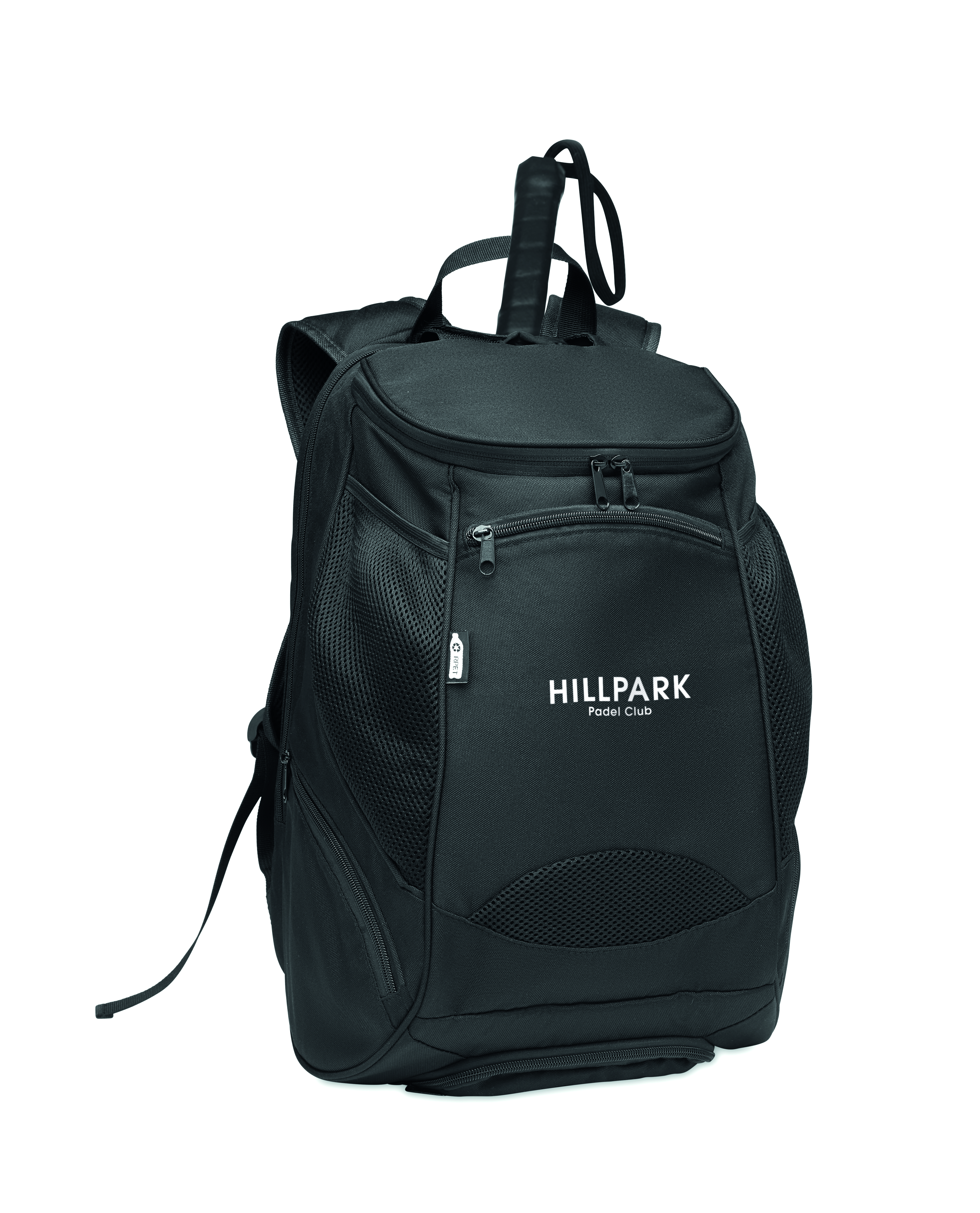 Wielofunkcyjny plecak sportowy 600D RPET z kilkoma przegrodami (w tym wyściełana przegroda na rakietkę do padla). Posiada regulowany pasek na ramię.