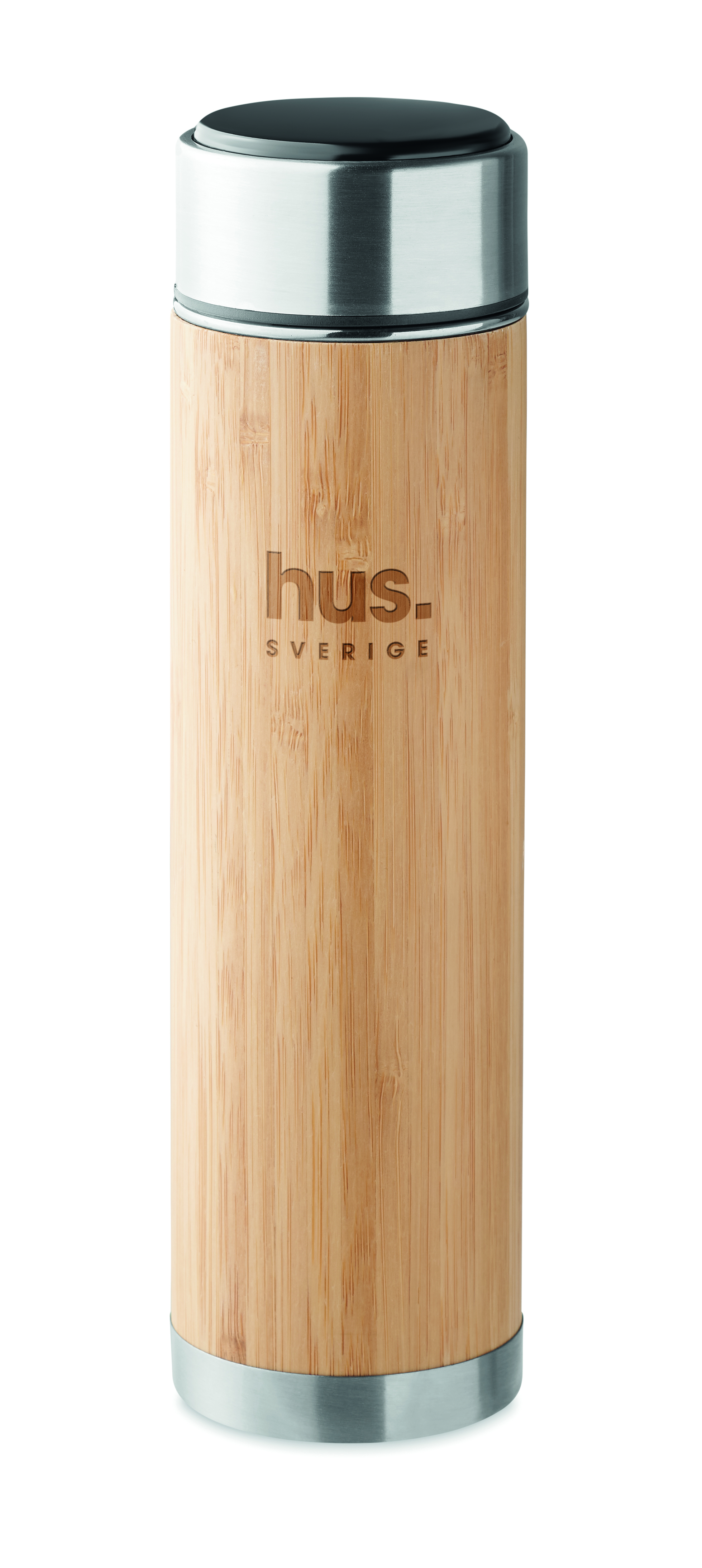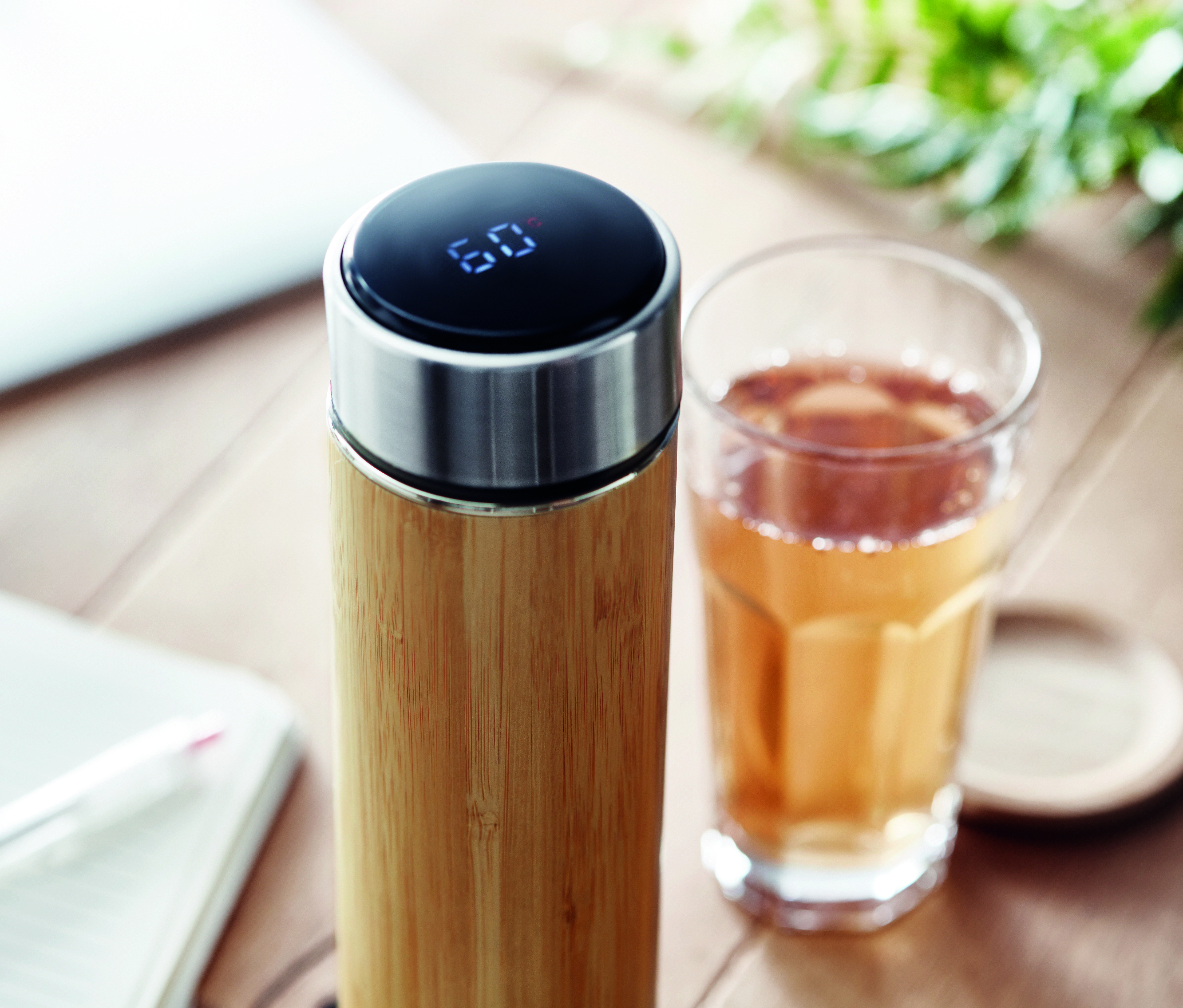 Termos z podwójnymi ściankami, wykonany ze stali nierdzewnej i bambusa, z filtrem do herbaty. Z wbudowanym termometrem dotykowym LED w pokrywie. Zawiera 1 wymienną baterię CR2032. Pojemność: 480 ml. Szczelny. Bambus jest produktem naturalnym, dlatego mogą wystąpić nieznaczne różnice w kolorze, wzorze i rozmiarze.
