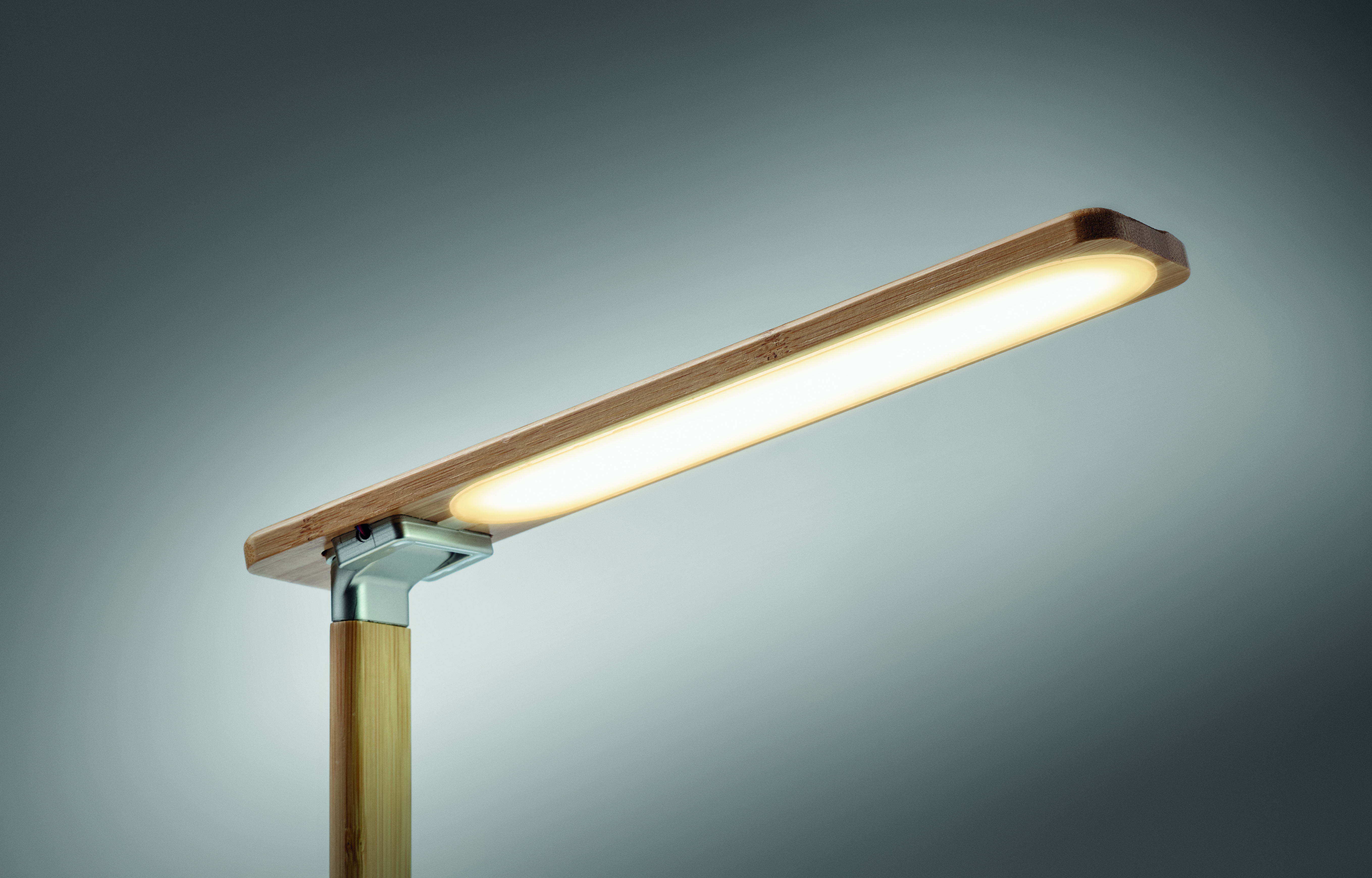 Składana bambusowa lampa biurkowa z 48 światłami LED , 10W bezprzew. ładowanie, 2 huby USB. Ekran dotykowy. Wyjście: DC 9V/1.1A (10W) do szybkiego ładowania. Bambus jest produktem naturalnym, dlatego mogą wystąpić nieznaczne różnice w kolorze, w