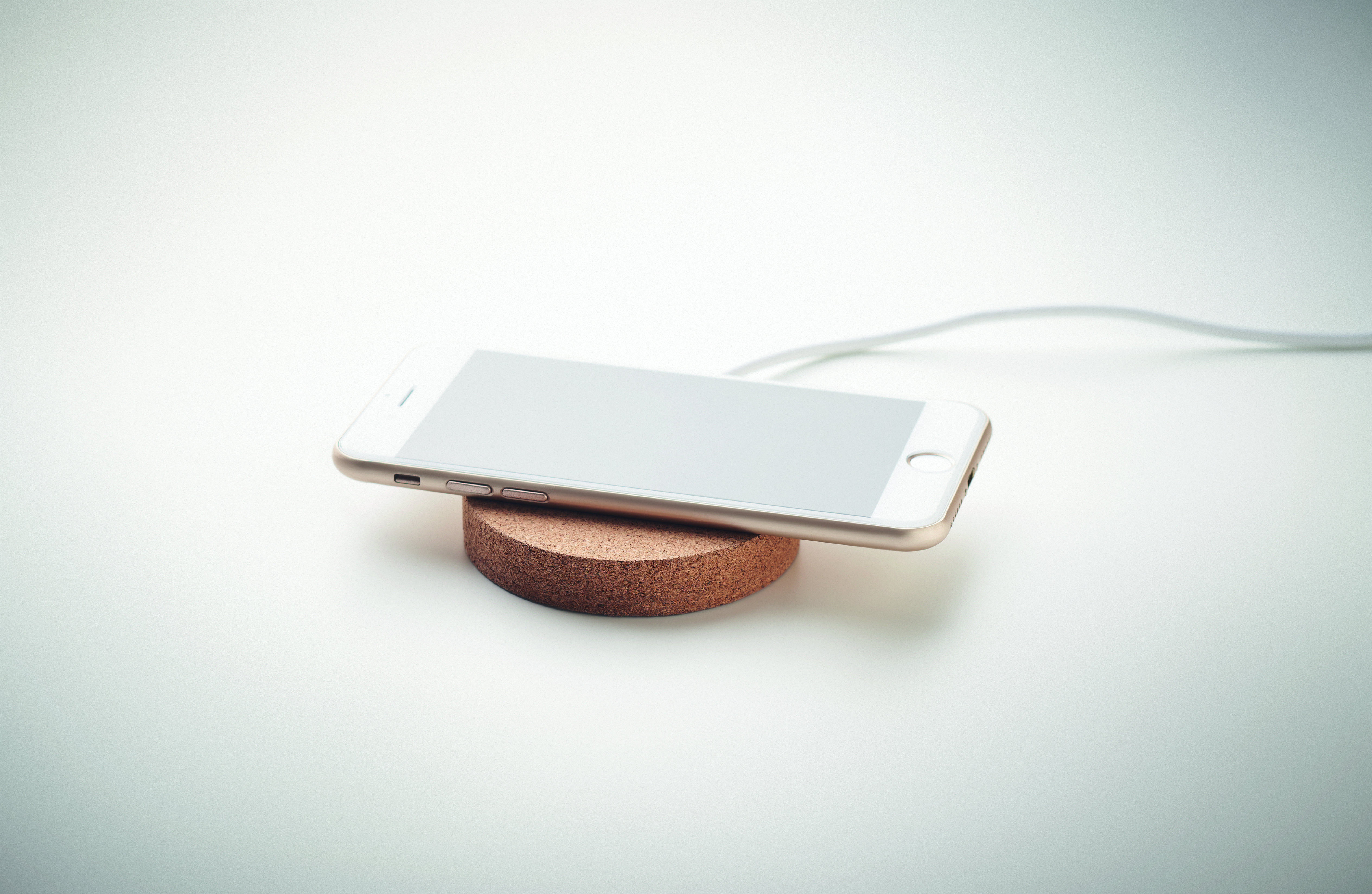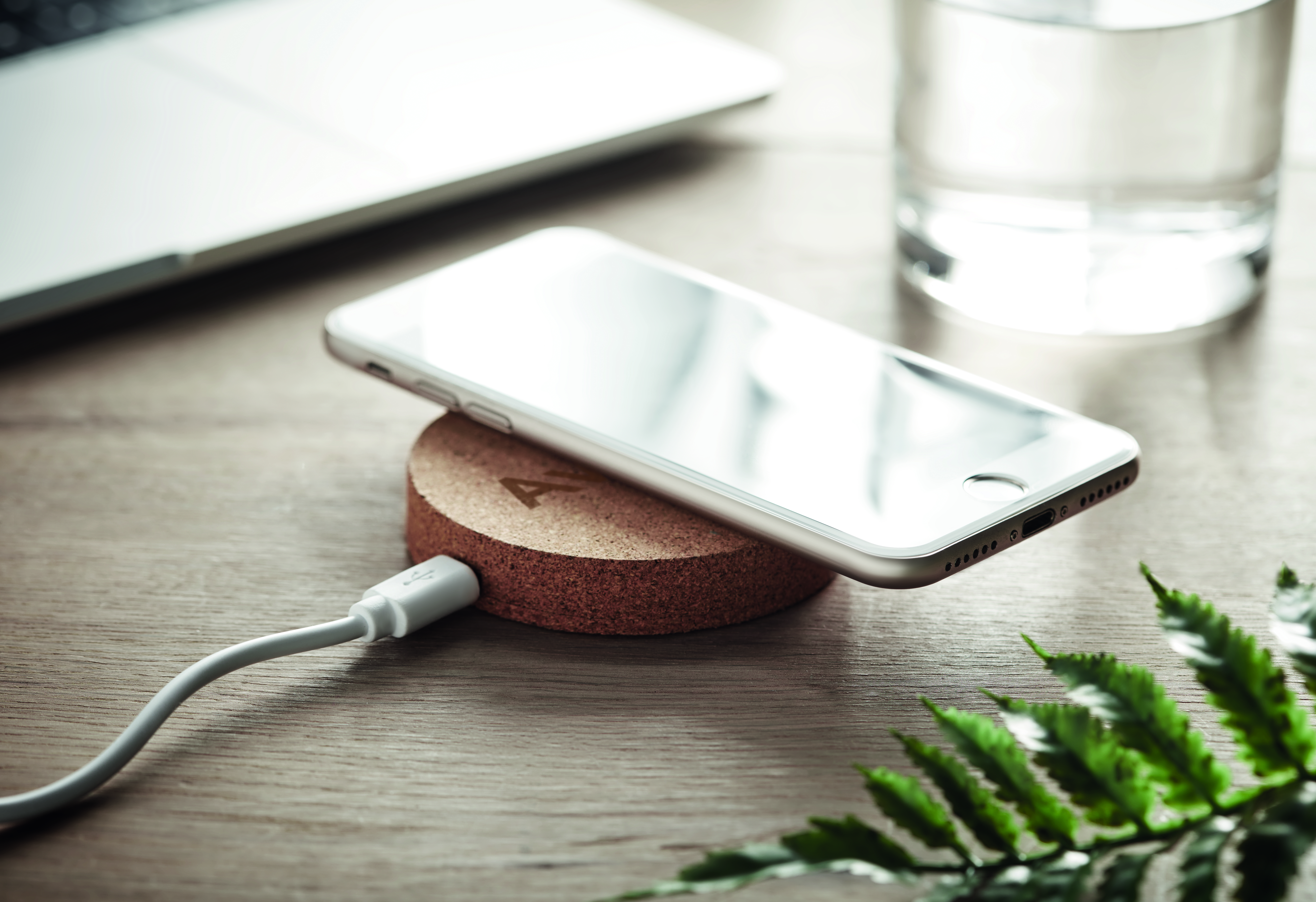 Okrągła korkowa bezprzewodowa ładowarka. Wyjście: DC 9V/1.1A (10W). Korek jest materiałem w 100% naturalnym. Ze względu na jego strukturę i porowatość powierzchni ostateczny wygląd nadruku na każdym artykule może się różnić.