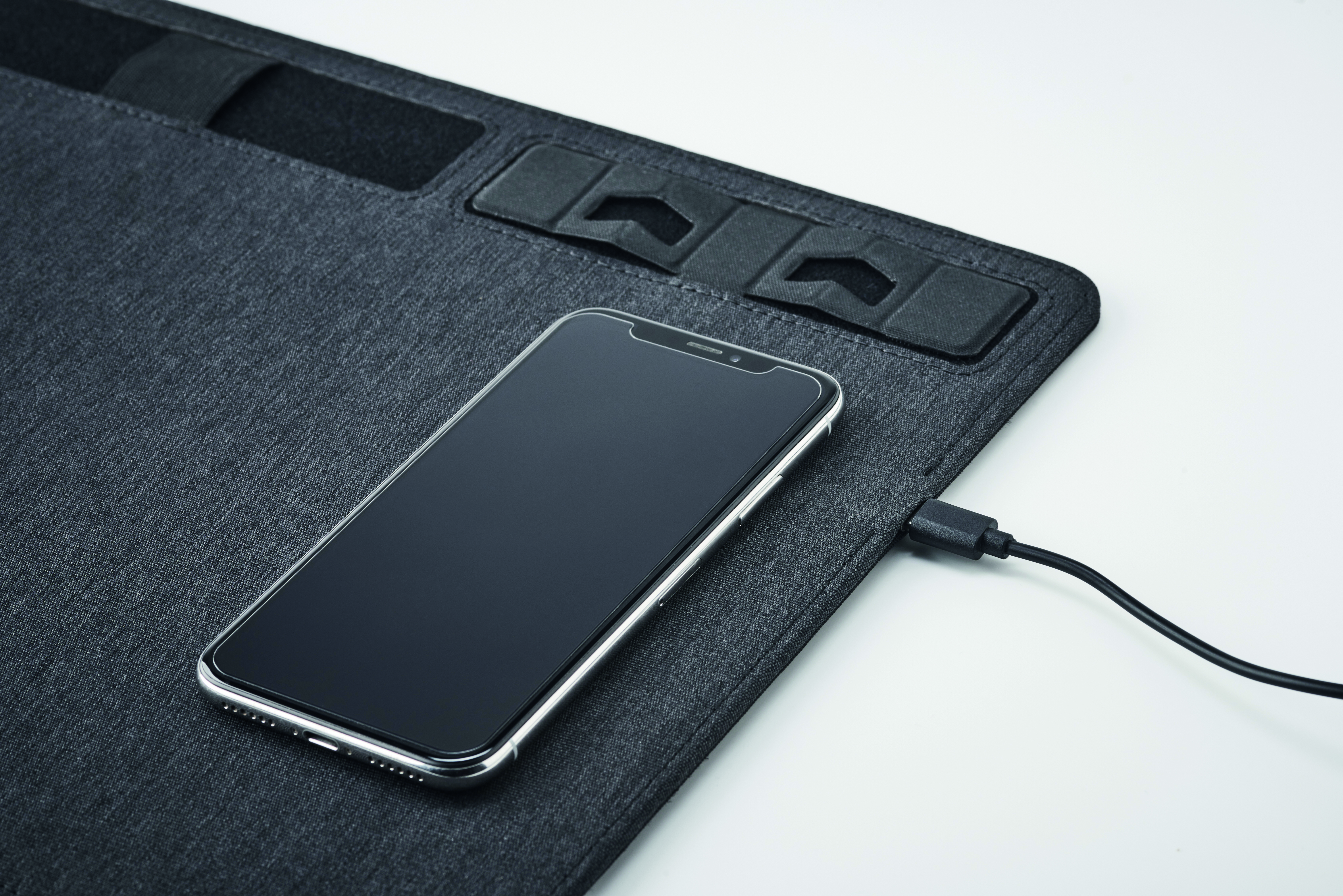 Wielofunkcyjna podkładka pod myszkę 300D Poliester RPET z 15W ładowarką bezprzewodową i funkcją podstawki pod telefon. Wyjście: DC 9V/1.6A (15W) do szybkiego ładowania.
