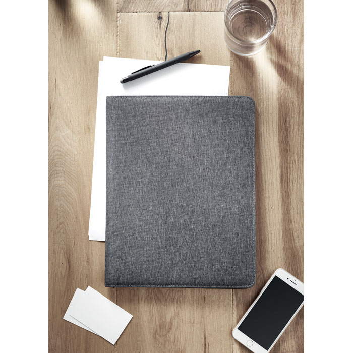 Teczka w formacie A4 w dwóch odcieniach 300D RPET. Zawiera wewnętrzne przegródki i pętelkę na długopis. Zawiera 20-kartkowy notatnik z podszewką. Bambus jest produktem naturalnym, dlatego mogą wystąpić nieznaczne różnice w kolorze, wzorze i rozmiarze.