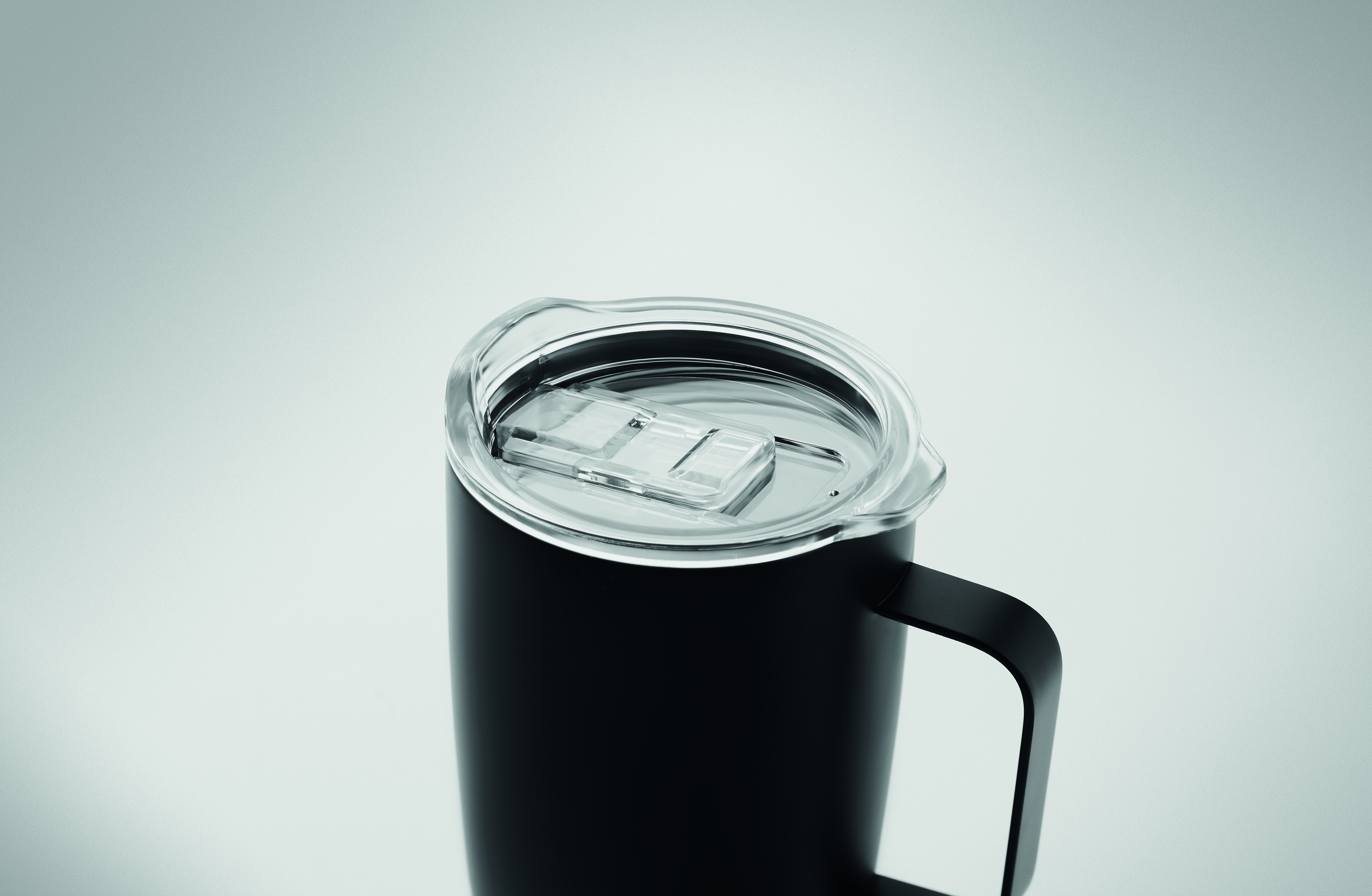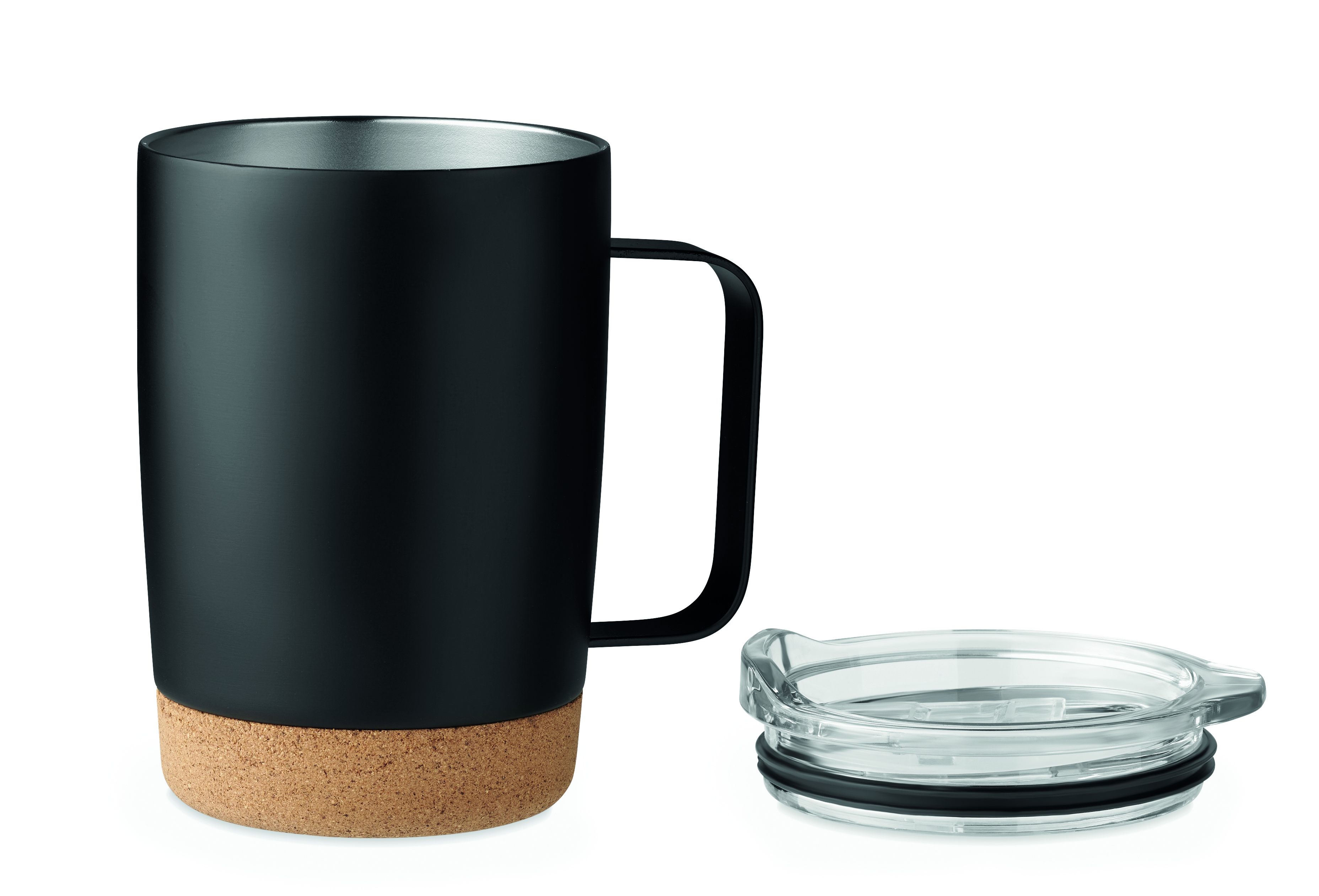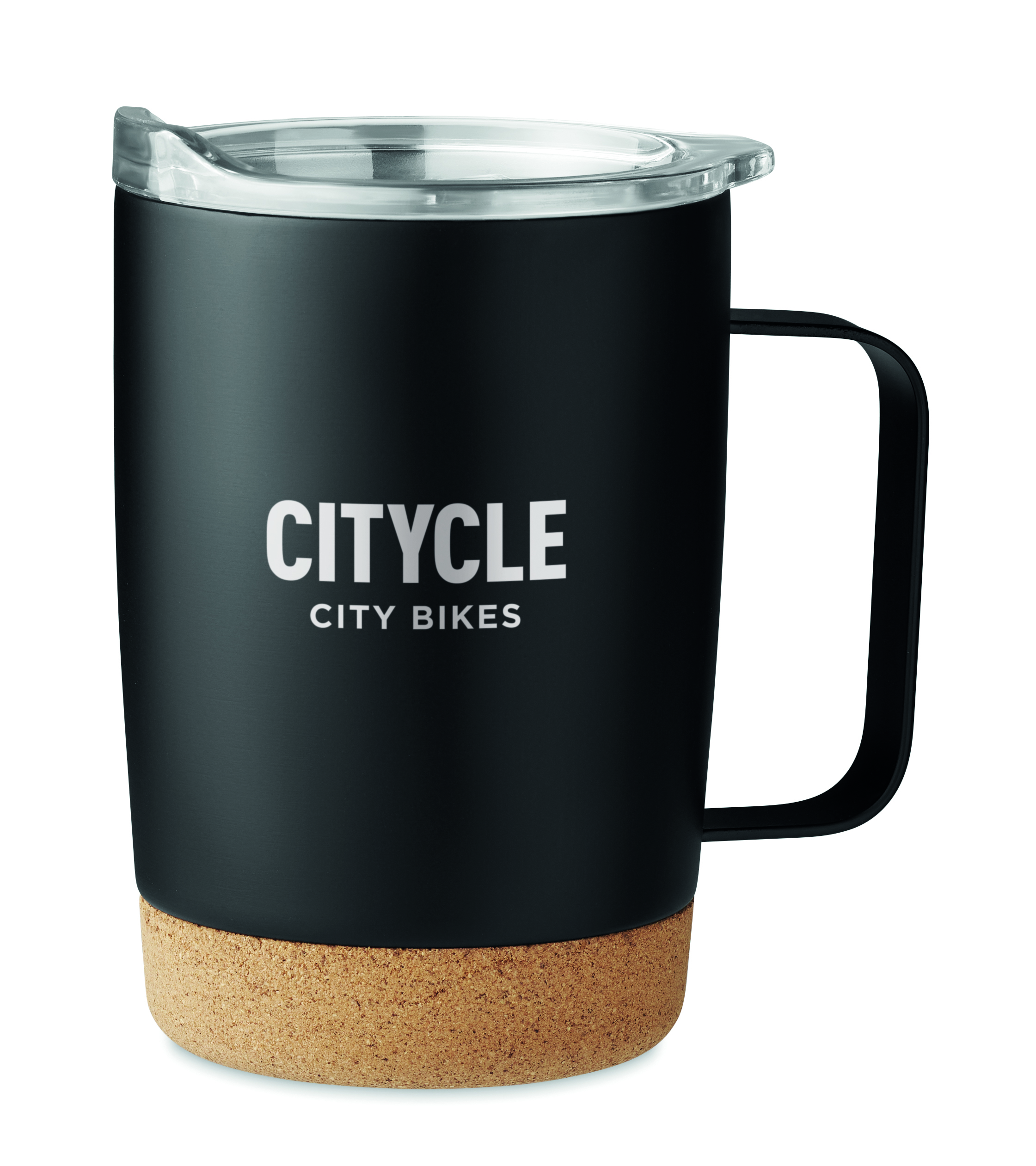 Dwuścienny kubek ze stali nierdzewnej z korkową podstawą i przesuwaną pokrywą z otworem. Pojemność: 300 ml. Korek jest materiałem w 100% naturalnym. Ze względu na jego strukturę i porowatość powierzchni ostateczny wygląd nadruku na każdym artykule może się różnić.
