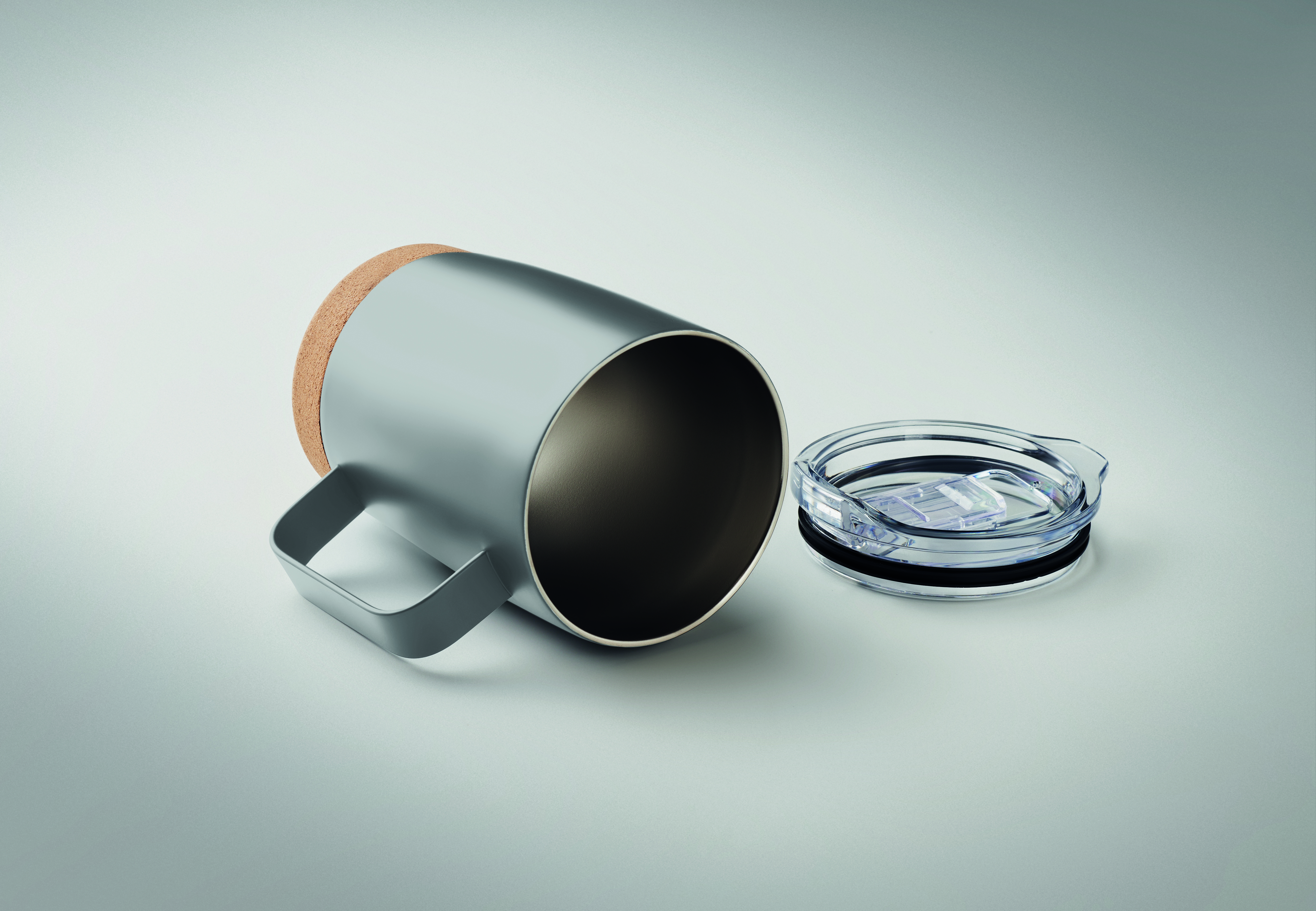 Dwuścienny kubek ze stali nierdzewnej z korkową podstawą i przesuwaną pokrywą z otworem. Pojemność: 300 ml. Korek jest materiałem w 100% naturalnym. Ze względu na jego strukturę i porowatość powierzchni ostateczny wygląd nadruku na każdym artykule może się różnić.