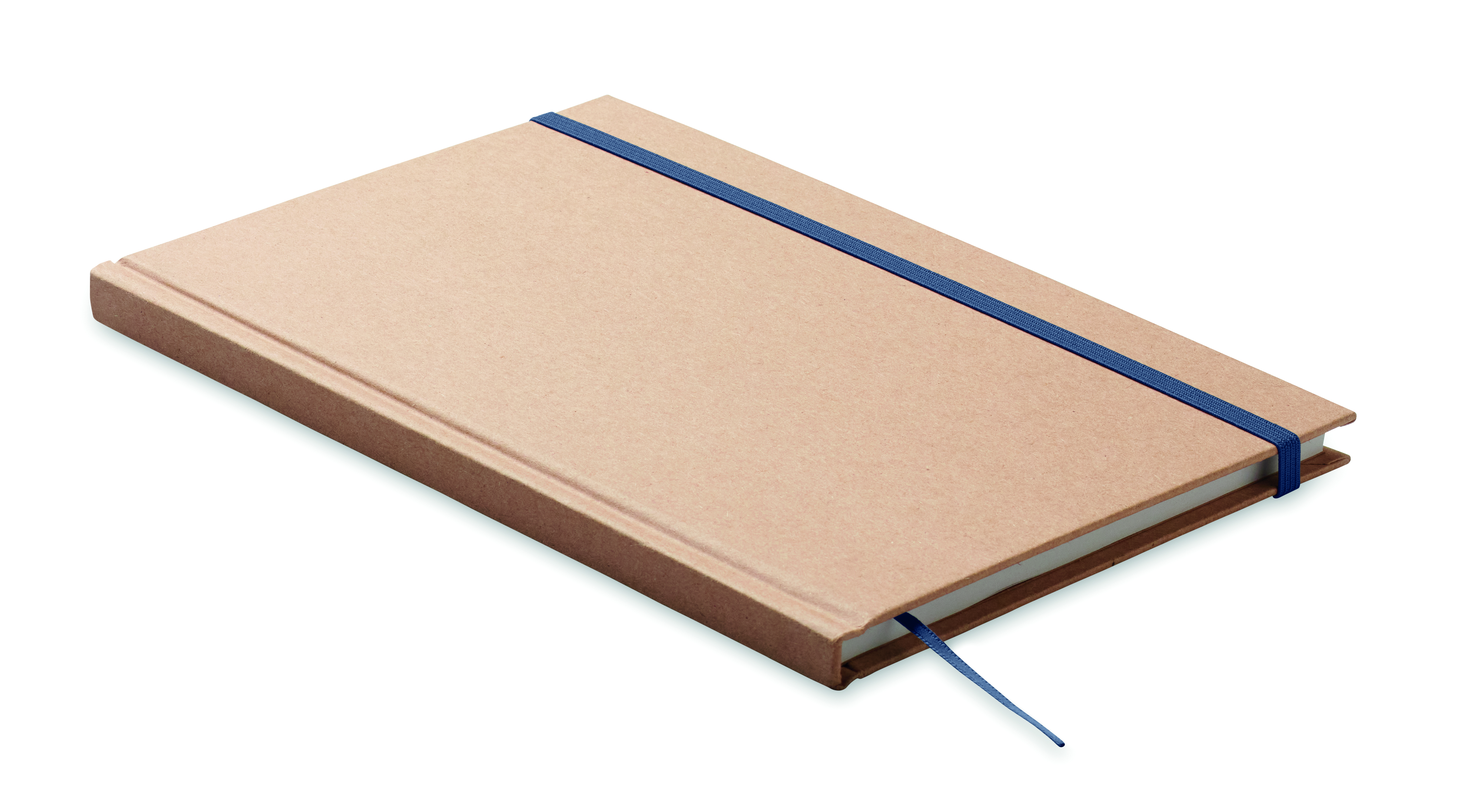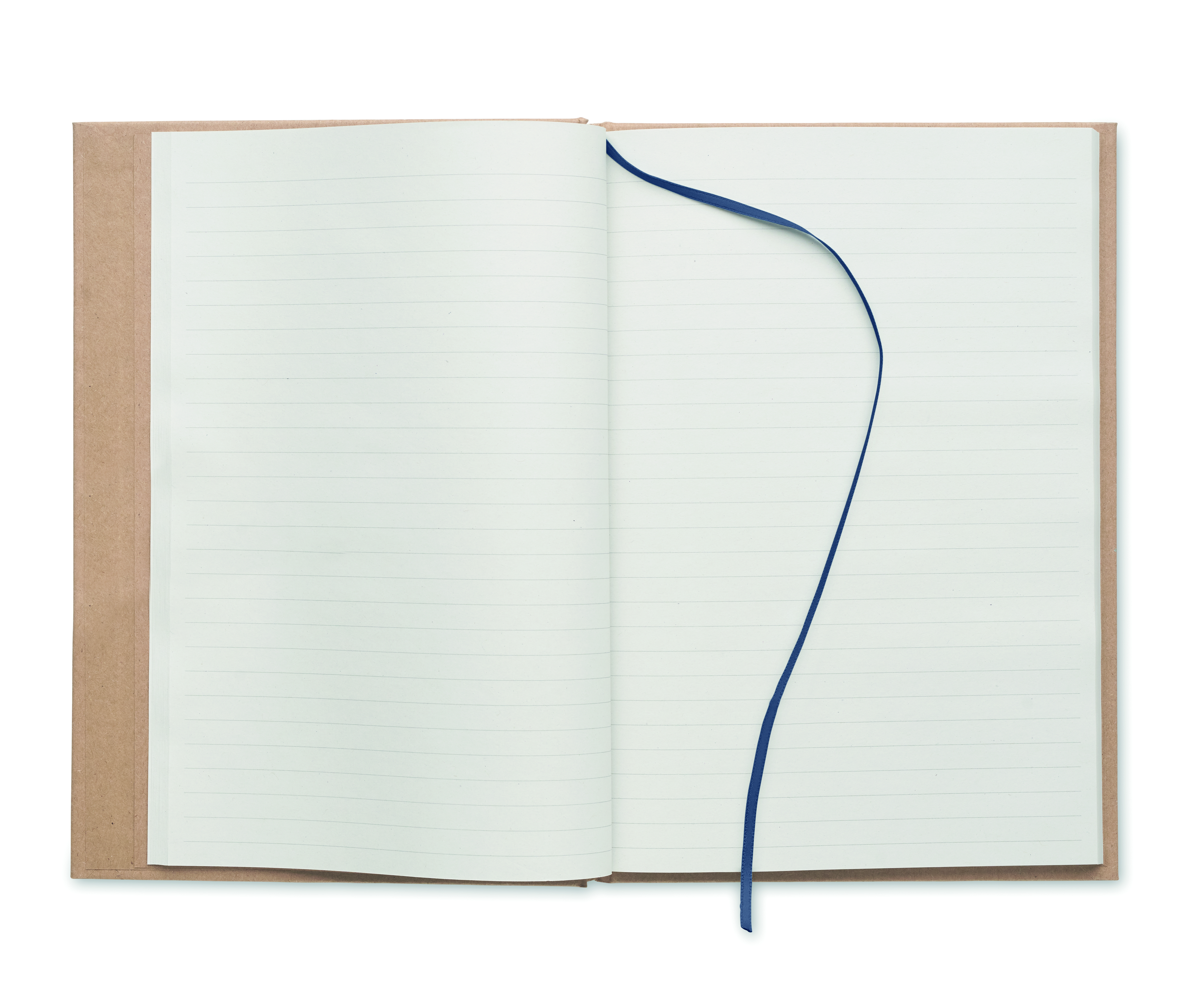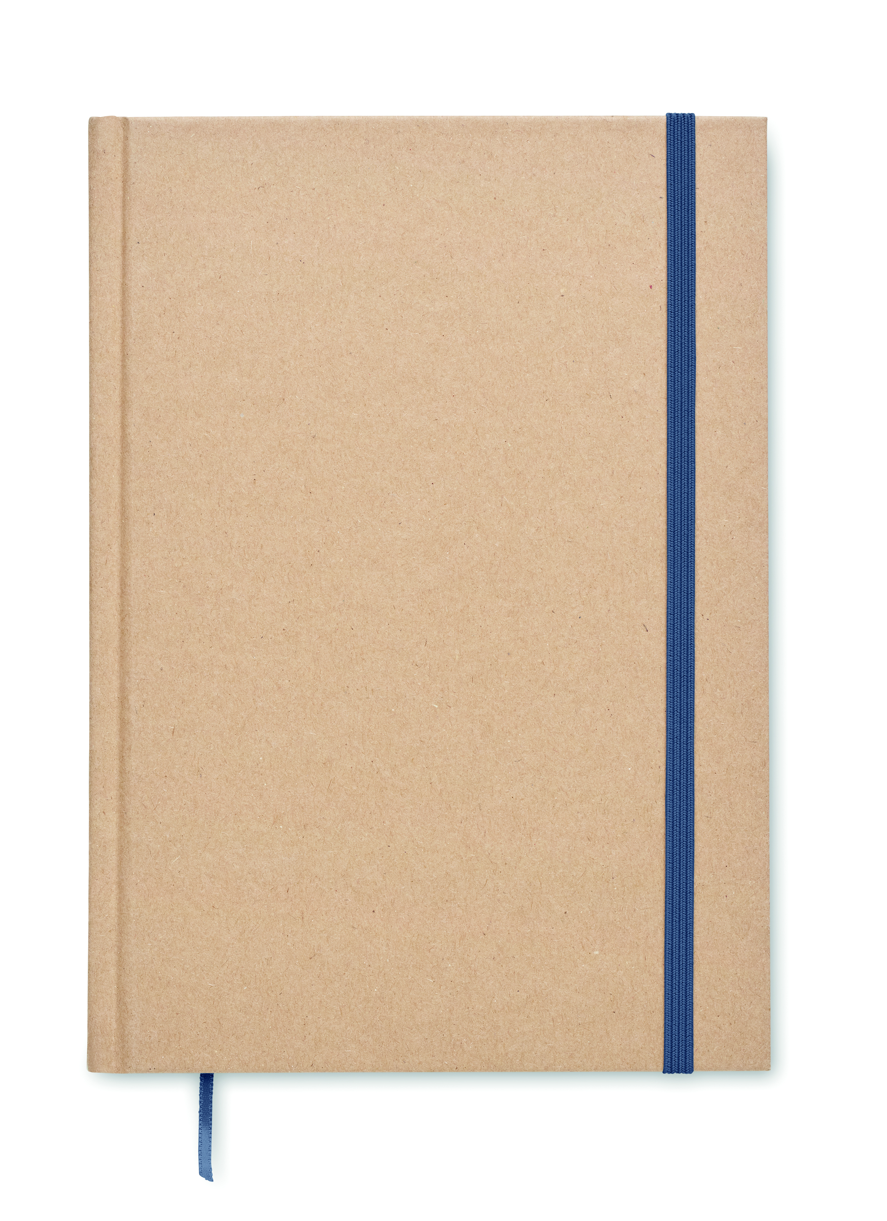 Notatnik A5 w twardej okładce z kartonu z recyklingu. 200 stron w linie z papieru makulaturowego (100 kartek 80 g/m²). Dopasowana gumka zamykająca i tasiemka do oznaczania stron. Made in EU.
