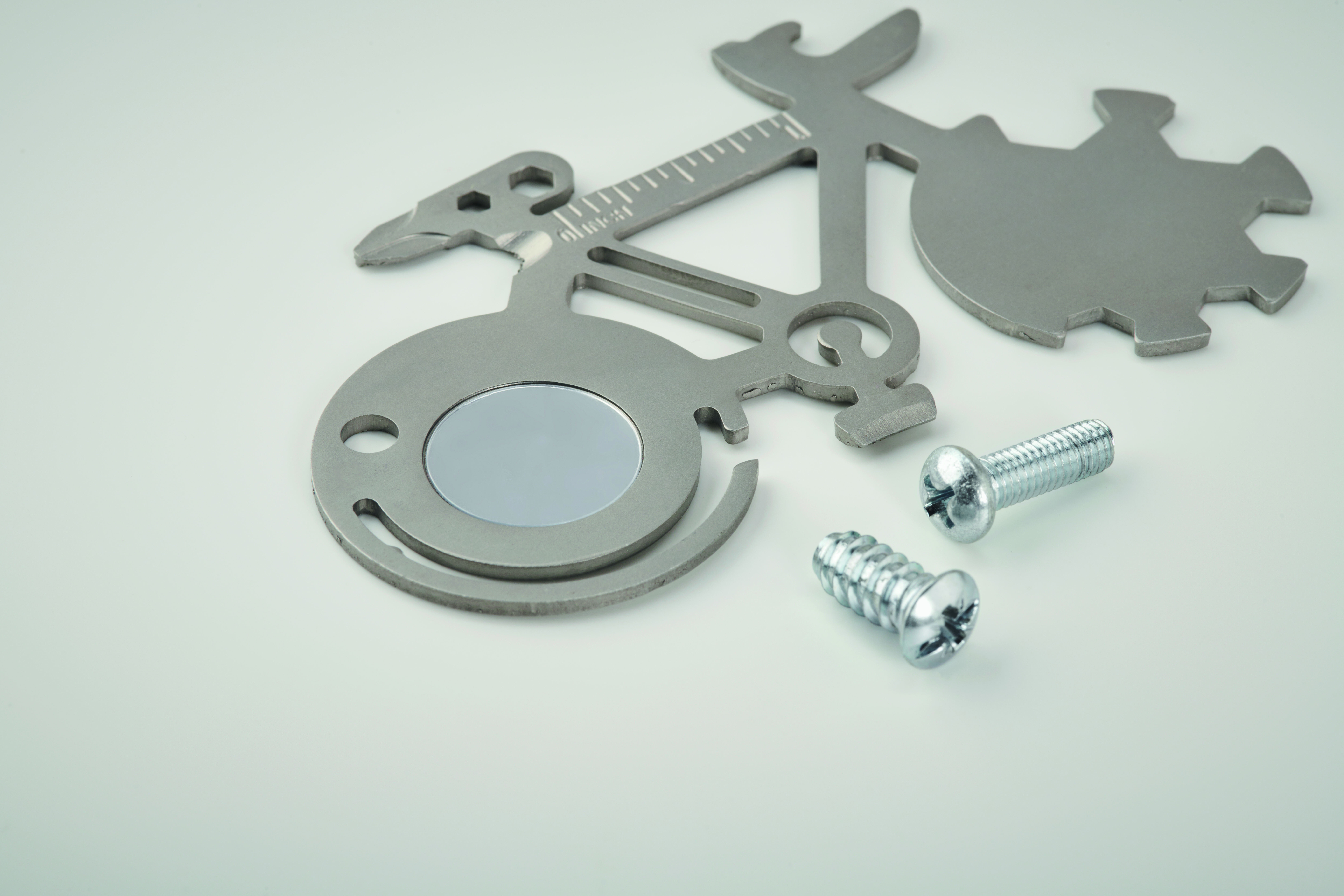 Multi-tool, narzędzie wielofunkcyjne 11 w 1 w kształcie roweru ze stali nierdzewnej. Od otwieracza do butelek, przez nóż, linijkę aż po narzędzia typu śrubokręt krzyżakowy.