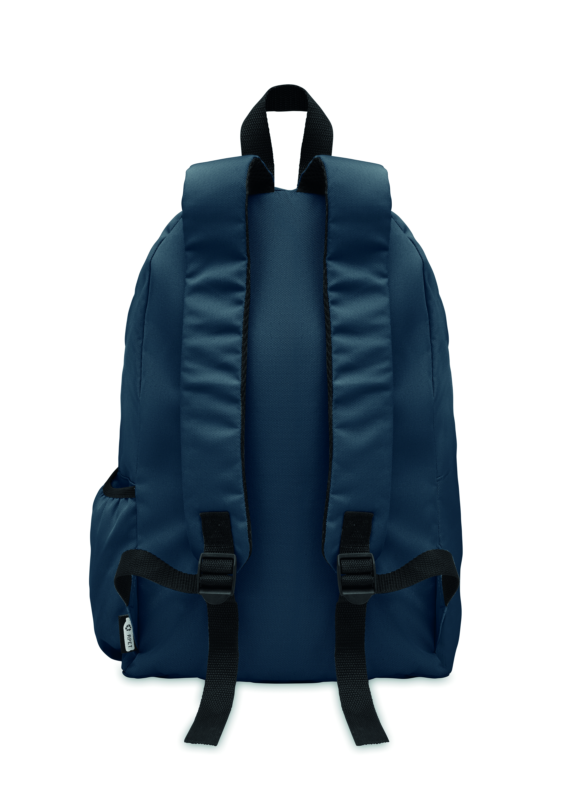 Plecak z poliestru 600D RPET z zewnętrzną kieszenią na zamek. Wyściełany tył i boczna przegródka na butelkę.